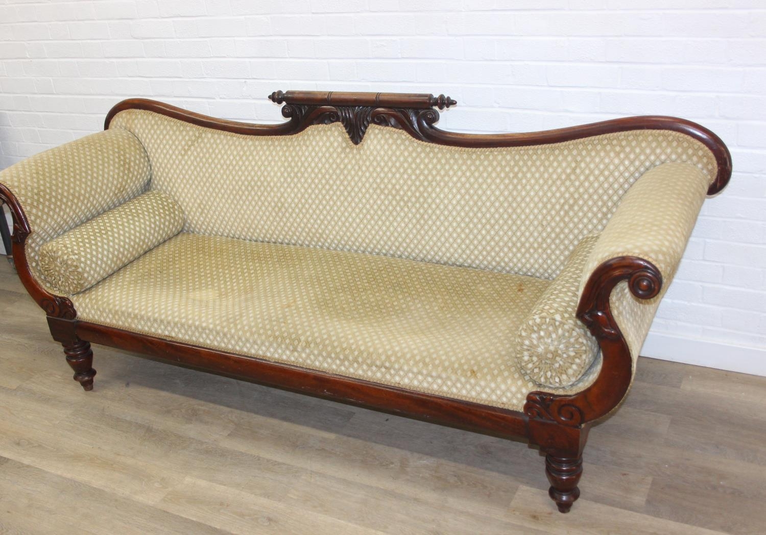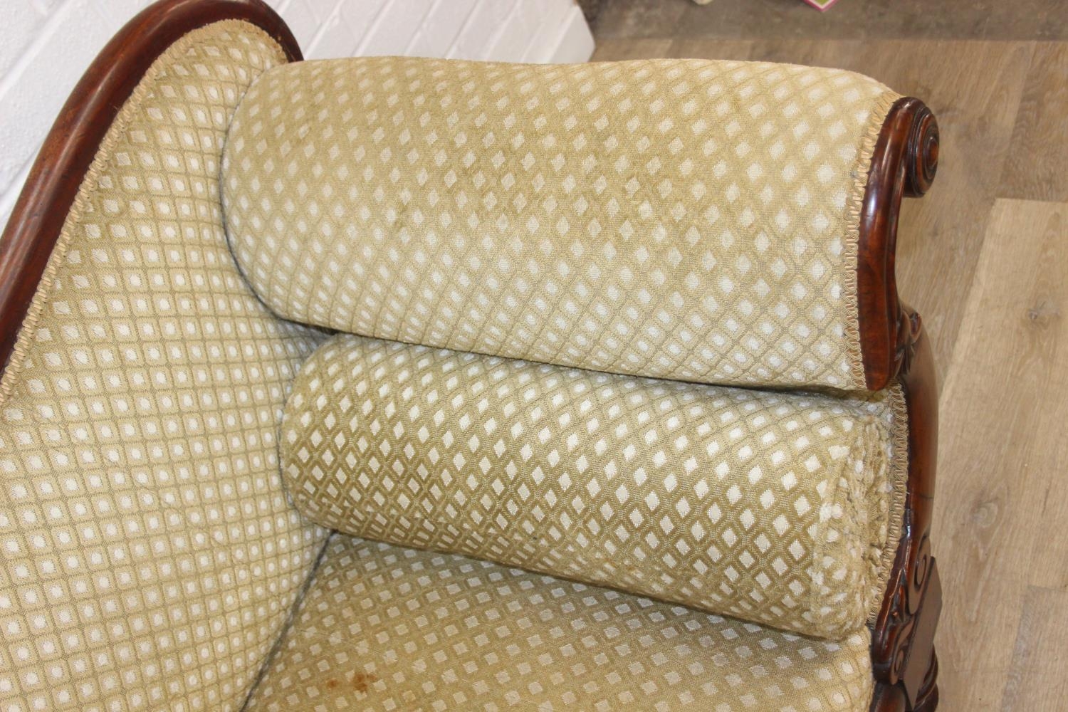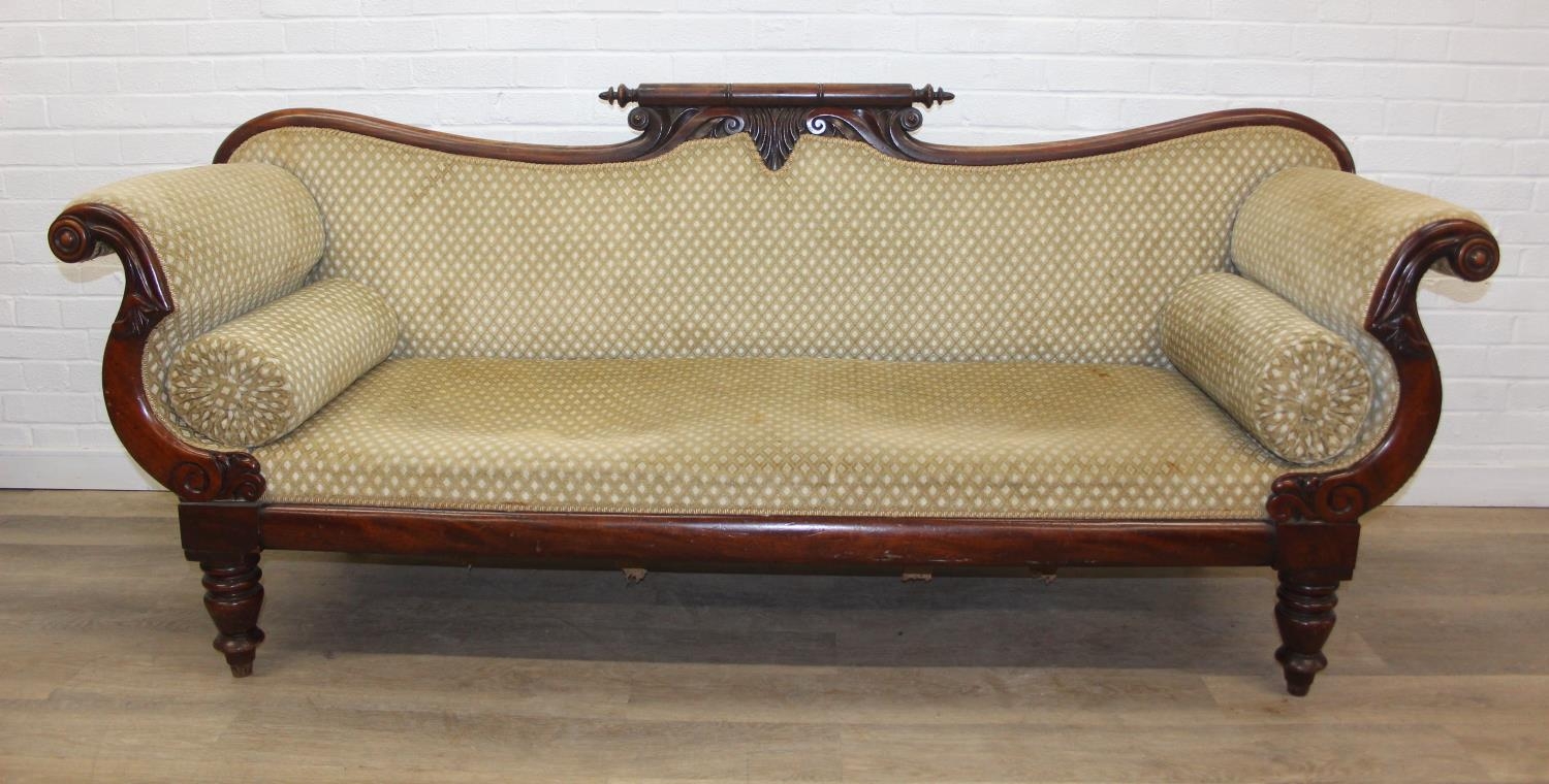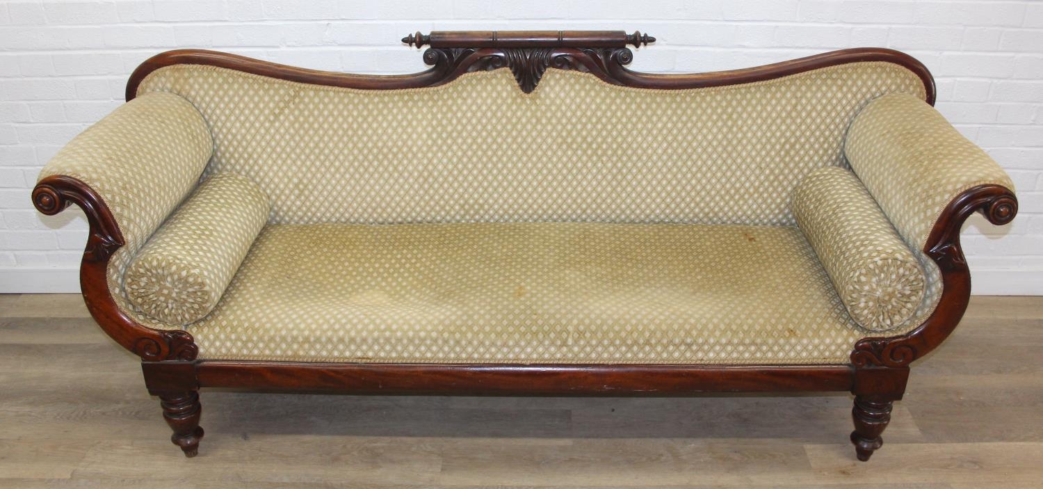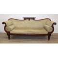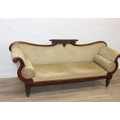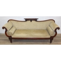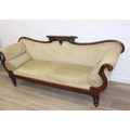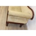 A Victorian roll end sofa or settee with exposed mahogany frame, buff upholstery, 224cm long x 94cm tall