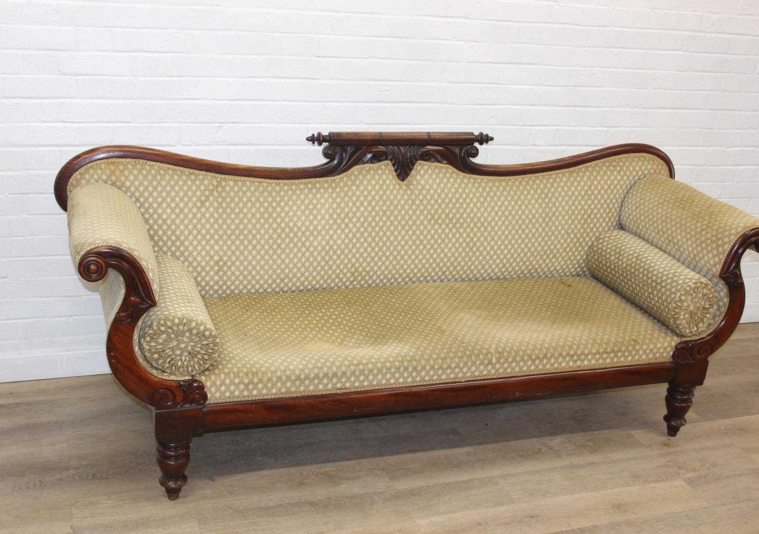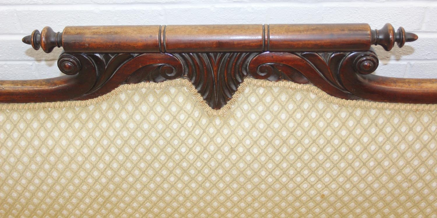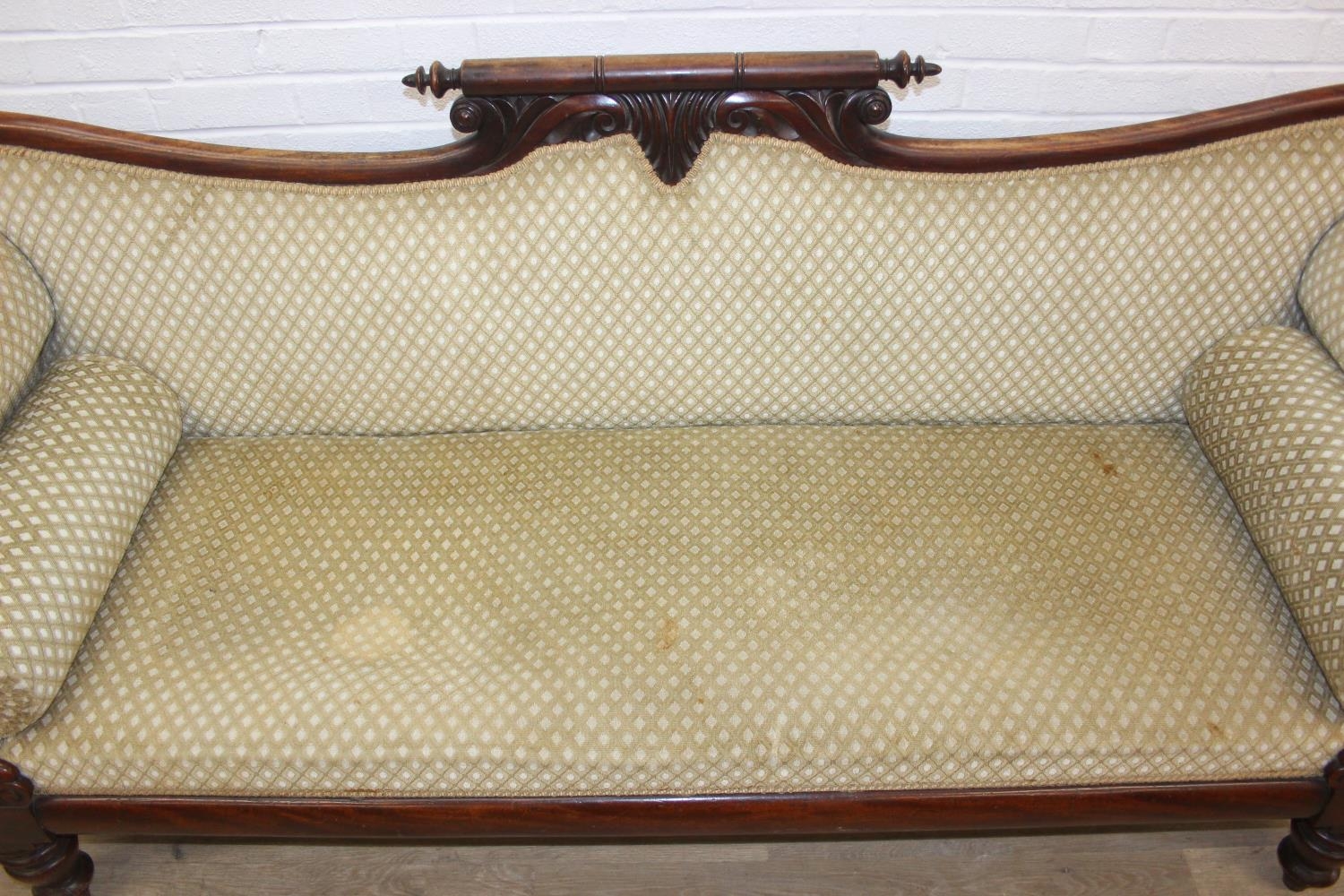 A Victorian roll end sofa or settee with exposed mahogany frame, buff upholstery, 224cm long x 94cm tall