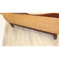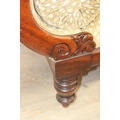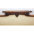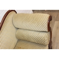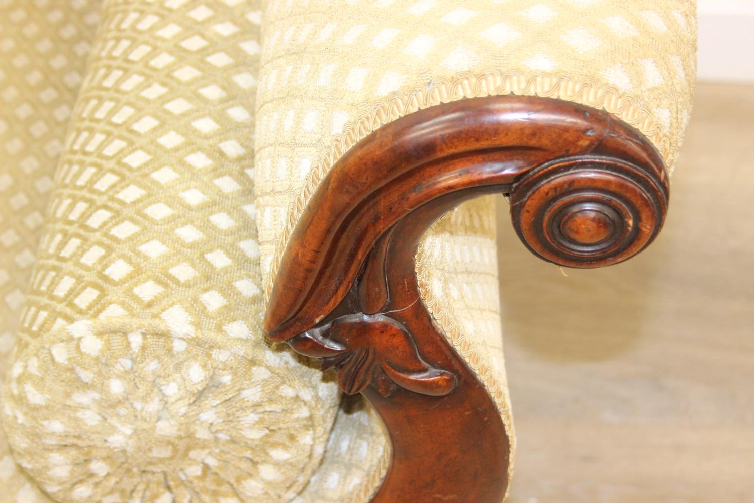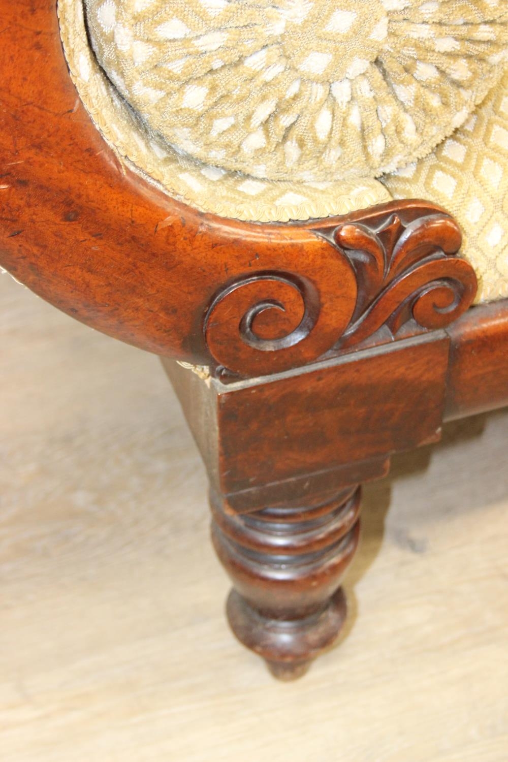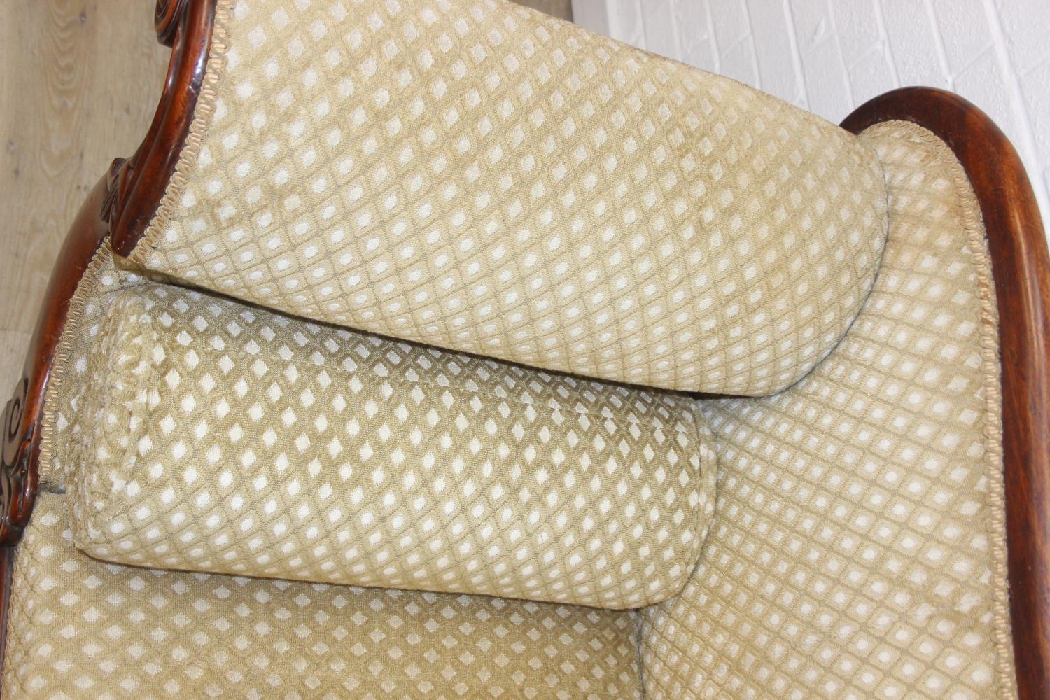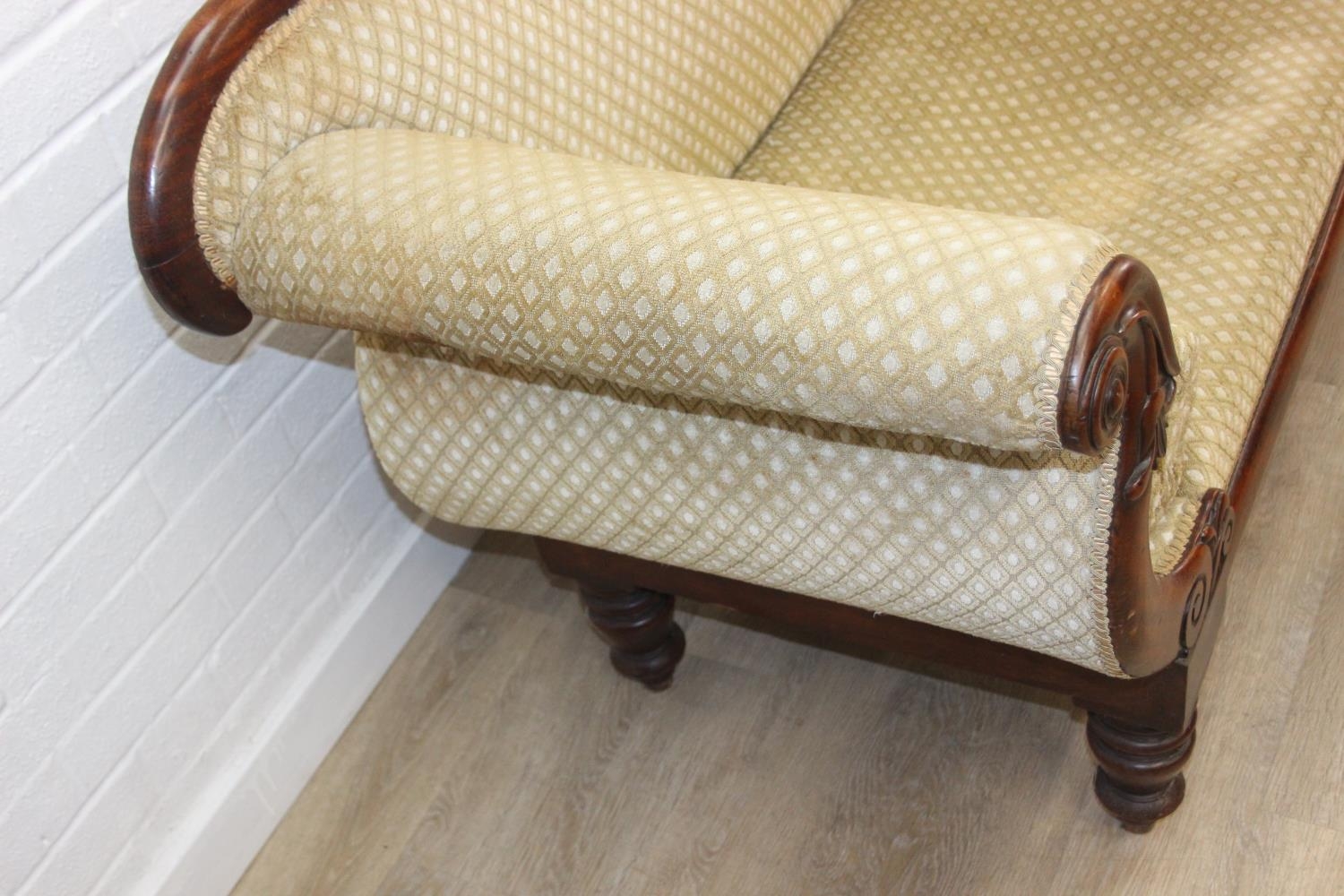 A Victorian roll end sofa or settee with exposed mahogany frame, buff upholstery, 224cm long x 94cm tall