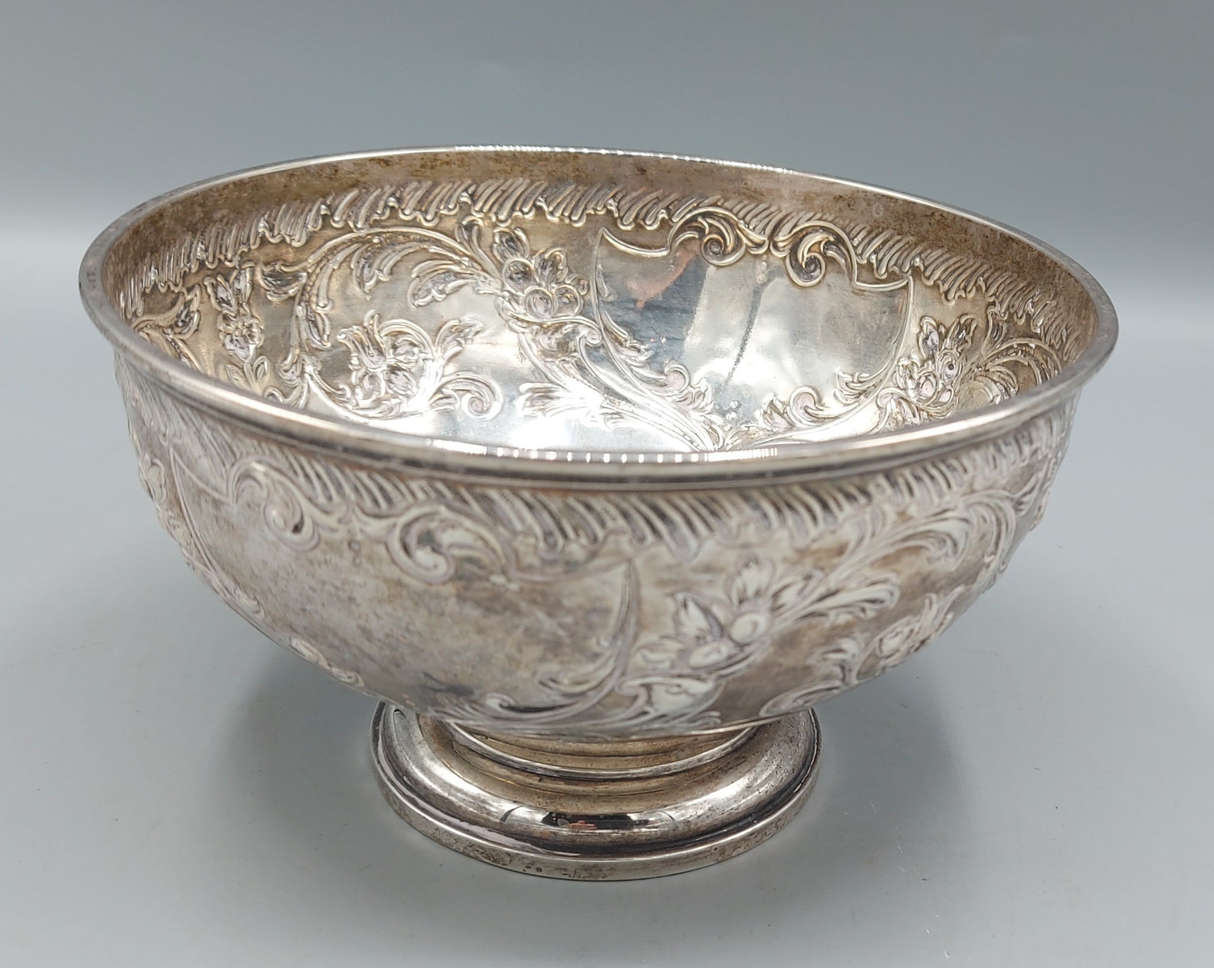 A Victorian silver pedestal bowl with foliate embossed decoration, London 1896, 8ozs, 6.5cms diameter