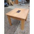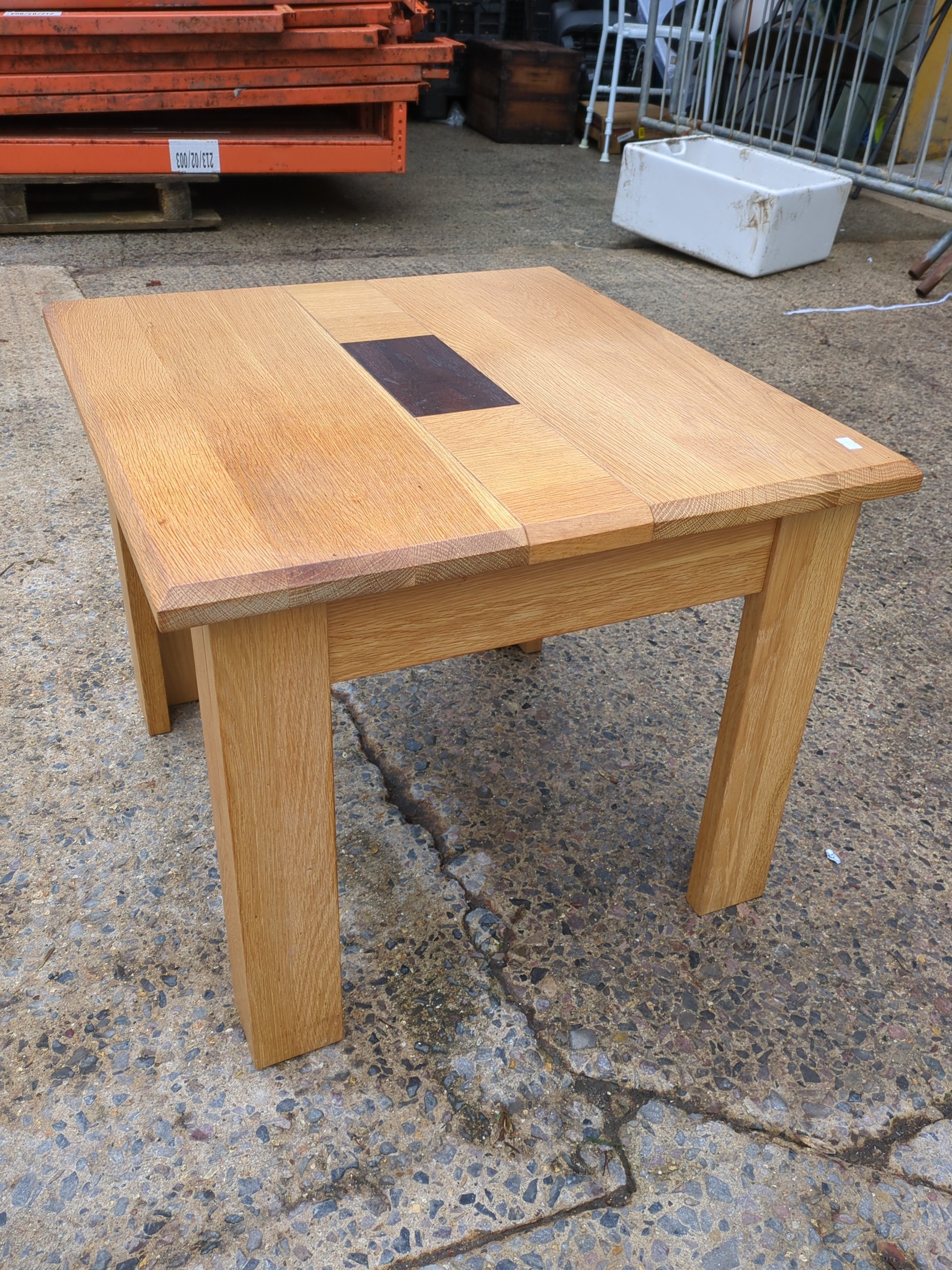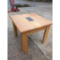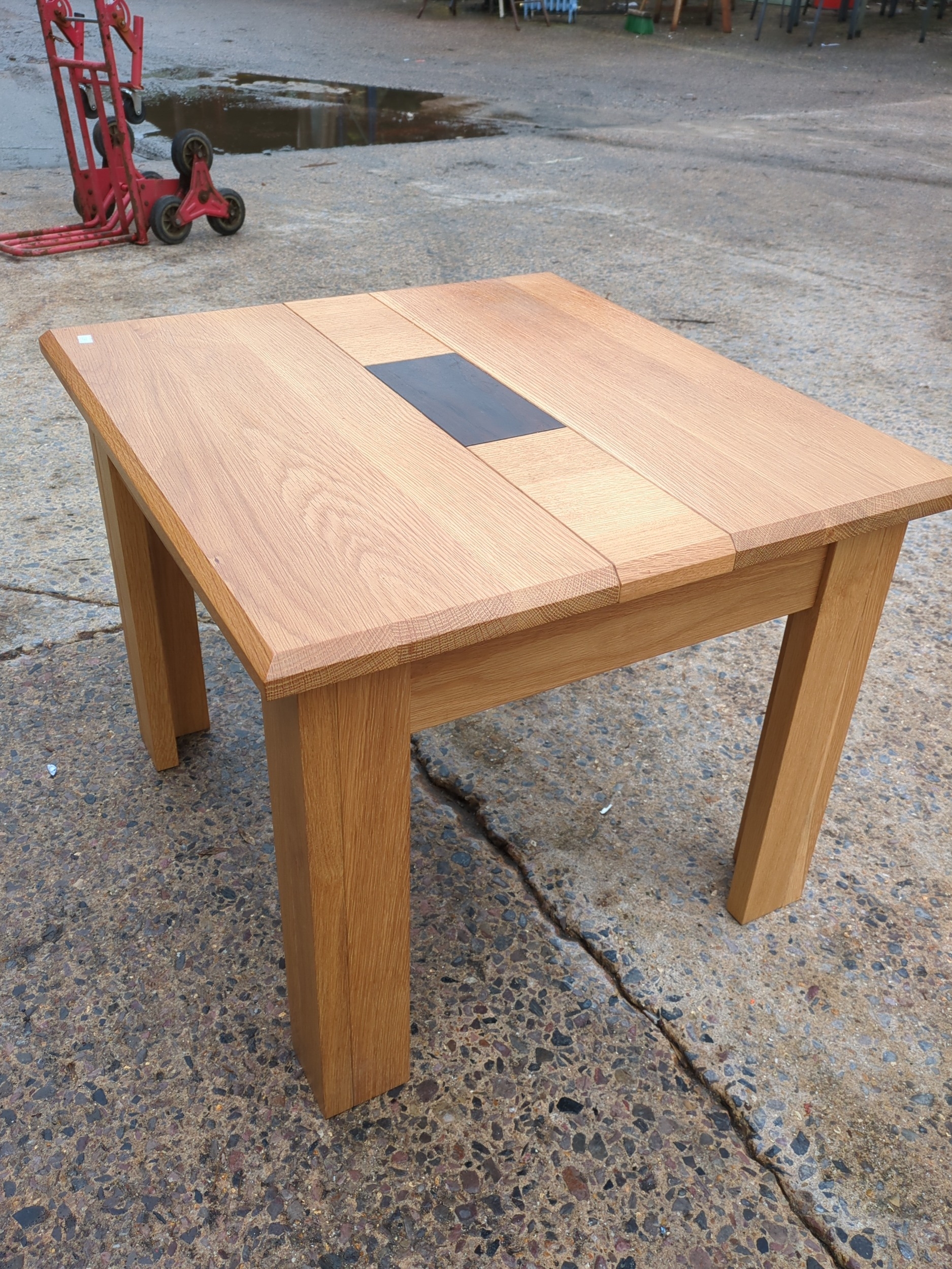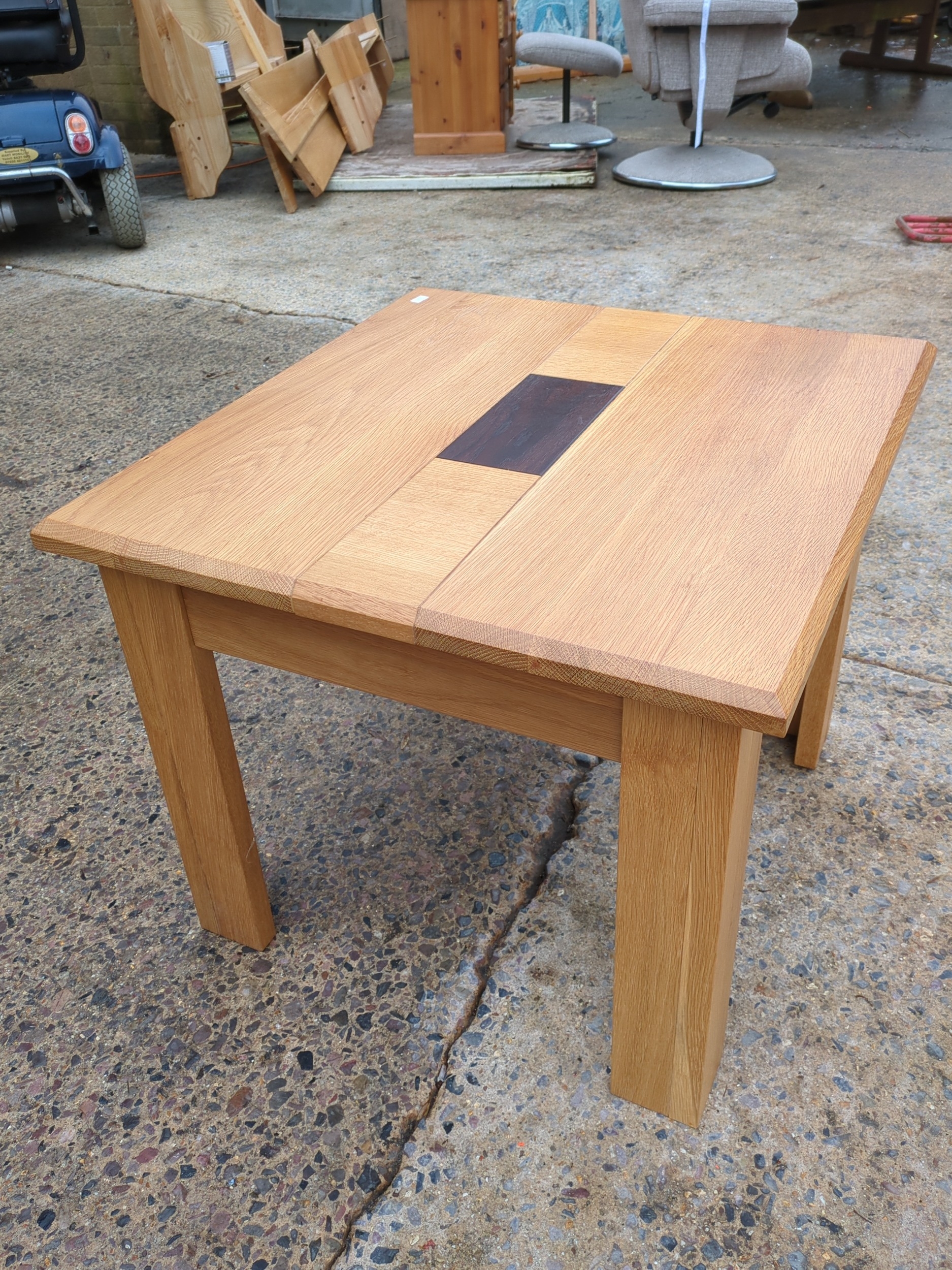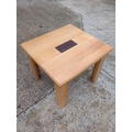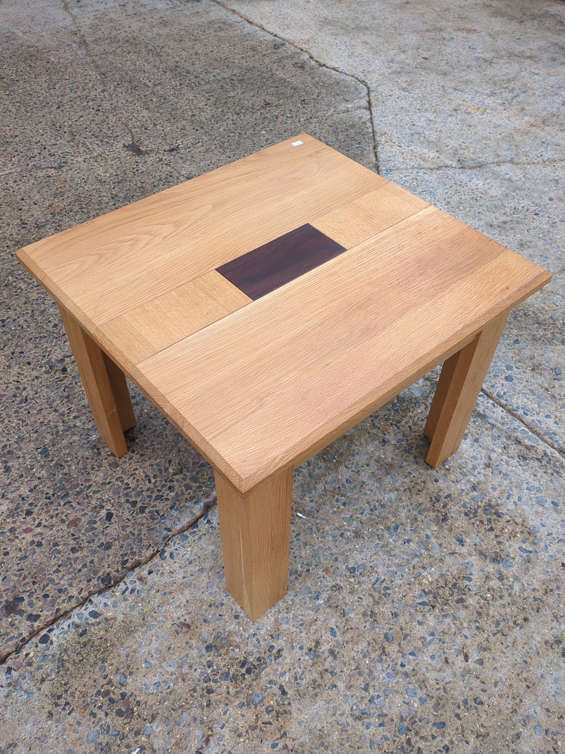 A beautifully crafted oak side table featuring a dark inlay at its center, providing a striking contrast against the natural oak wood. The table is designed with simple, clean lines and a sturdy rectangular top supported by four robust legs. Ideal for a living room or as an accent piece in any space, it offers both functionality and aesthetic appeal.