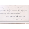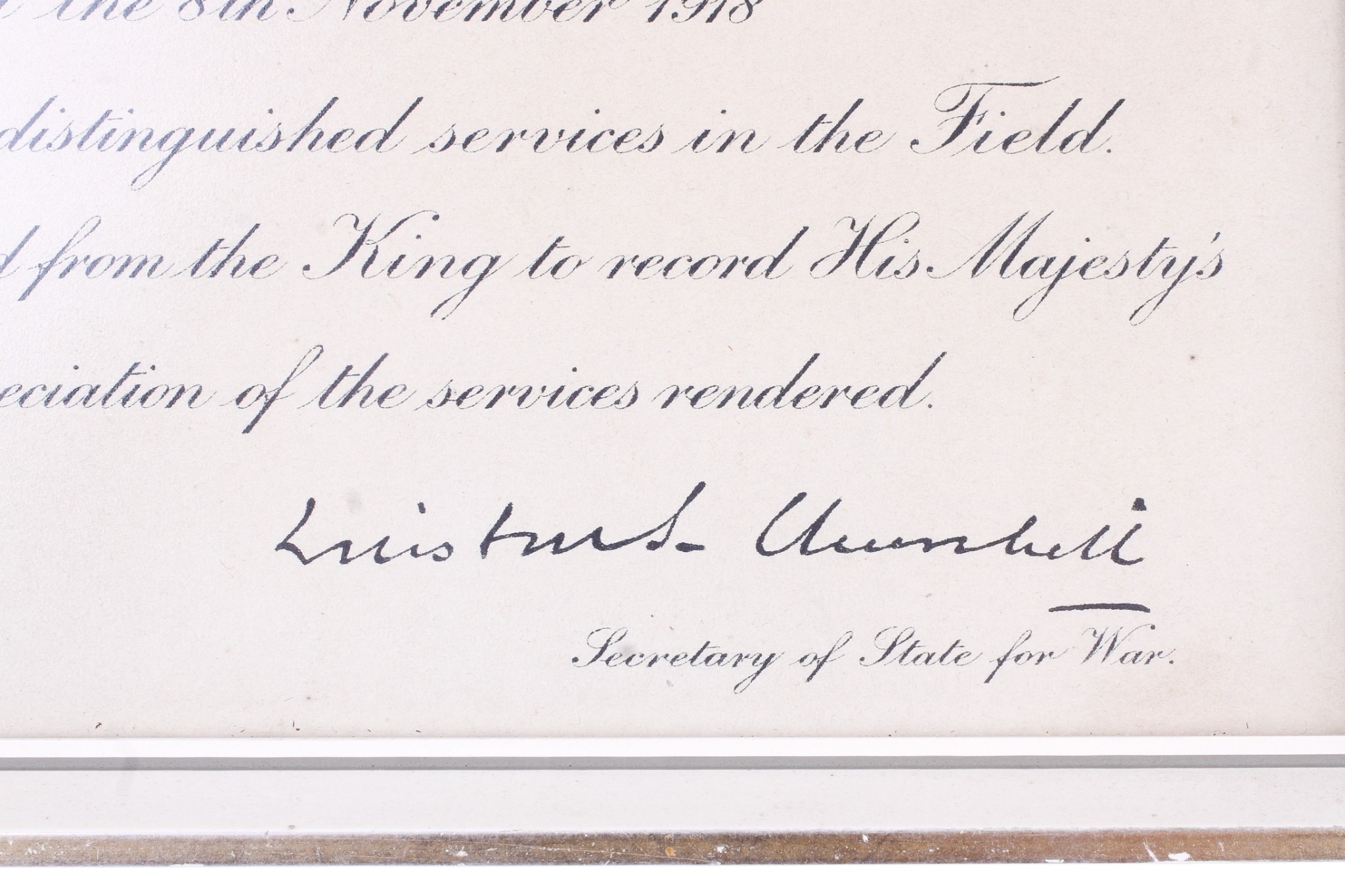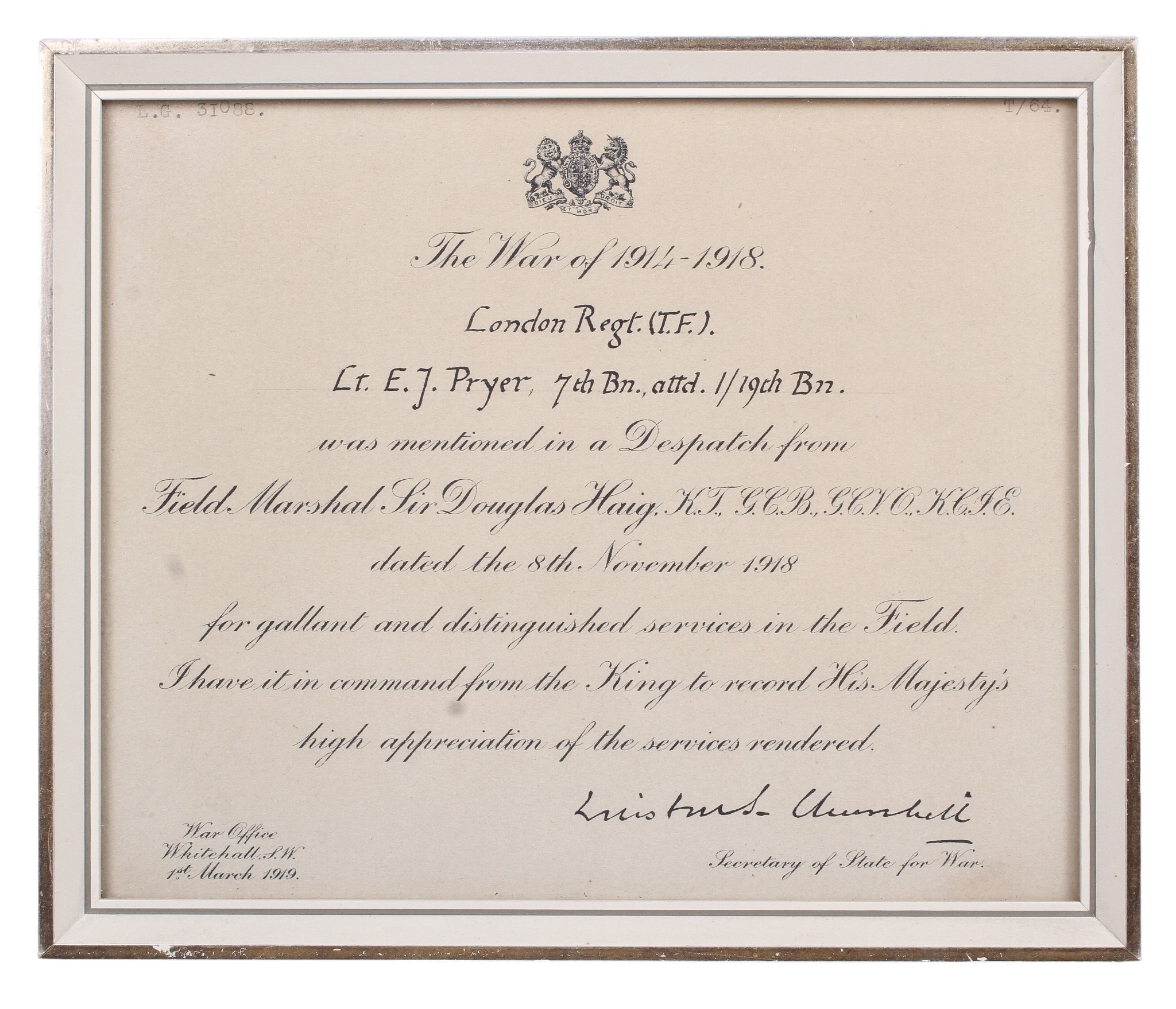Winston Churchill interest - a WWI 'mentioned in Despatch' certificate. Addressed to Lieutenant E.J. Pryer, London Regiment (Territorial Force Reserves). 1/19th Battalion, with facsimile signature of Winston Churchill. 17cm x 20.3cm, framed and glazed, 19.5cm x 23.5cm. (Gazette date 27th Dec 1918, page 15199, duty location France).