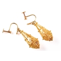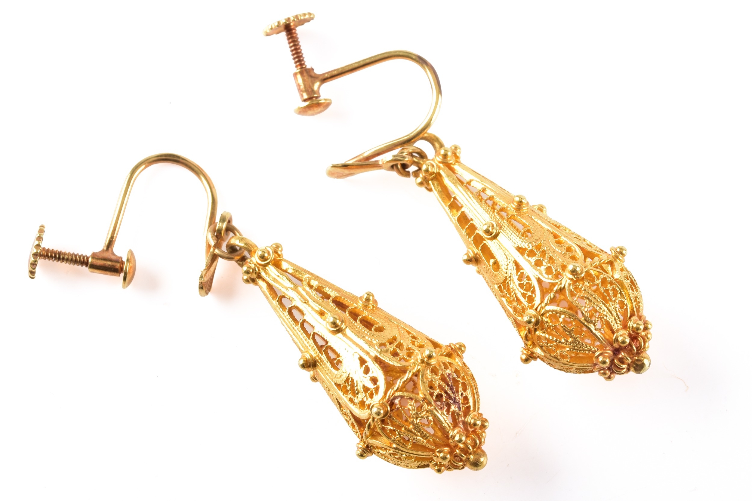 A pair of high carat yellow gold drop earrings, each with a tapering openwork filigree pendant with applied bead decoration, suspended from screw-back fittings, approximately 3.6 cm long.