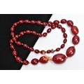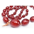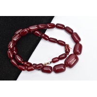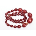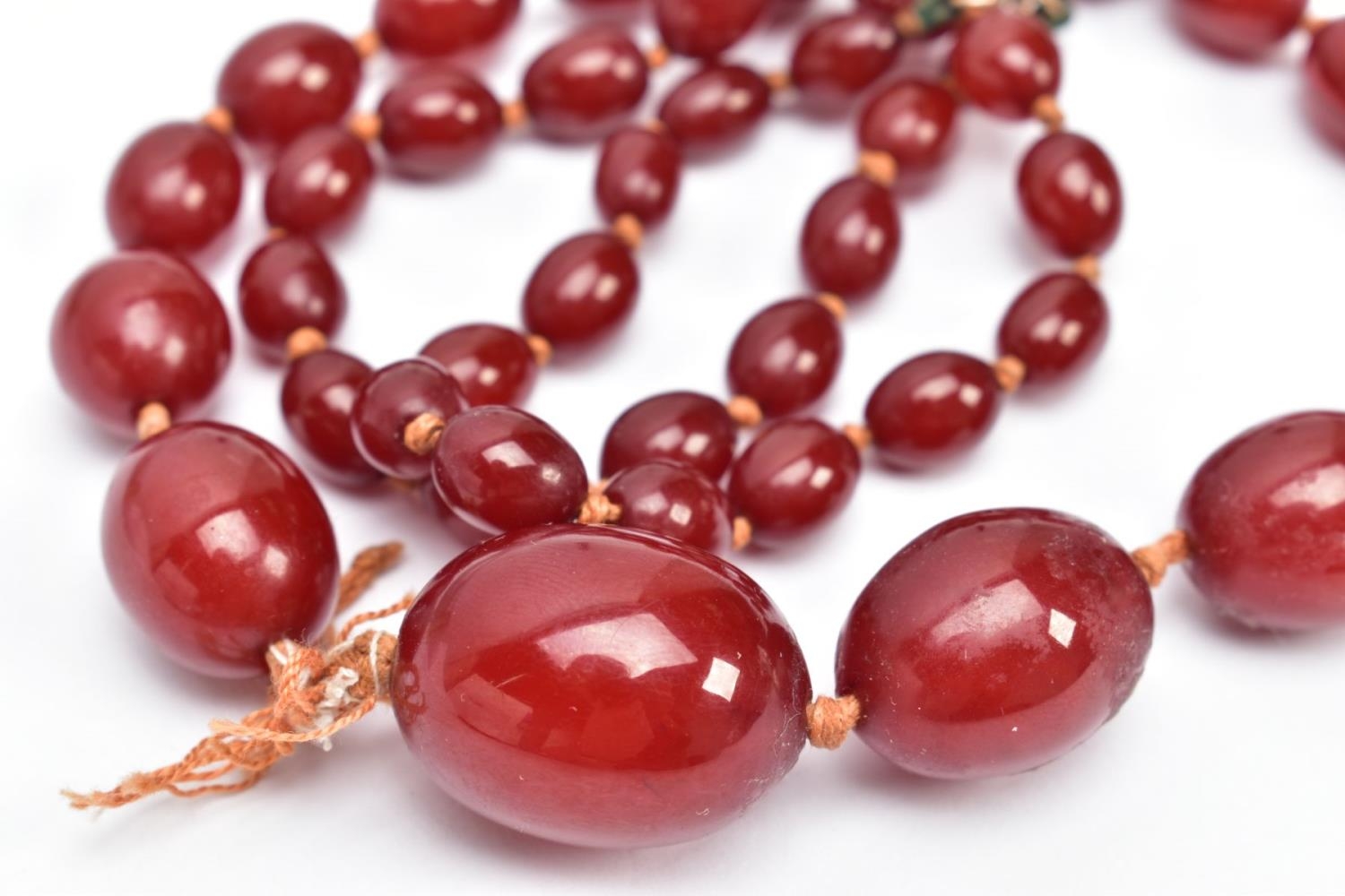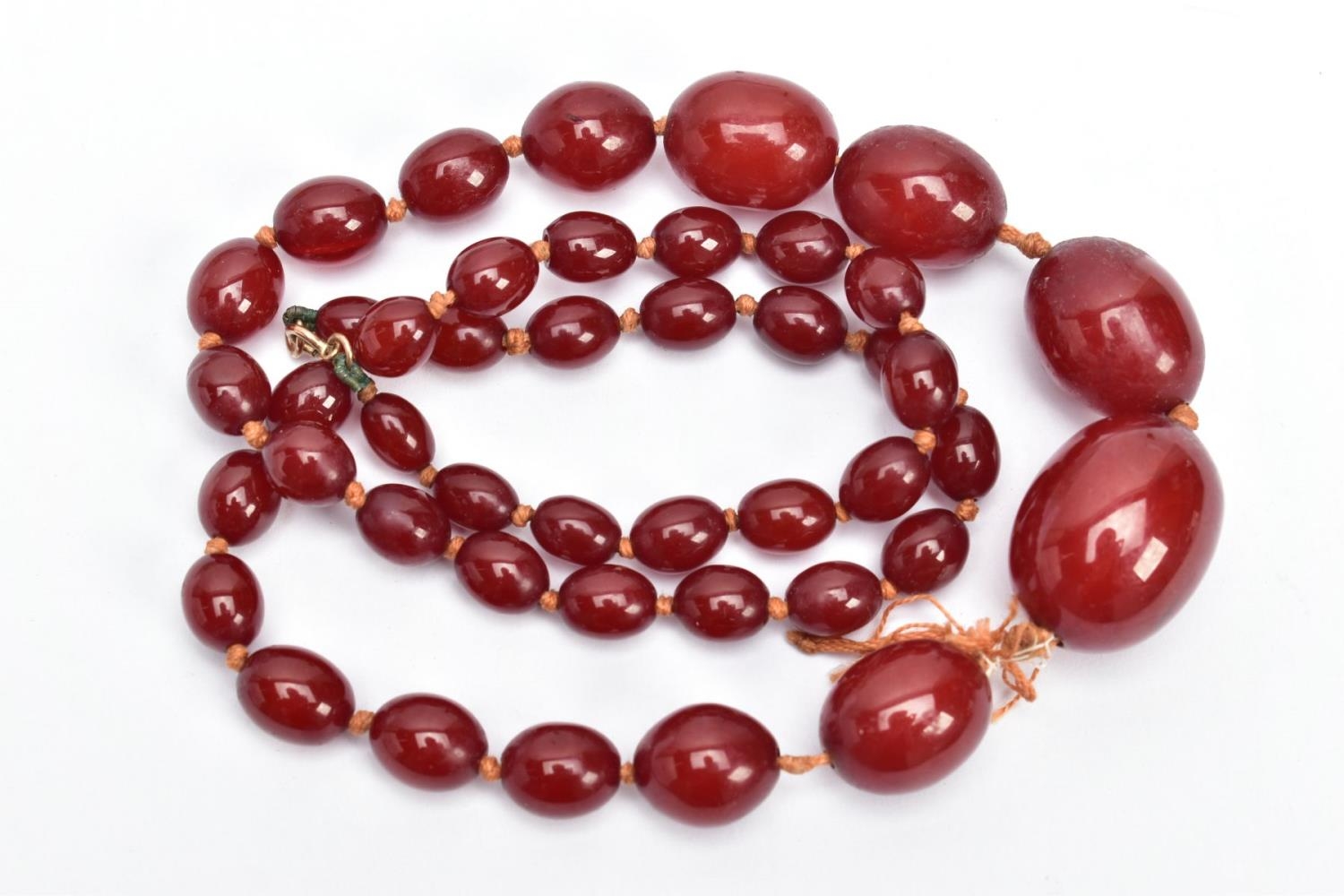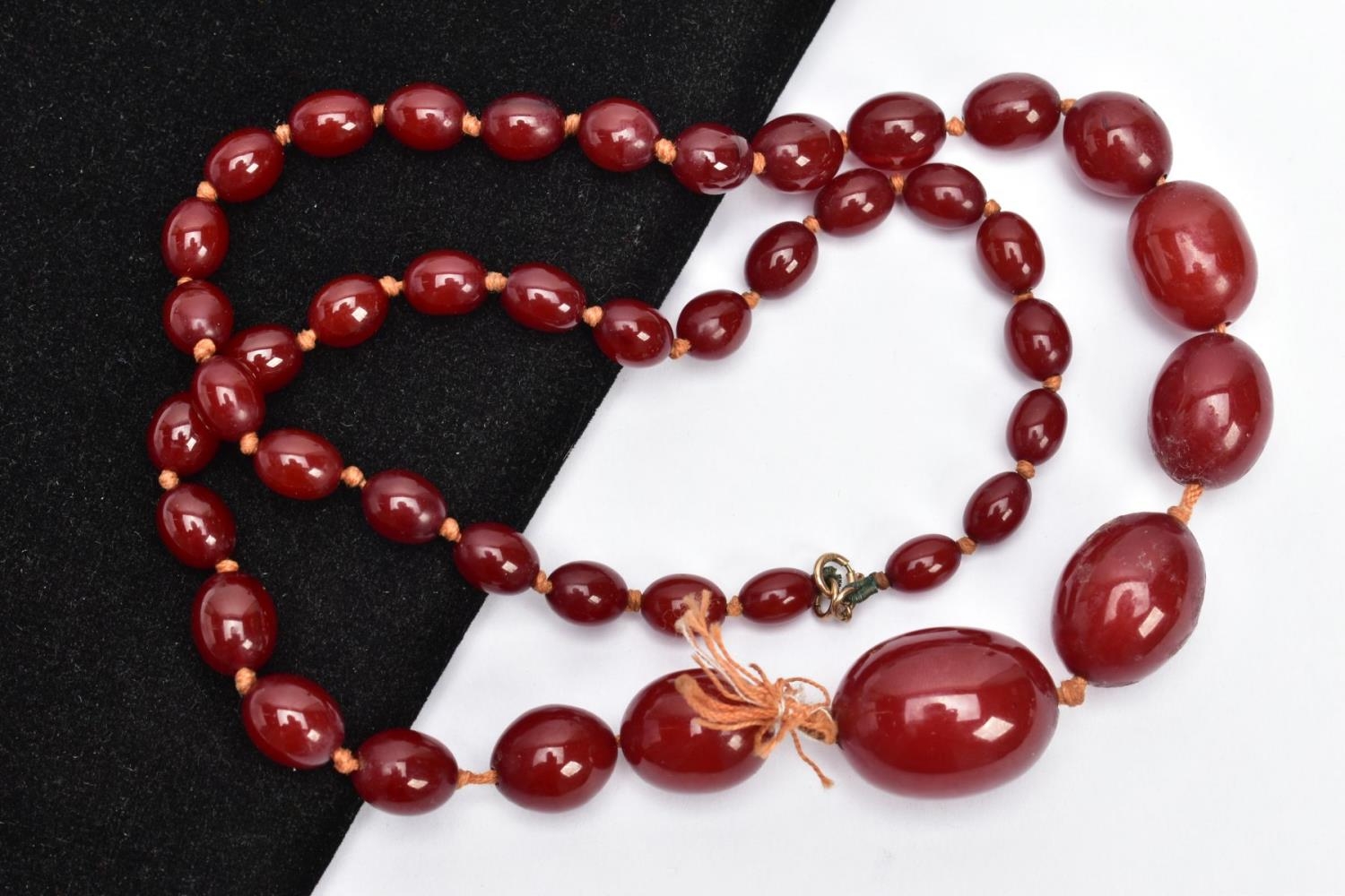 A CHERRY AMBER BAKELITE BEAD NECKLACE, graduated oval beads, largest measuring 25.4mm x 19.4mm, smallest measuring 8.8mm x 6.4mm, individually knotted onto an orange cord (cord in need of some attention) fitted with a yellow metal spring clasp stamped '9k', length 610mm, approximate gross weight 37.2 grams (condition report: the cord has some damage possibly needs to be re-strung, clasp in working condition, would benefit from a gentle clean, swirls can be seen when held under a light source)