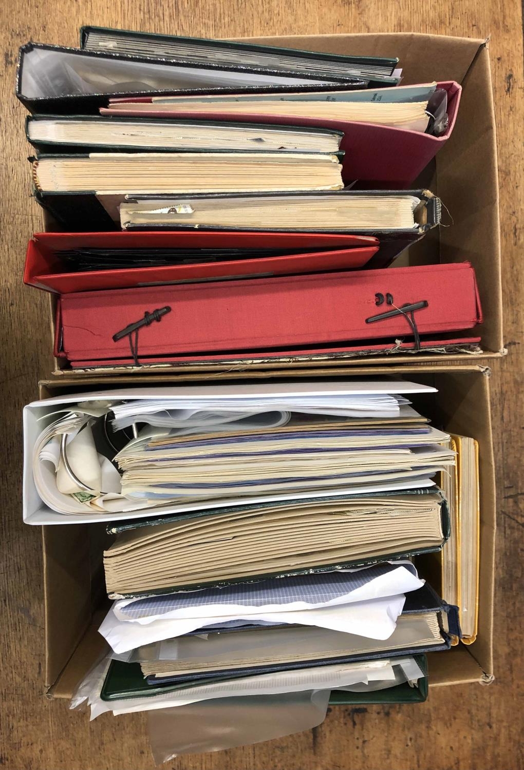 TWO CARTONS housing a qty. of binders & stock books with duplicated collections of mainly modern Worldwide used issues. Mostly commoner, lower denomination types with strength in Ireland, Greece, Spain & Hong Kong. Also of note is a special, large (but damaged) presentation box housing a Peoples Republic of China 2006 Yearbook complete with a recording device in the form of a pen, complete with cables, CD & instructions. Not checked for working order, but does not appear to have been used! Viewing recommended. (Many 1,000s)Cross Reference: CHINA