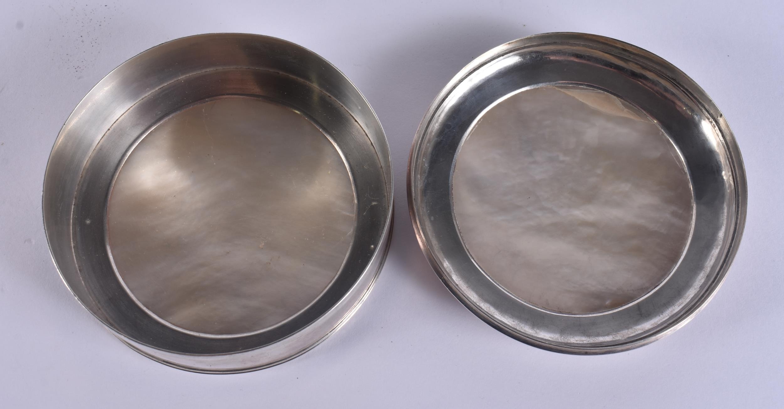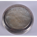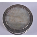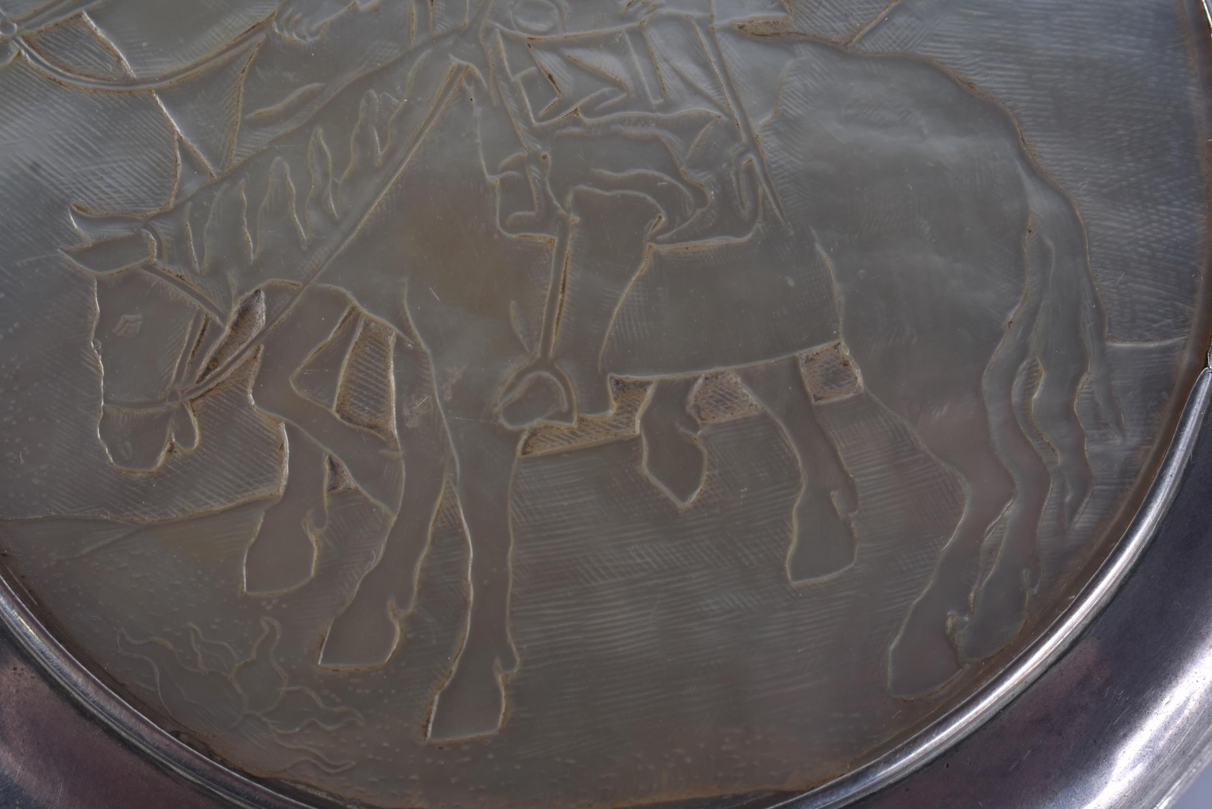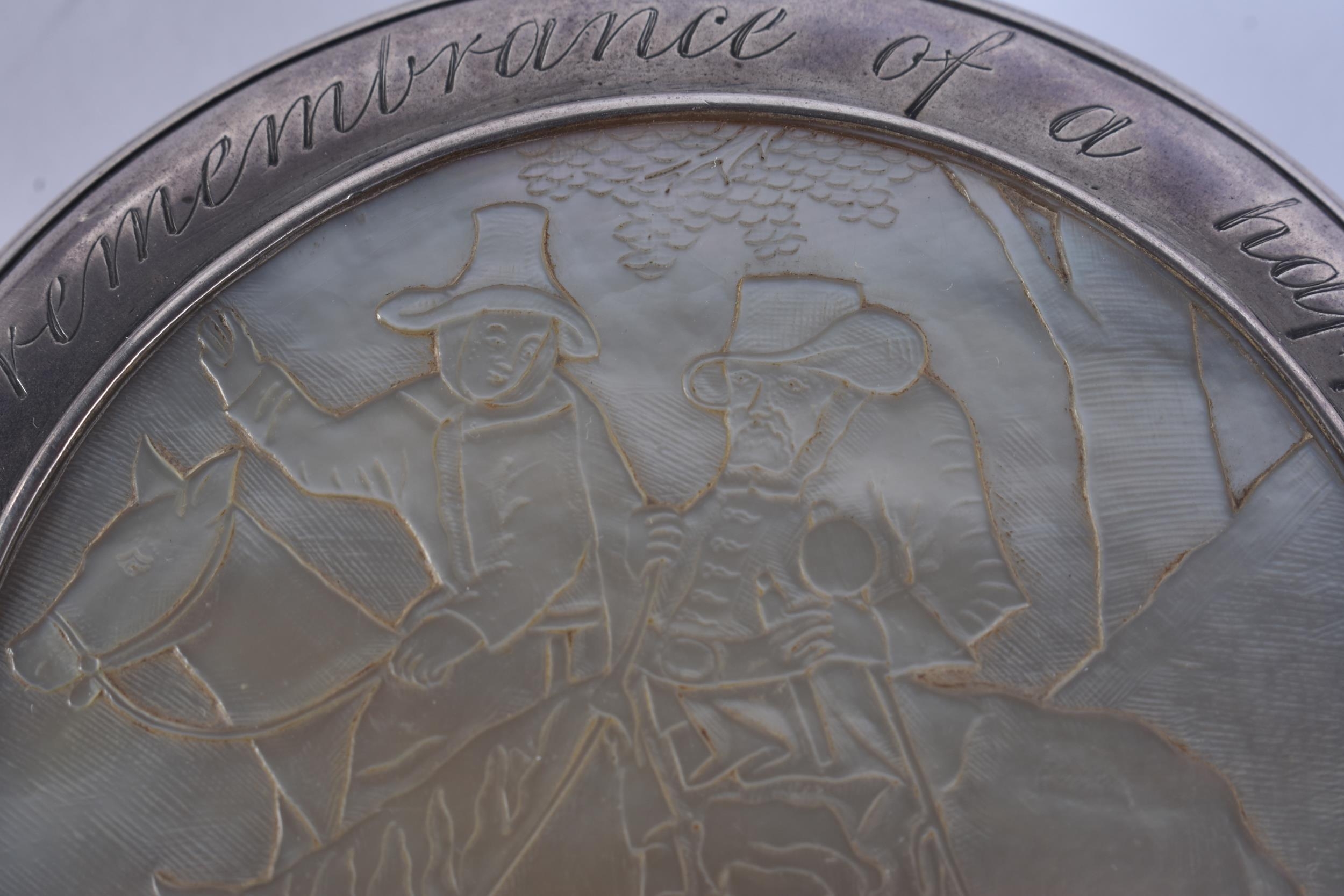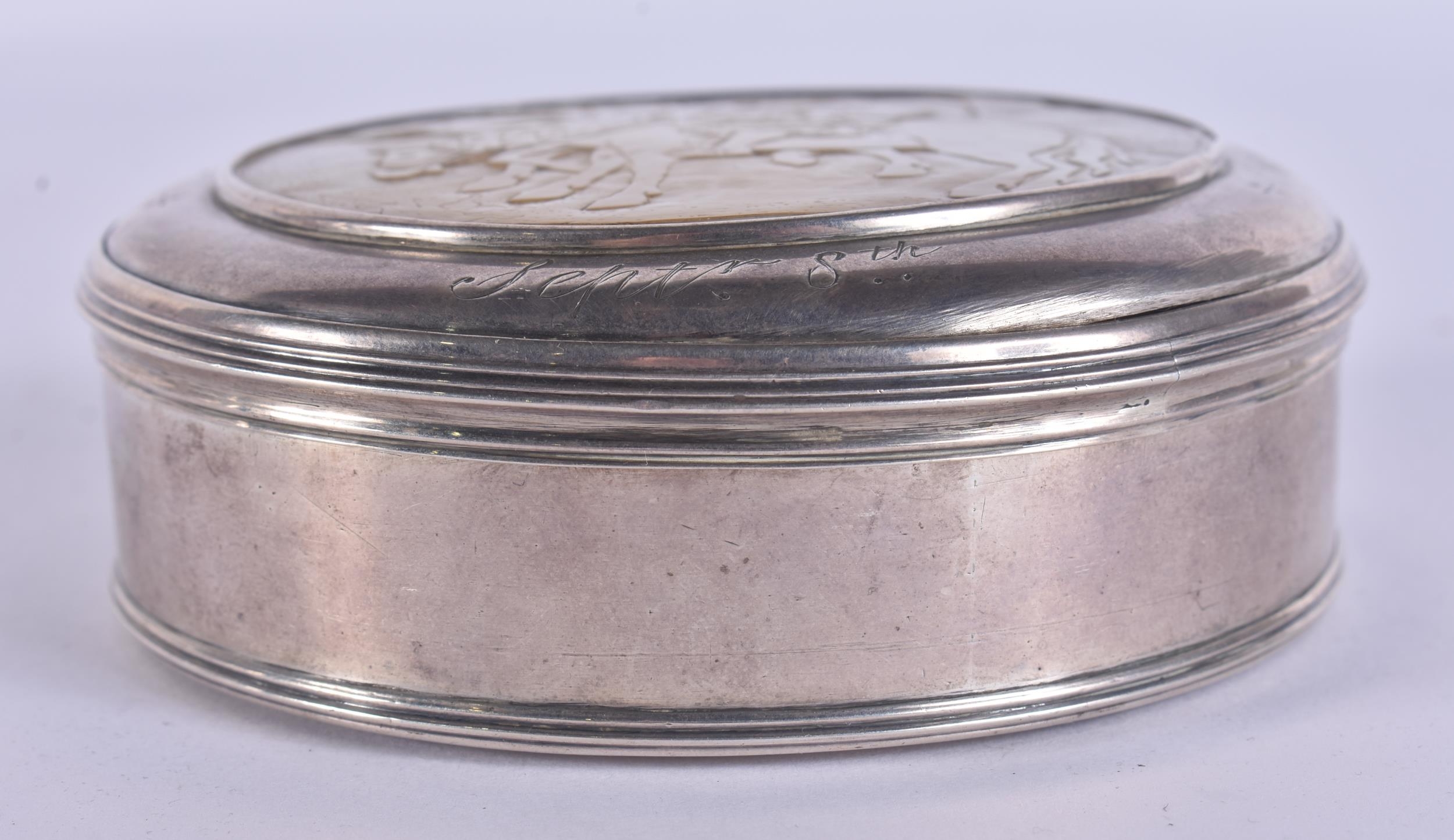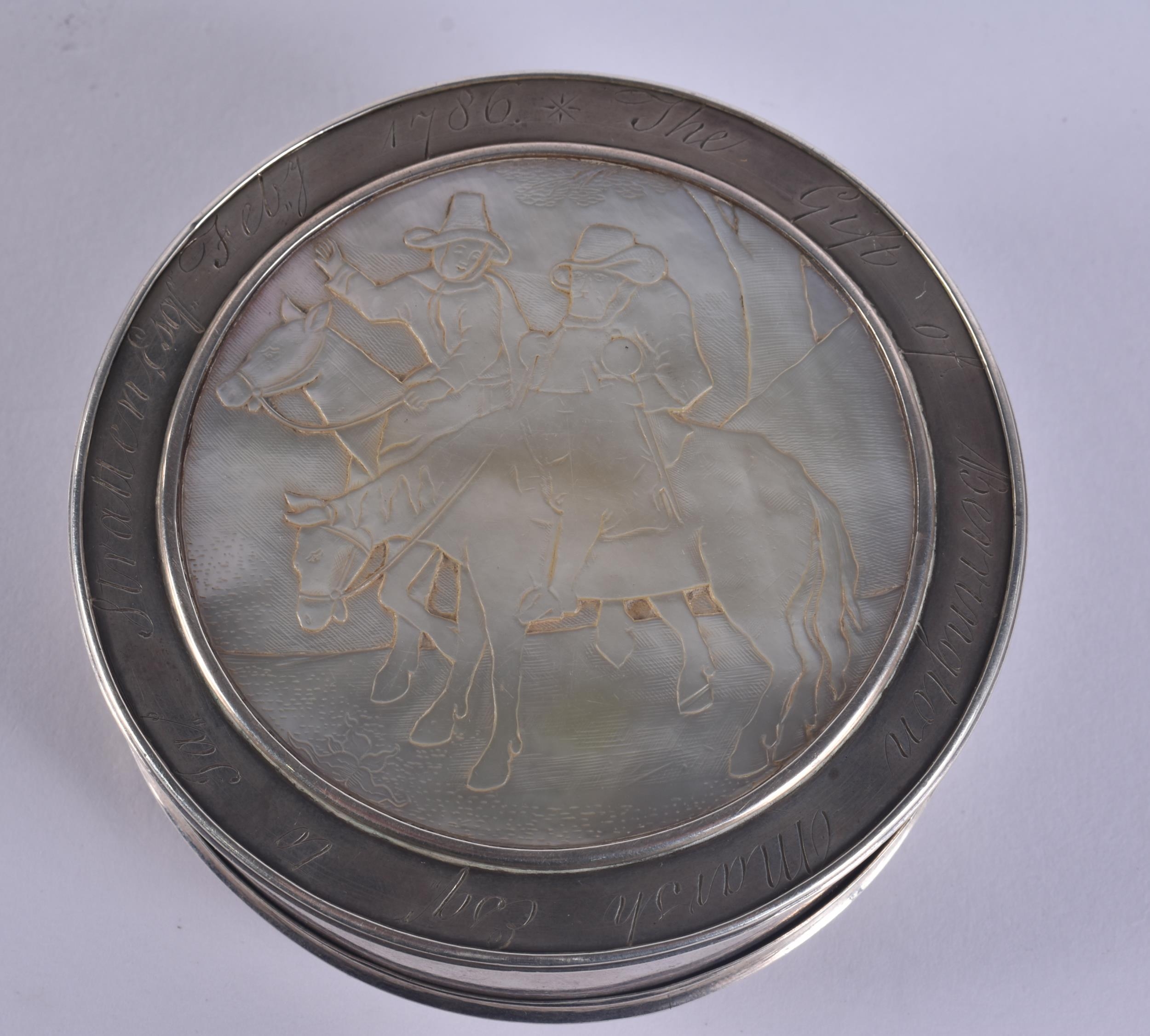 AN 18TH CENTURY CONTINENTAL SILVER AND MOTHER OF PEARL SNUFF BOX AND COVER decorated with figures on horseback. 163 grams. 10 cm wide.