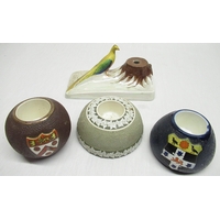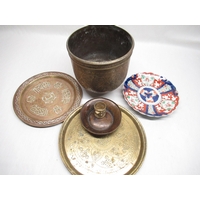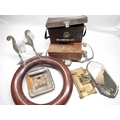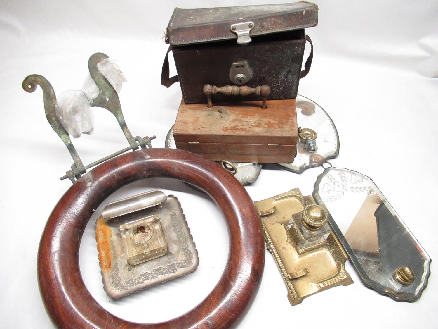 Early C20th mahogany circular toilet seat, two wall mirrors with etched decoration, two early C20th pen stands complete with ink wells, other items of interest