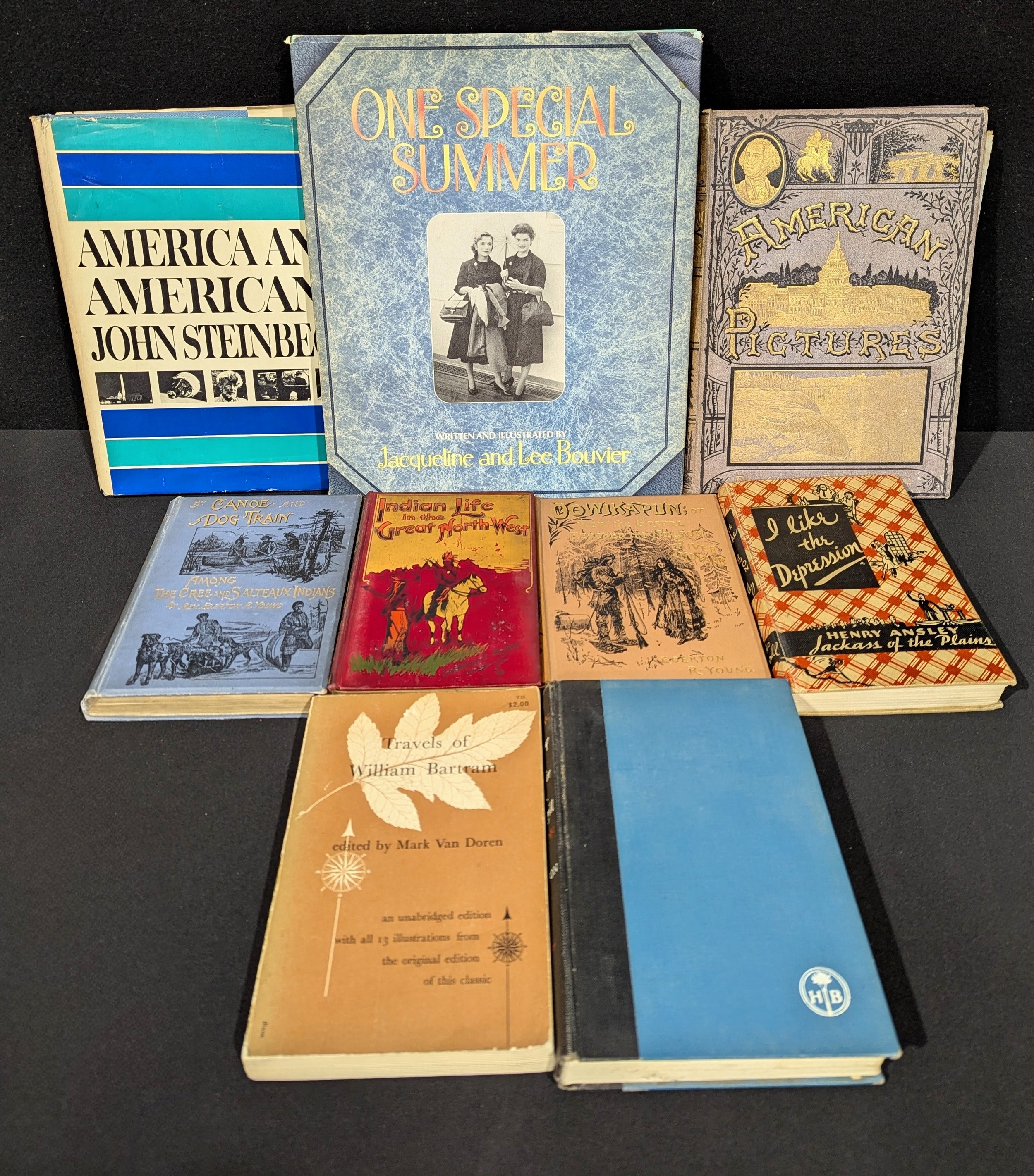 Books – American interest: Bouvier (Jacqueline Kennedy, Mrs. Aristotle Onassis, 1929-1994) & Caroline Lee, HSH Princess Stanislaw Albrecht Radziwiłł, 1933-2019), One Special Summer, 1st edn., New York, Delacorte Press, 1974, small folio, unpaginated, illus. in colour, bound blue boards, d. w.; Manning (Revd. Samuel, LLD), America in Pictures Draw with Pen and Pencil, London, Religious Tract Society, n. d. 4to, 224pp, many engravings, binder’s label ins. rear pastedown Straker & Sons, Farringdon Street (London), brown endpapers, gilt edges (slight foxing to titles), black & gilt embossed mauve boards, gilt titles to spine; Steinbeck (John Ernst, 1902-1968), America and the Americans, 1st edn., London, Heinemann, 1966, 4to, 207pp, colour and monochrome illus., map to endpapers, bound blue boards (damp stained) d. w.; Young (Egerton Ryerson, 1840-1909), Indian Life in the Great North West, London, S W Partridge, n. d., 12mo, 126 + 32pp, 9 illus., bound gilt and black to red boards, gilt titles and to spine; Young (Egerton Ryerson, 1840-1909), Oowikapun or How the Gospel Reached to Nelson River Indians, London, Charles H. Kelly, 1895, small 8vo, 162pp, engr. Frontis after H. Rhodes and 17 other illus., bound black illustrated gilt titles to brown boards, similar to spine; Young (Egerton Ryerson 1840-1909), By Canoe and Dog Train Amongst the Cree and Salteaux Indians, London, Charles H. Kelly, 1895, 8vo, 267pp, frontis portrait of author facsimile signature, numerous illus., bound black and white illustrated boards, gilt titles and to spine; Ansley (Henry, ‘Jackass of the Plains’), I Like the Depression, 1st edn., Indianapolis, Bobbs-Merrill, 1932, 8vo, 128pp, bound black and red patterned buff boards; Jameson (Margaret Ethel Storm, 1891-1986), A Cup of Tea for Mr. Thorgill, 1st edn., New York, Harper Bros., 1957, 8vo, 273pp, bound black cloth over blue boards, white titles to spine; Bartram (William, 1739-1823), ed. Mark van Doren, The Travels of William Bartram, 1st edn., New York, Dover, 1978, 8vo, 414pp, 13 illus., p. b. (9)