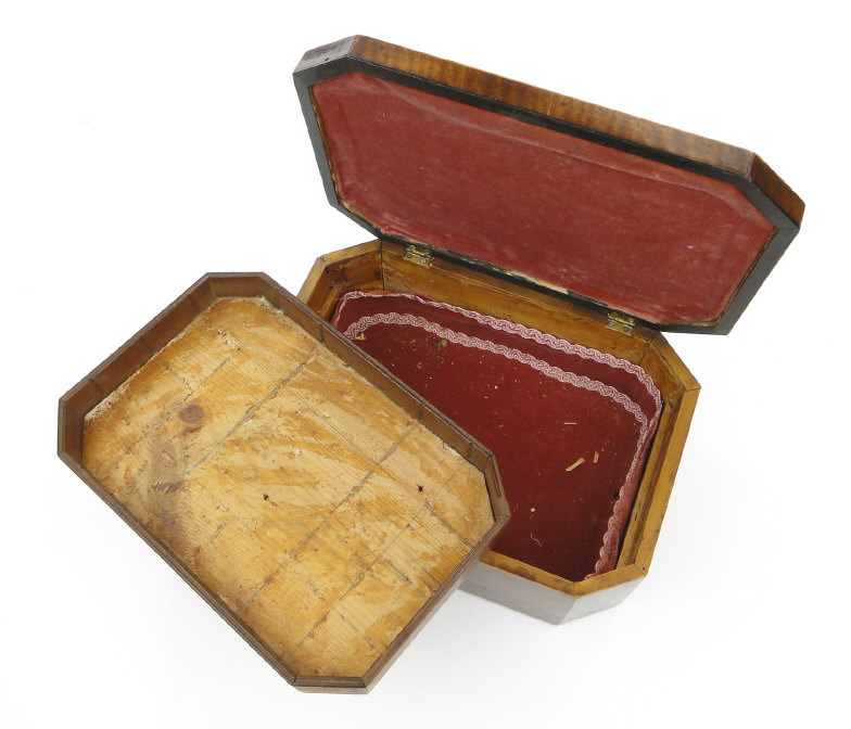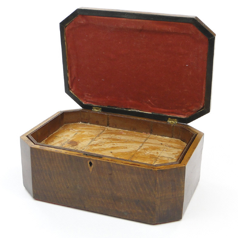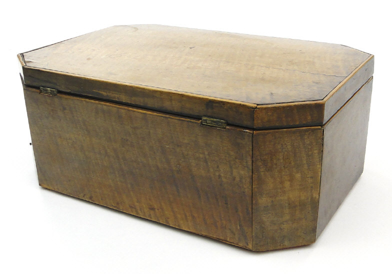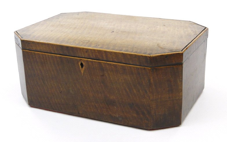Regency rectangular mahogany workbox with canted corners and lift out tray to the interior, 34cm in length
