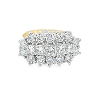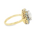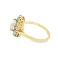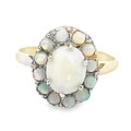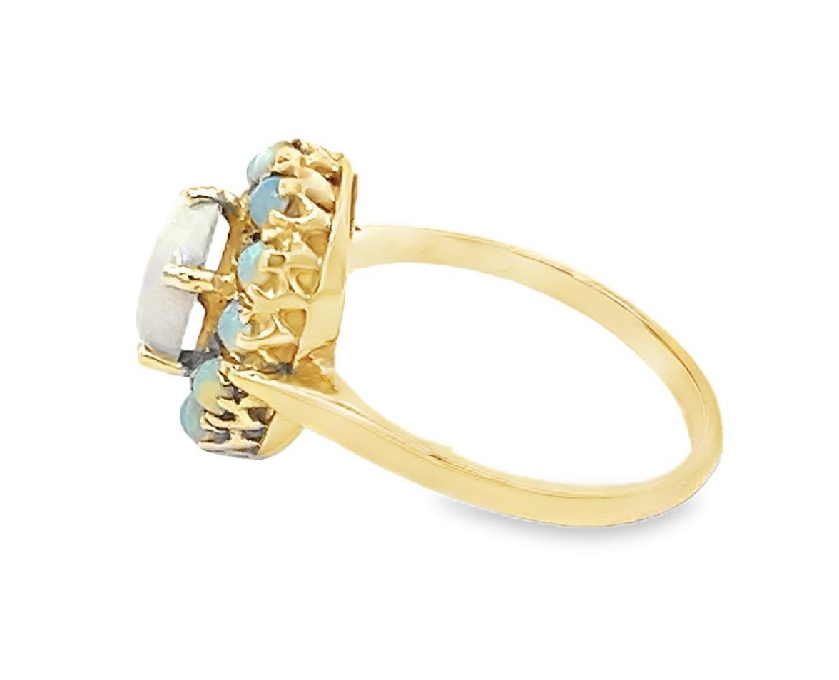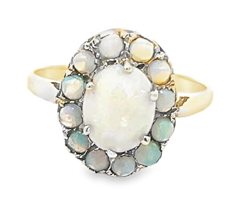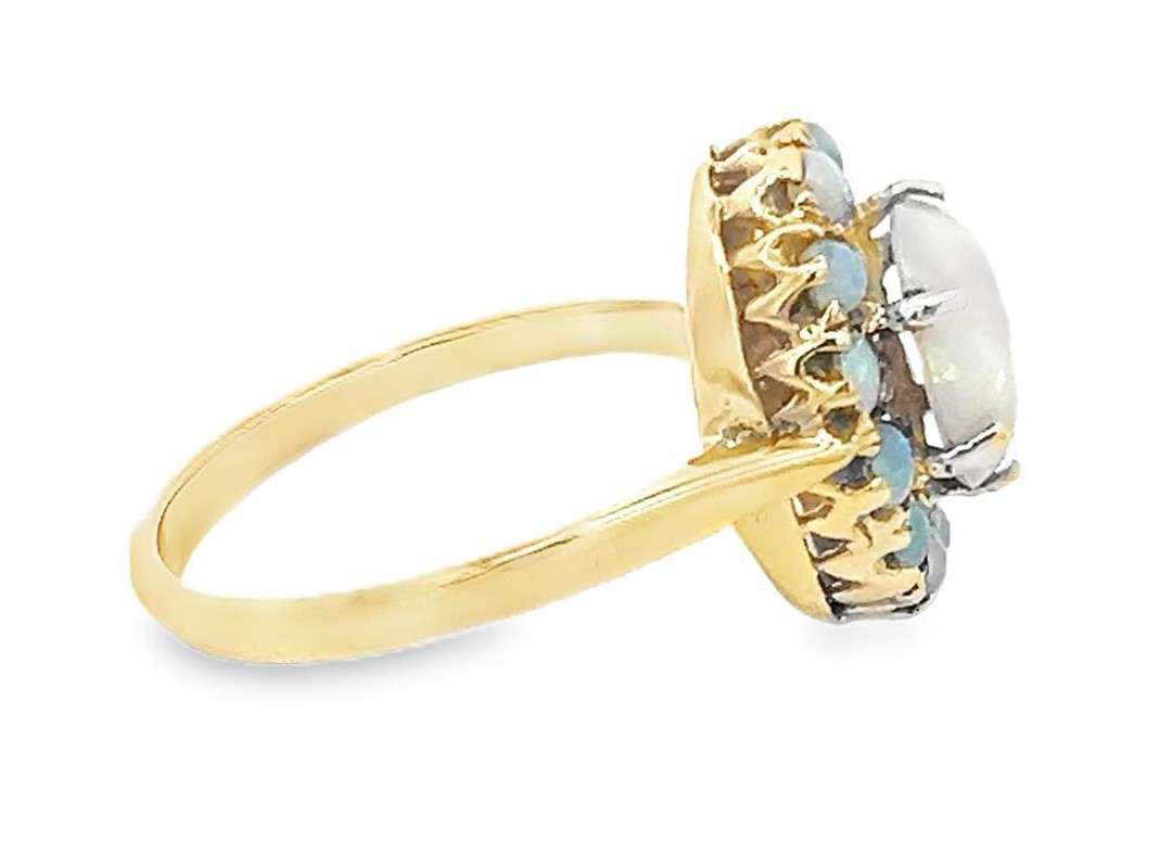 An opal cluster ring in unmarked yellow metal, size P. Central oval opal surrounded by 12 round opals, 2.75g.
