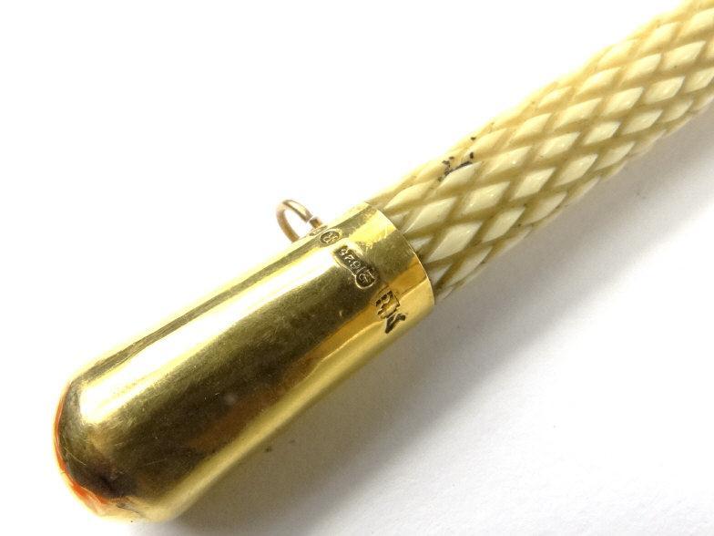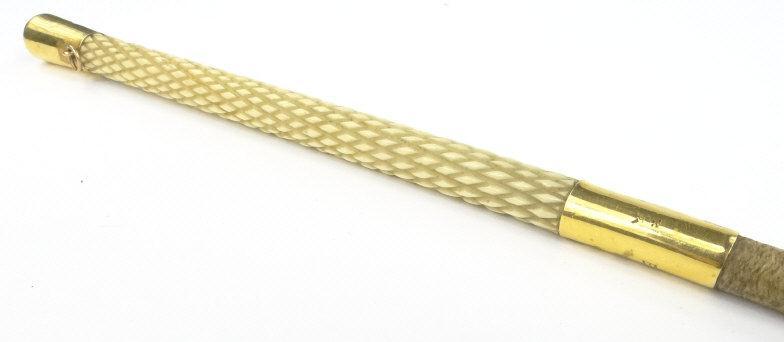 Antique riding crop with 14ct gold terminal and collar and carved ivory handle, the gold collar engraved E.M. SHAW 10 MAR 1893