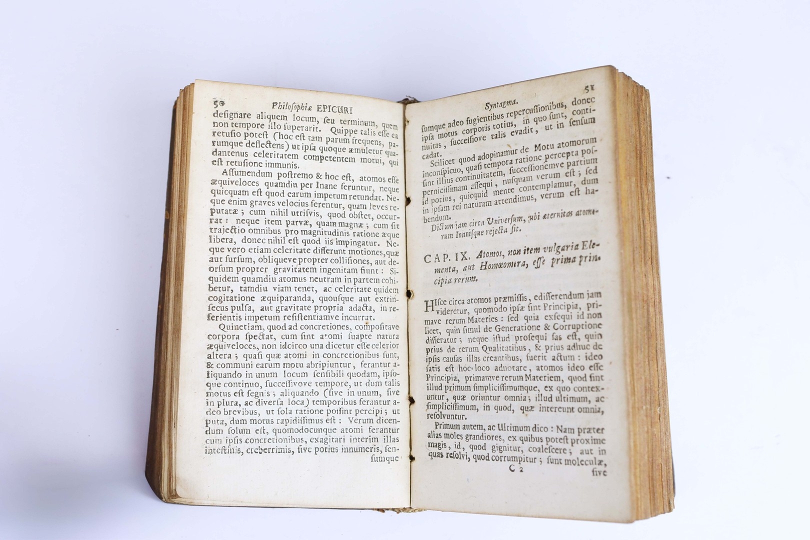 GASSENDI, PIERRE. INSTITUTIO LOGICA, ET PHILOSOPHIAE EPICURI SYNTAGMA, 1668. London: John Redmayne, 1668. Second edition. 16mo. 288pp. Bound in brown calf with blind embossing and red morocco label. Some marks to covers and crack to spine. Printer's waste used as pastedowns, since sprung. Ex-library stamps to pre-title and title pages (plus some additional pages), Croydon Public Libraries, dated 1943. Previous owner inscription to front flyleaf "Thomas Myddelton, his booke". A handsome and well-preserved copy.