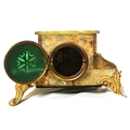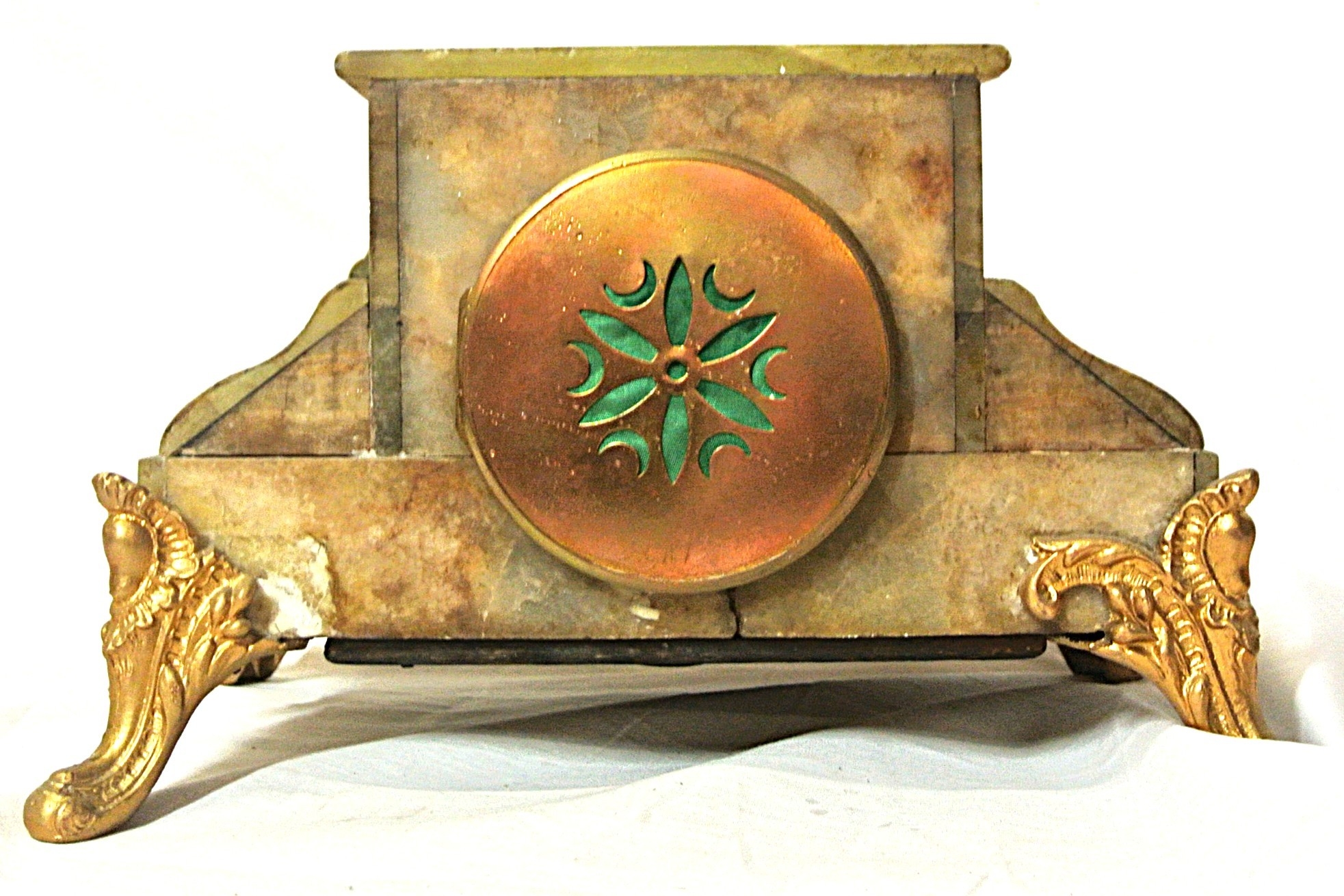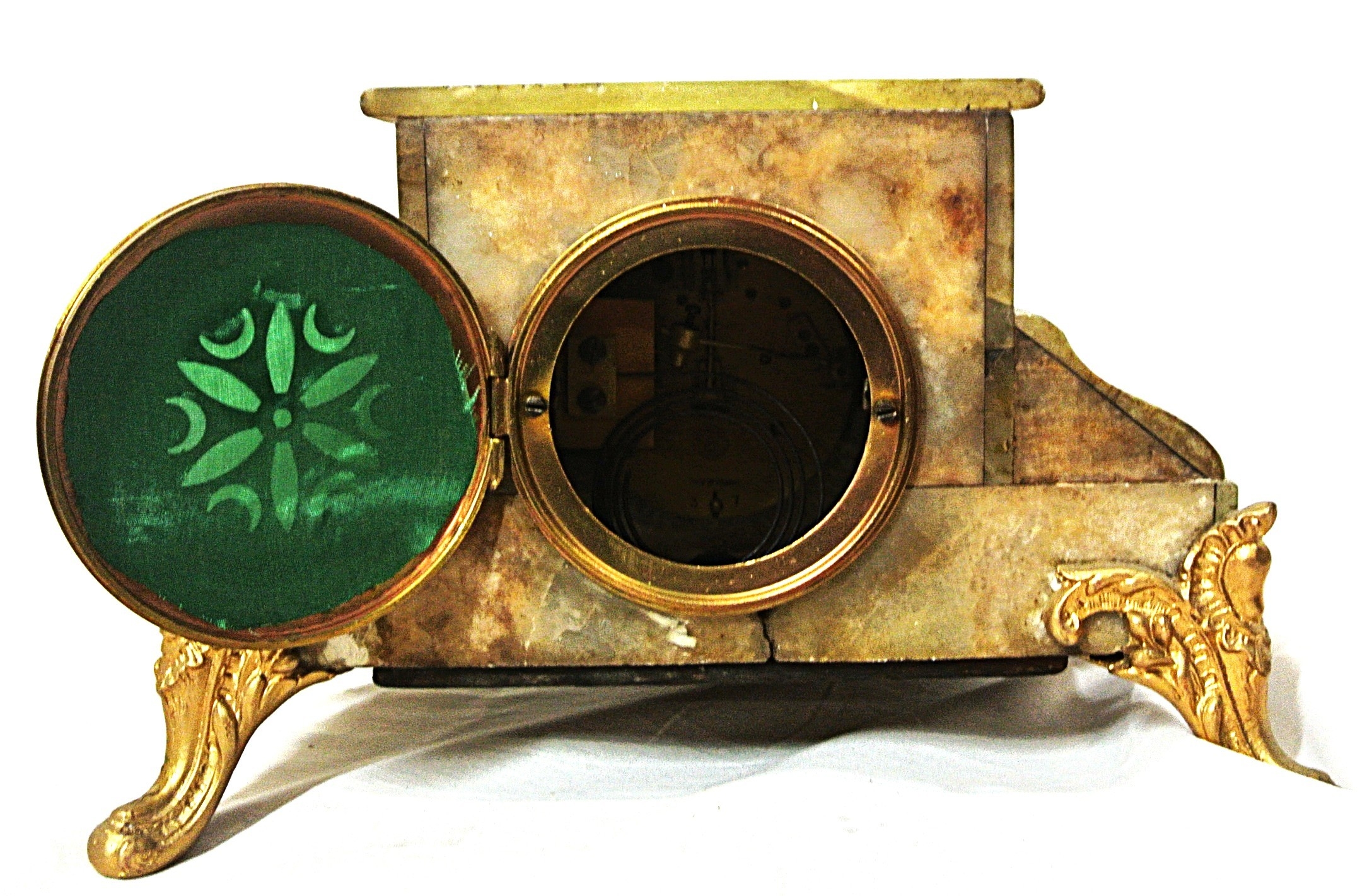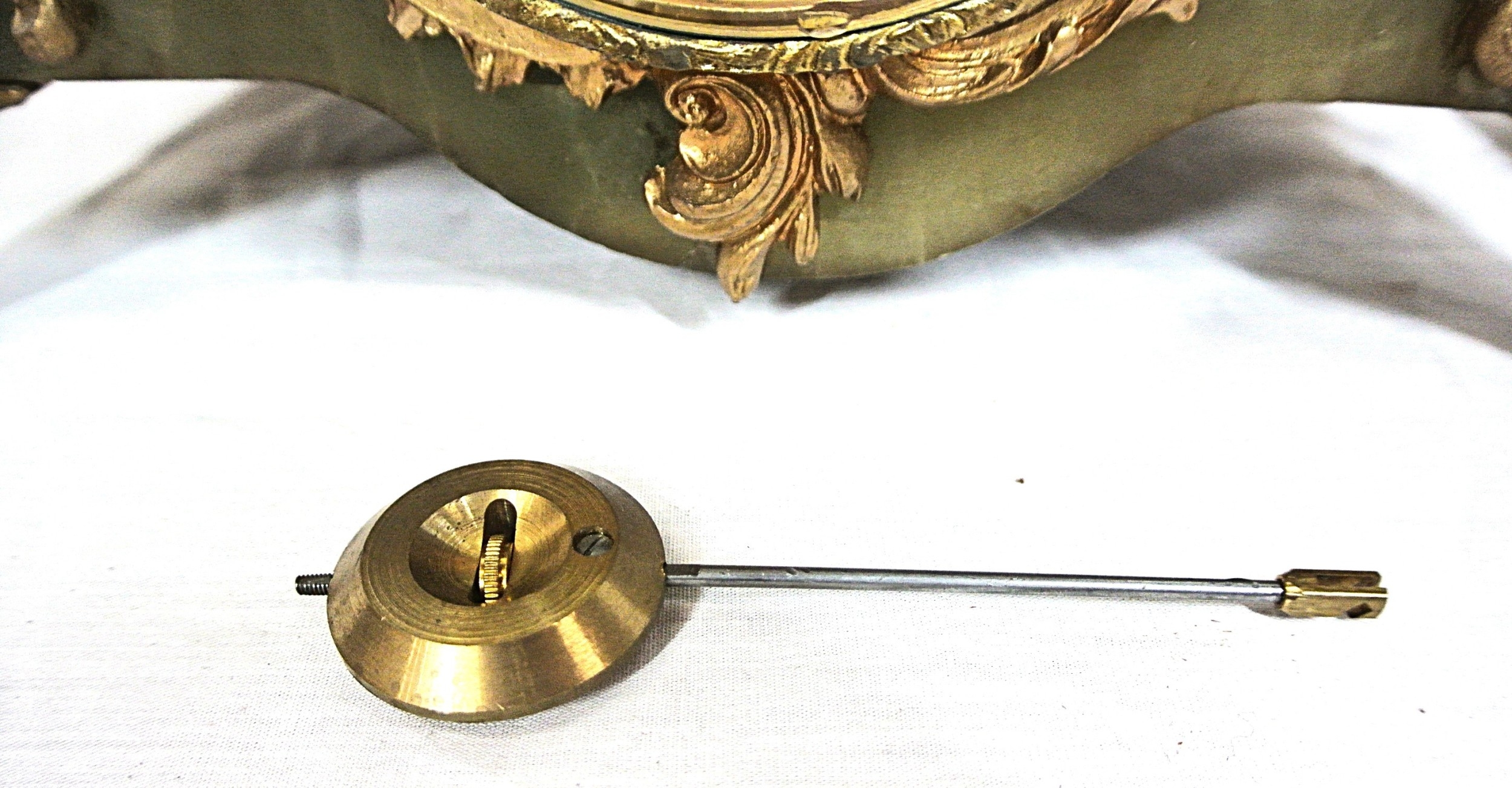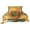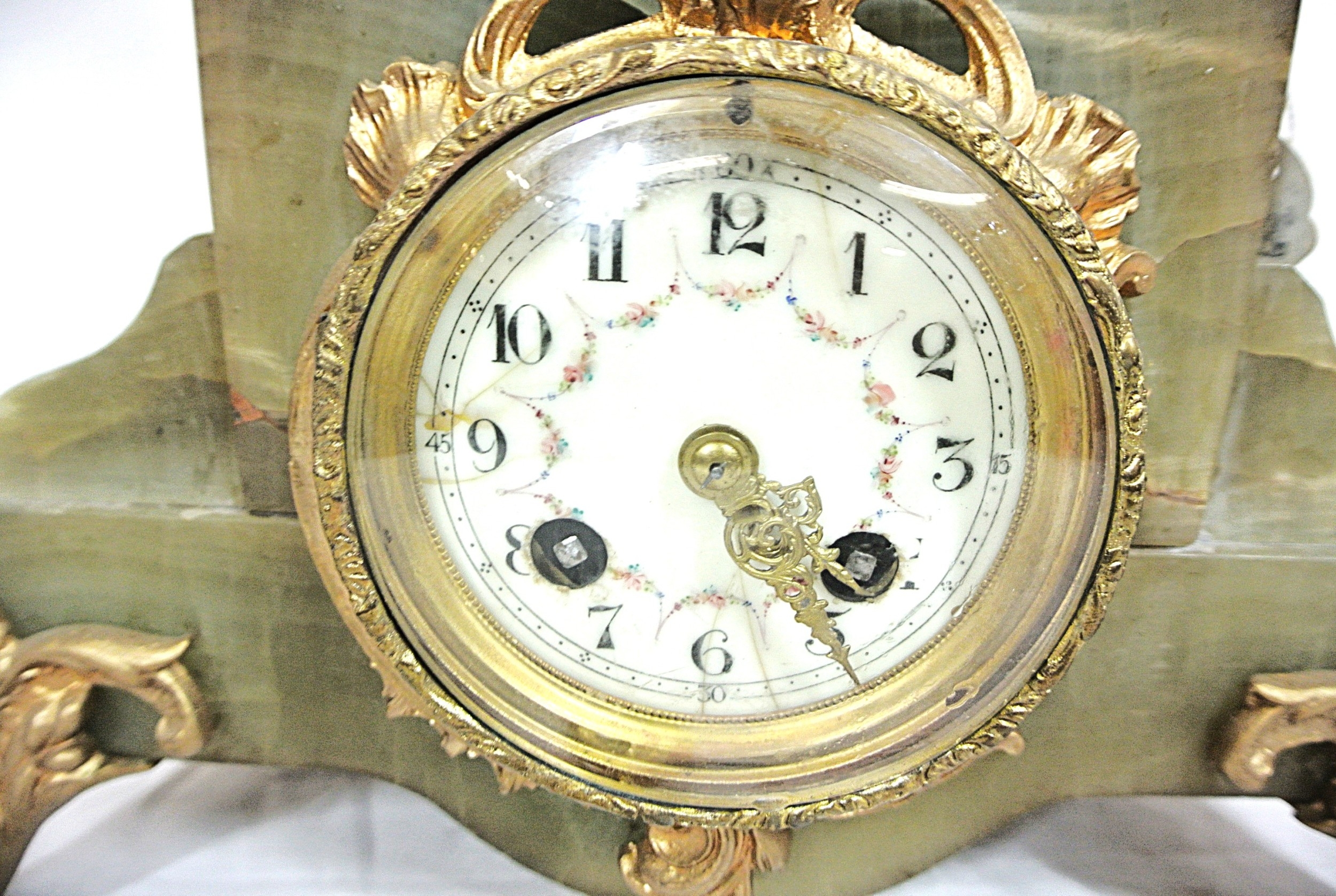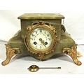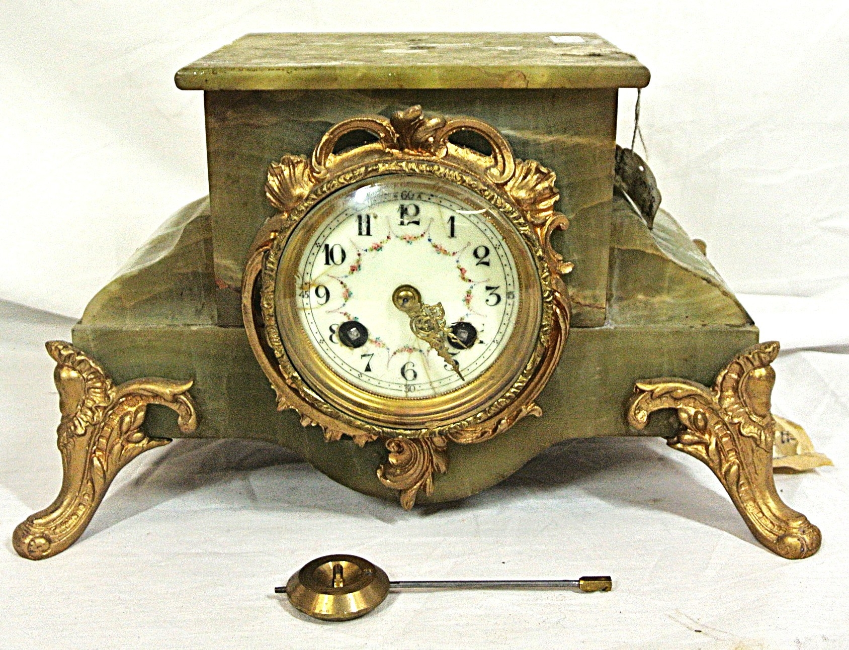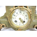French style green alabaster 12 hour mantle clock with ornate ormolu and enamel dial
