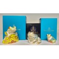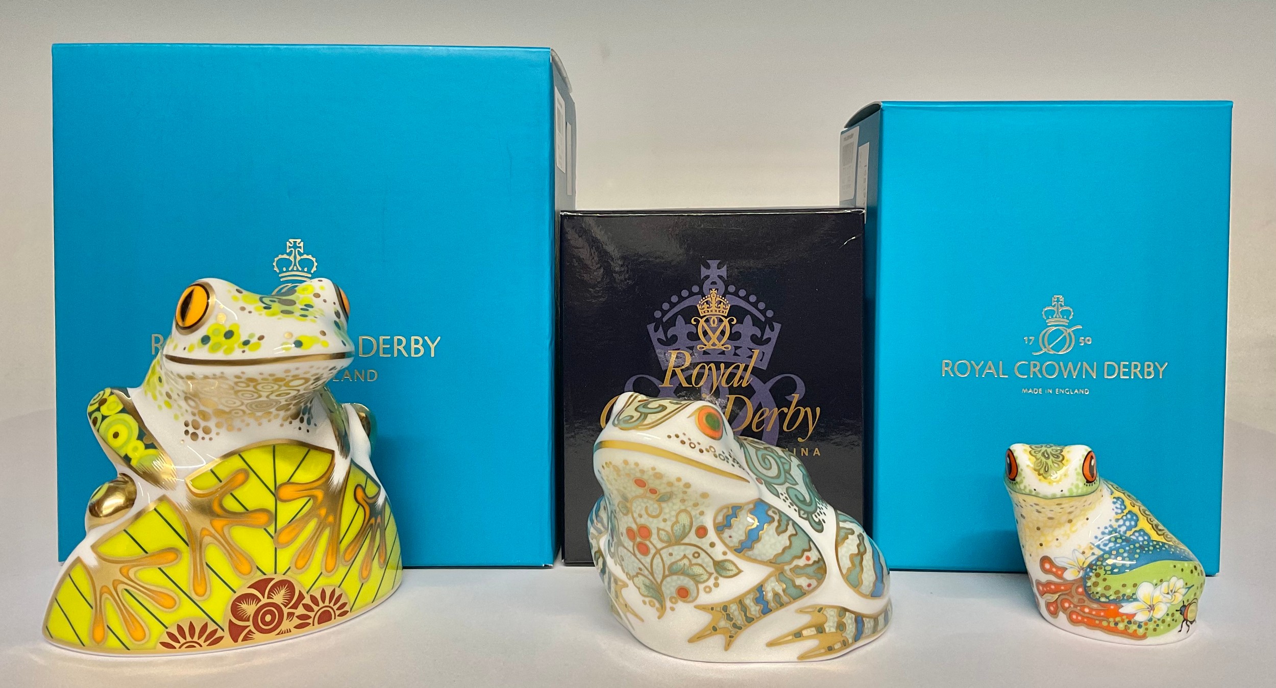 A Royal Crown Derby paperweight, Skip Frog, gold stopper, 8.5cm, printed mark in red, boxed; others, Marsh Frog, gold stopper, 6cm, printed mark in red, boxed; Red Eyed Tree Frog, Collector's Guild exclusive, gold stopper, 4.5cm, printed mark in grey, boxed (3)