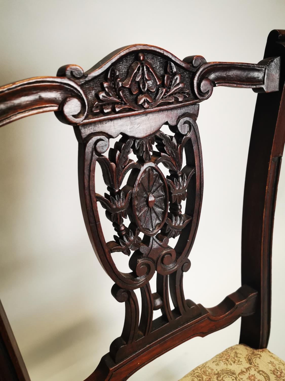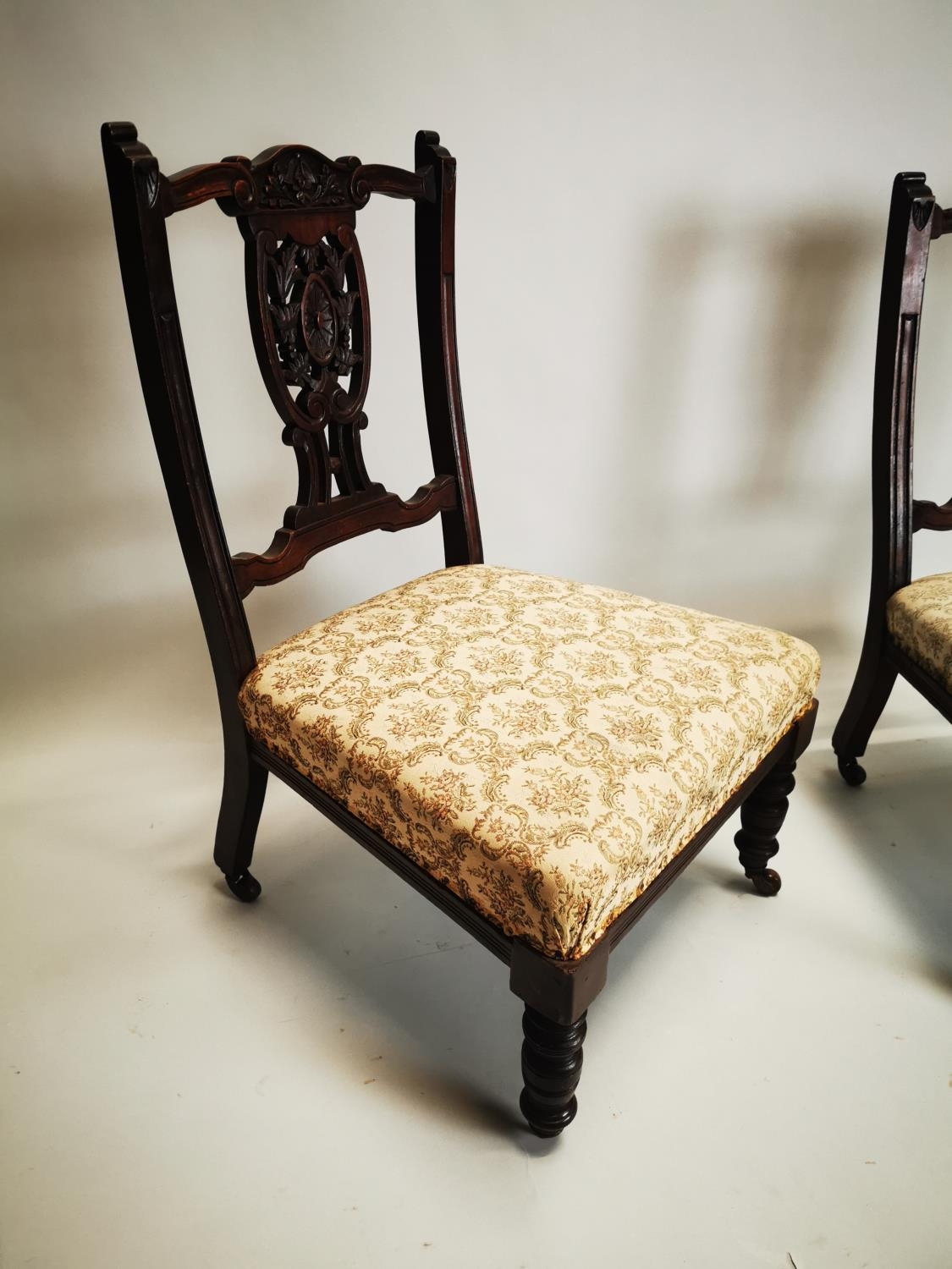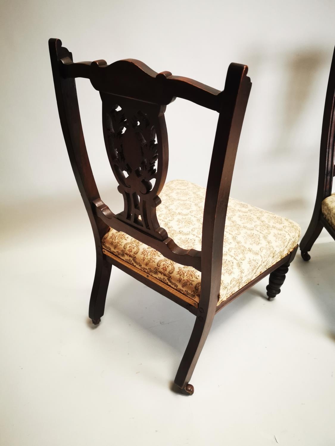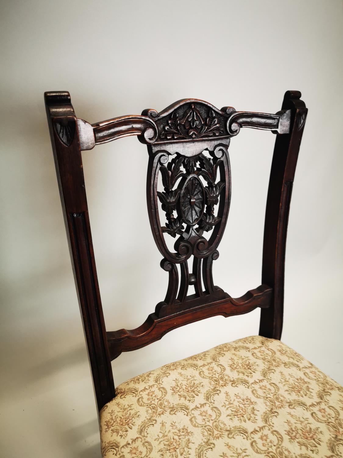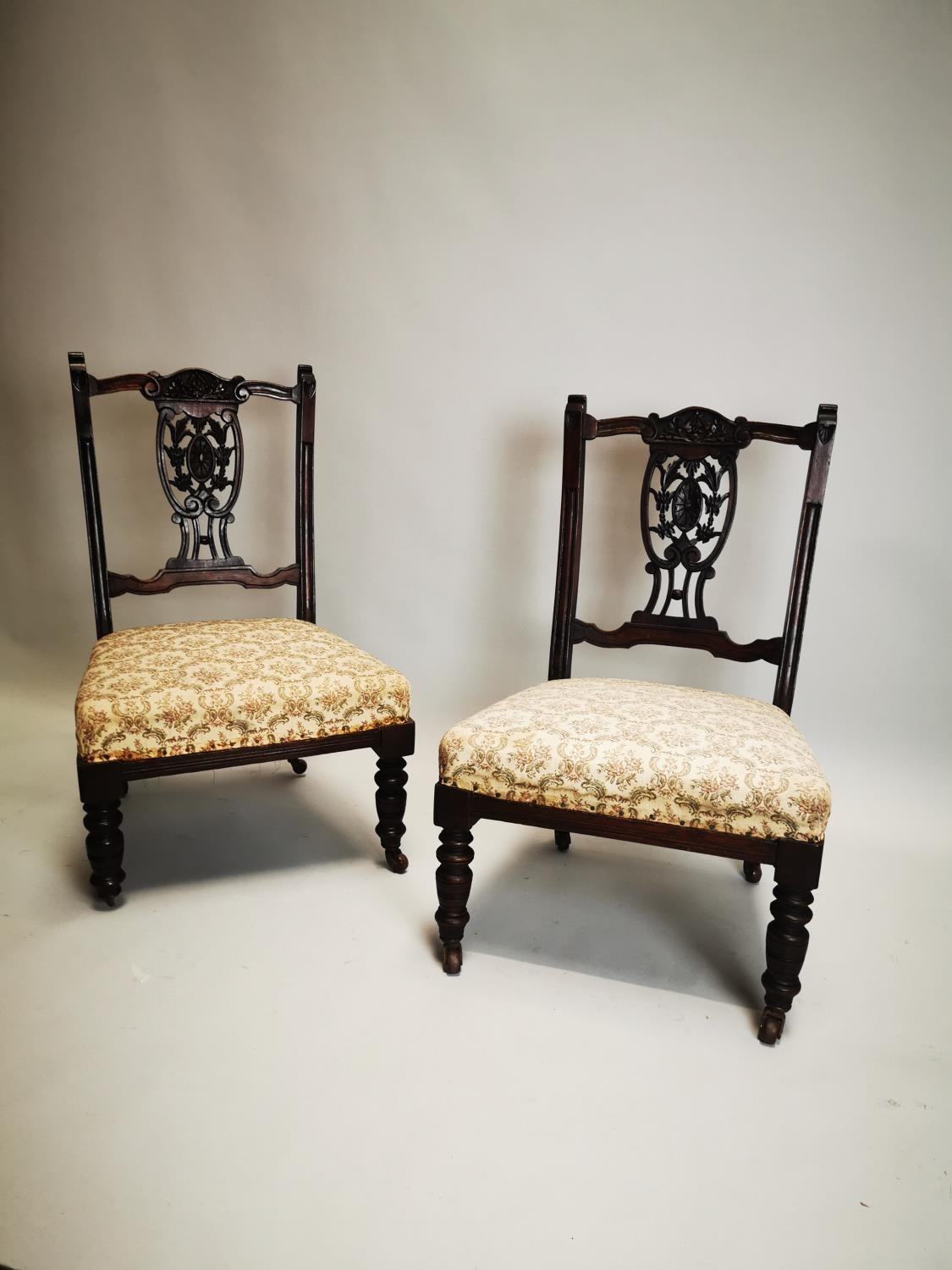 Pair of Edwardian upholstered mahogany parlour chairs. { 73cm H X 46cm W X 47cm D }.