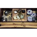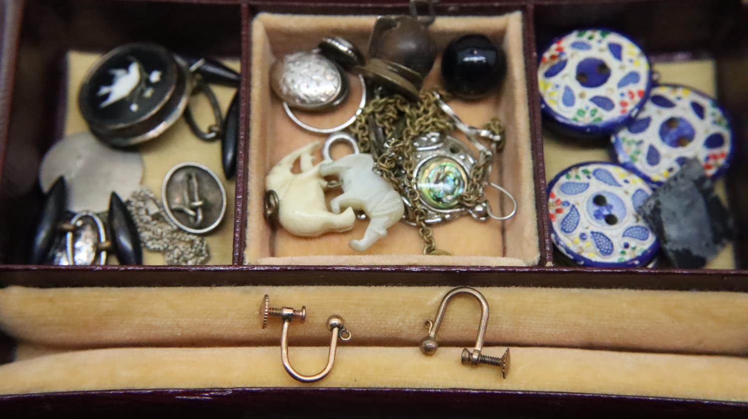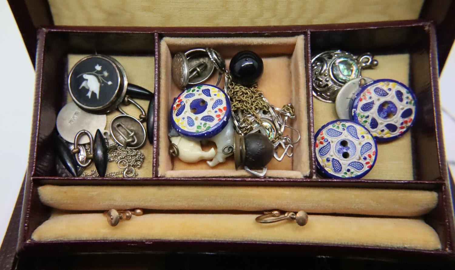 Leather jewellery box with contents including silver. P&P Group 1 (£14+VAT for the first lot and £1+VAT for subsequent lots)