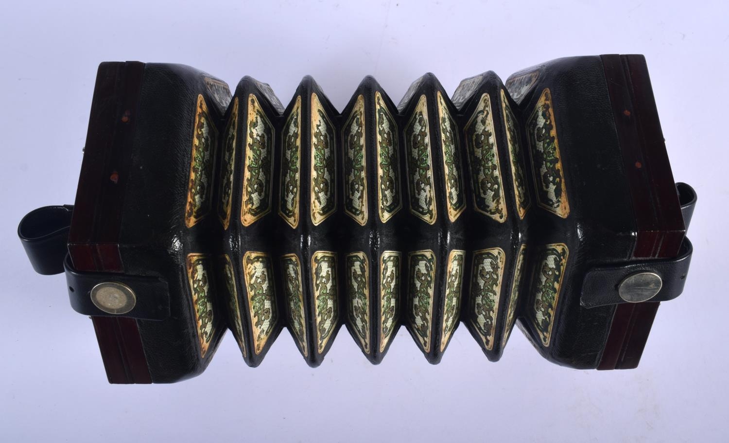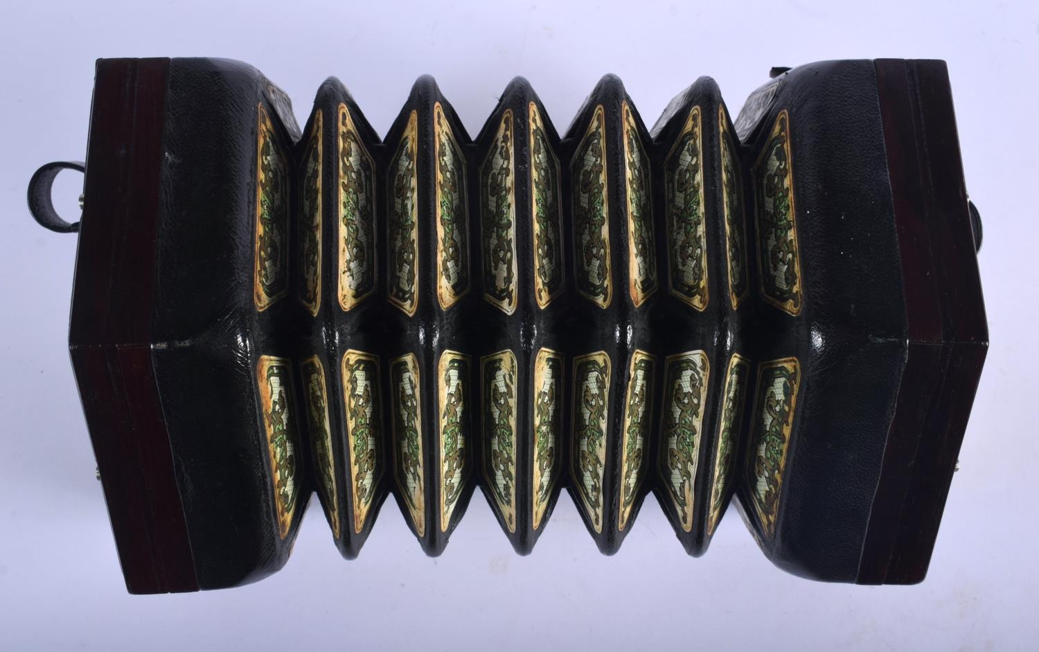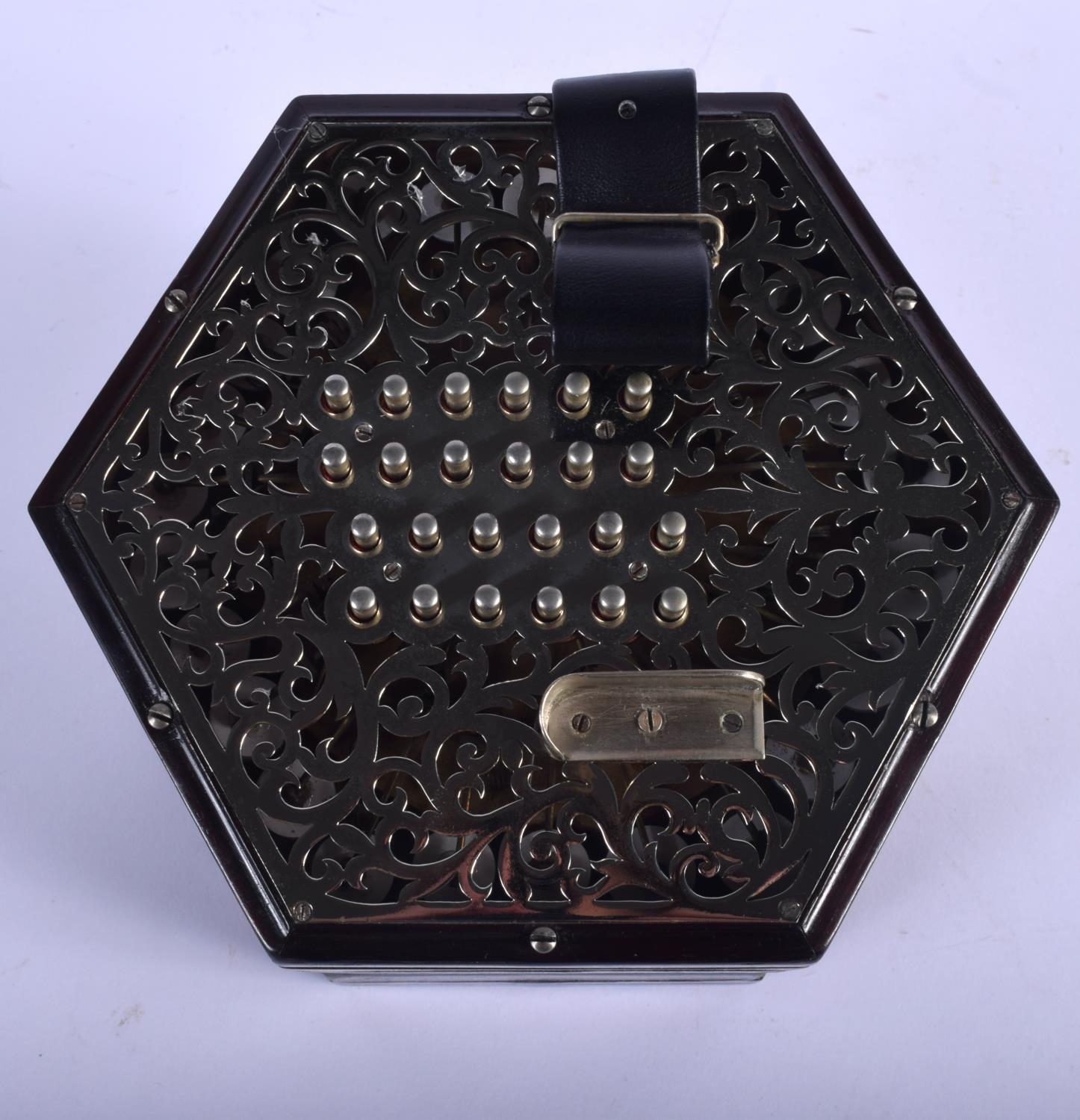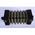 A BOXED 48 BUTTON LACHENAL & CO CONCERTINA within a case. Each end 16 cm x 16 cm.