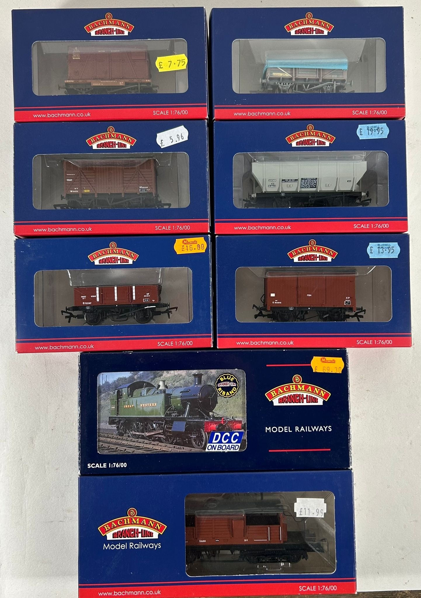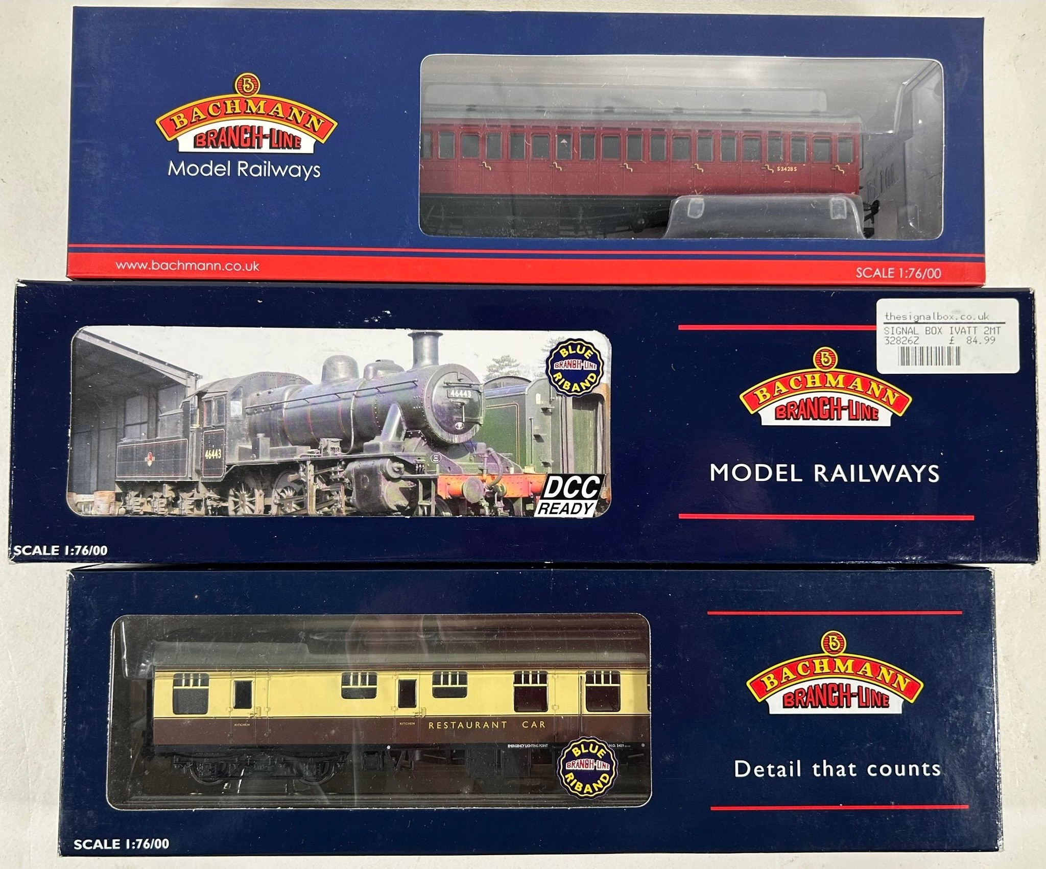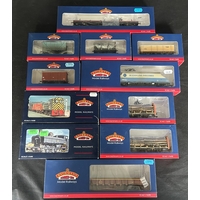 Bachmann Branchline OO Railway. A BR Ivatt Class 2MT 2-6-0 tender locomotive 46443 (32-826Z). A BR Class 45XX Prairie 2-6-2T 4507 (32-125DC). 2 passenger coaches a BR MK1 Restaurant Car and an SE&CR 60Ft Birdcage. Plus 7 various freight wagons including a Queen Mary Brake Van. A covered hopper wagon. 10T fish van and a 3 plank wagon with BD container. All boxed, minor wear. Contents VGC-Mint. (11).