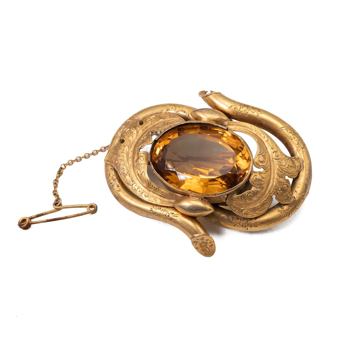 A 19th-century brooch set with citrine decorated with acanthus and engraved decoration.