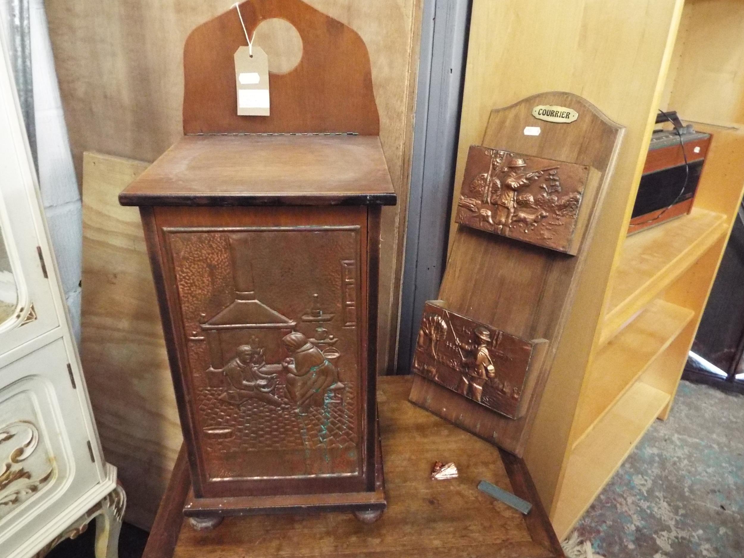 A stained wood bread box having copper panel together with a letter rack