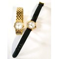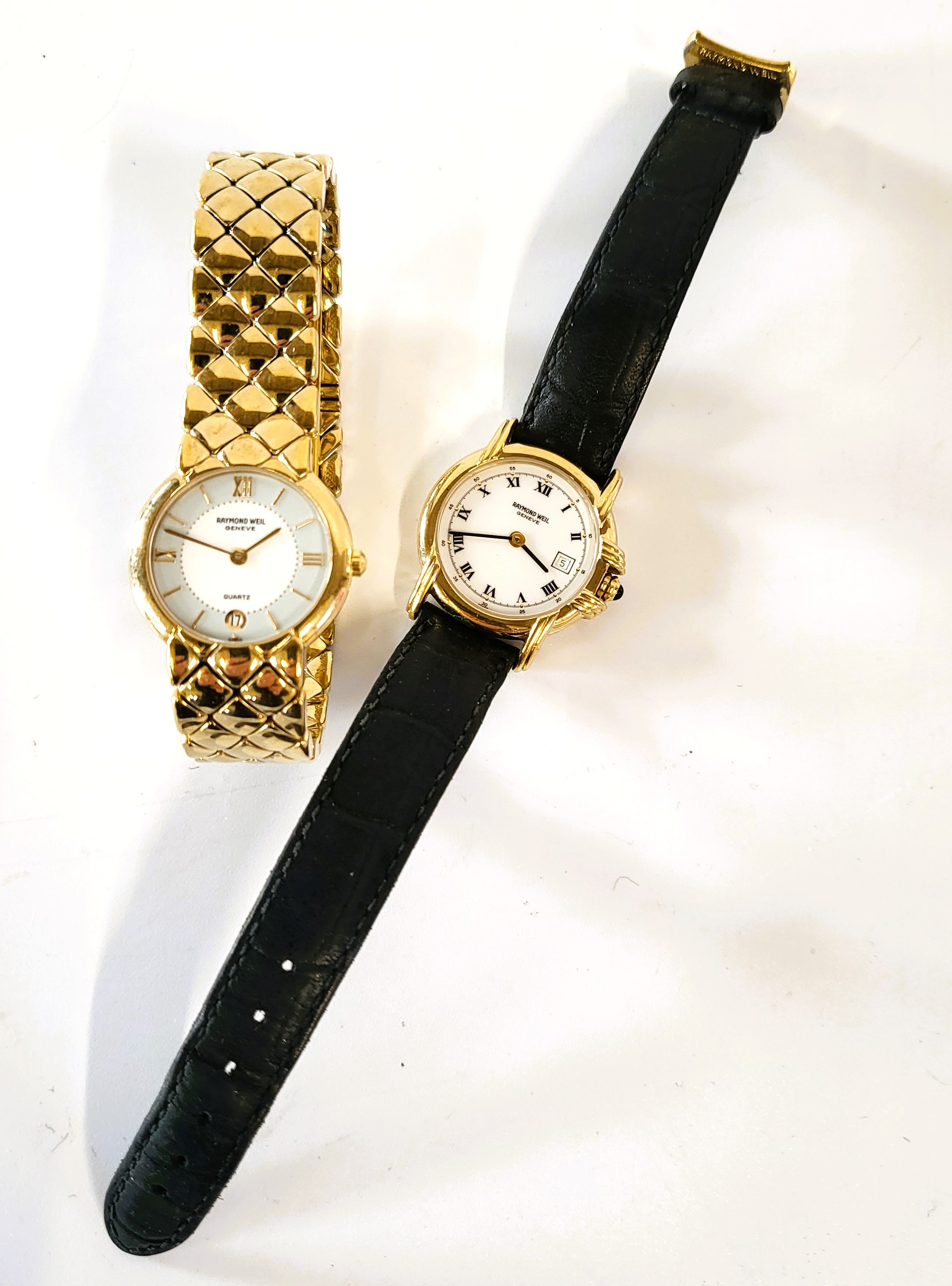 Two ladies Raymond Weil watches. A dress watch reference 9931, features a 18ct gold plated case and bracelet with white roman numeral dial and date function. The second ref 9955 on a leather strap.