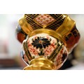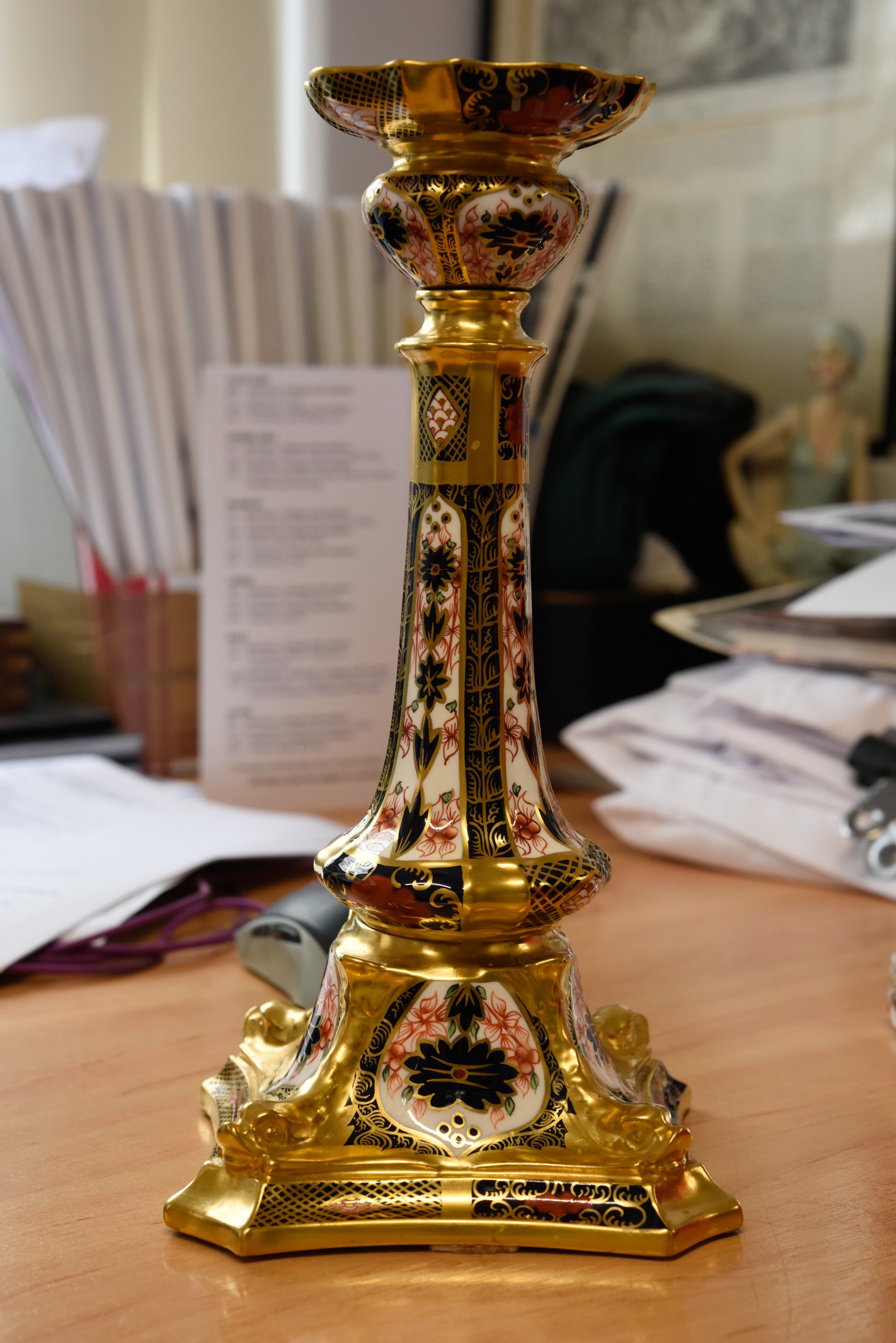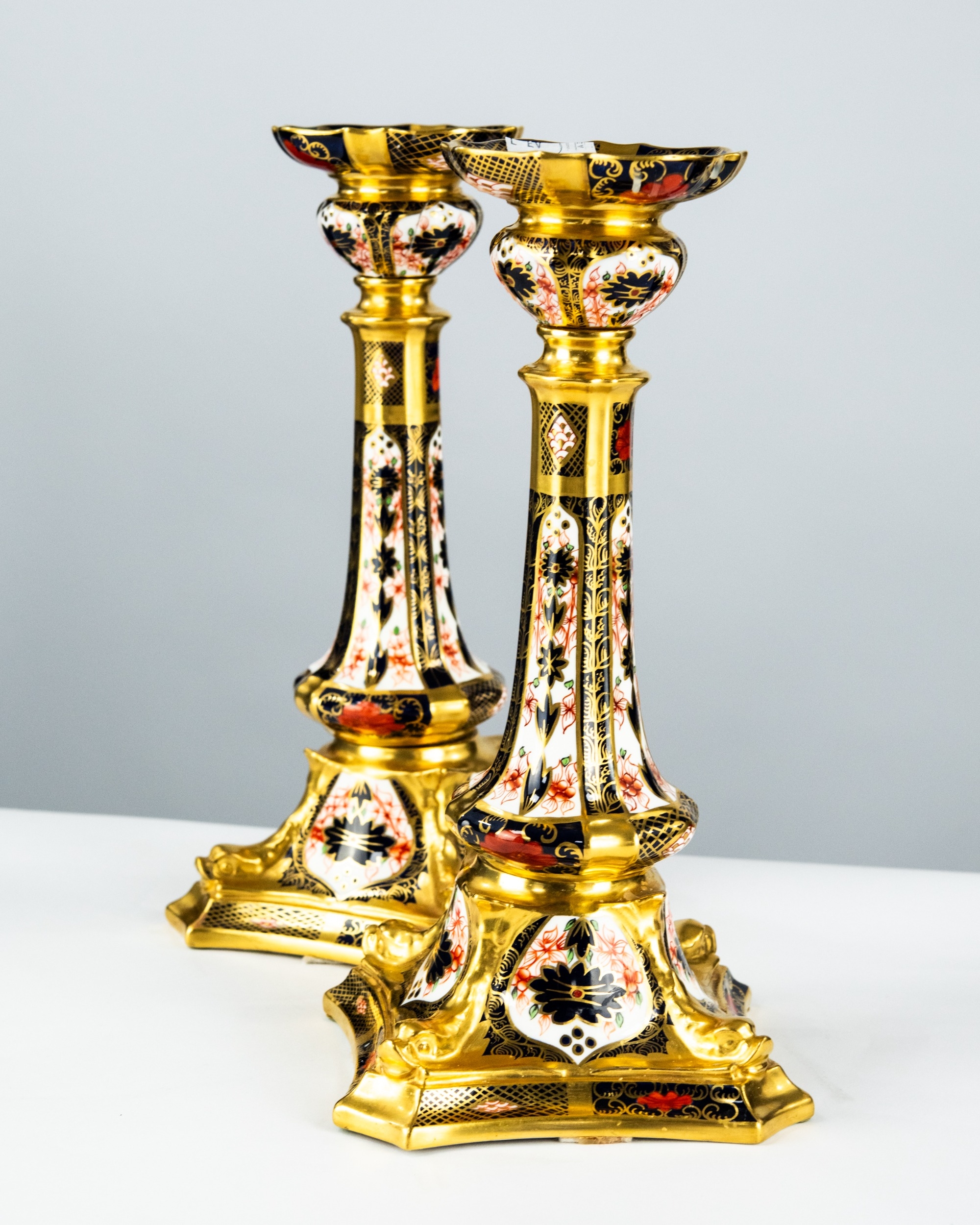 PAIR OF TALL ROYAL CROWN DERBY IMARI PATTERN CHINA CANDLESTICKS, red printed marks, date code XXXII, 10½ high (28.5cm) (2)