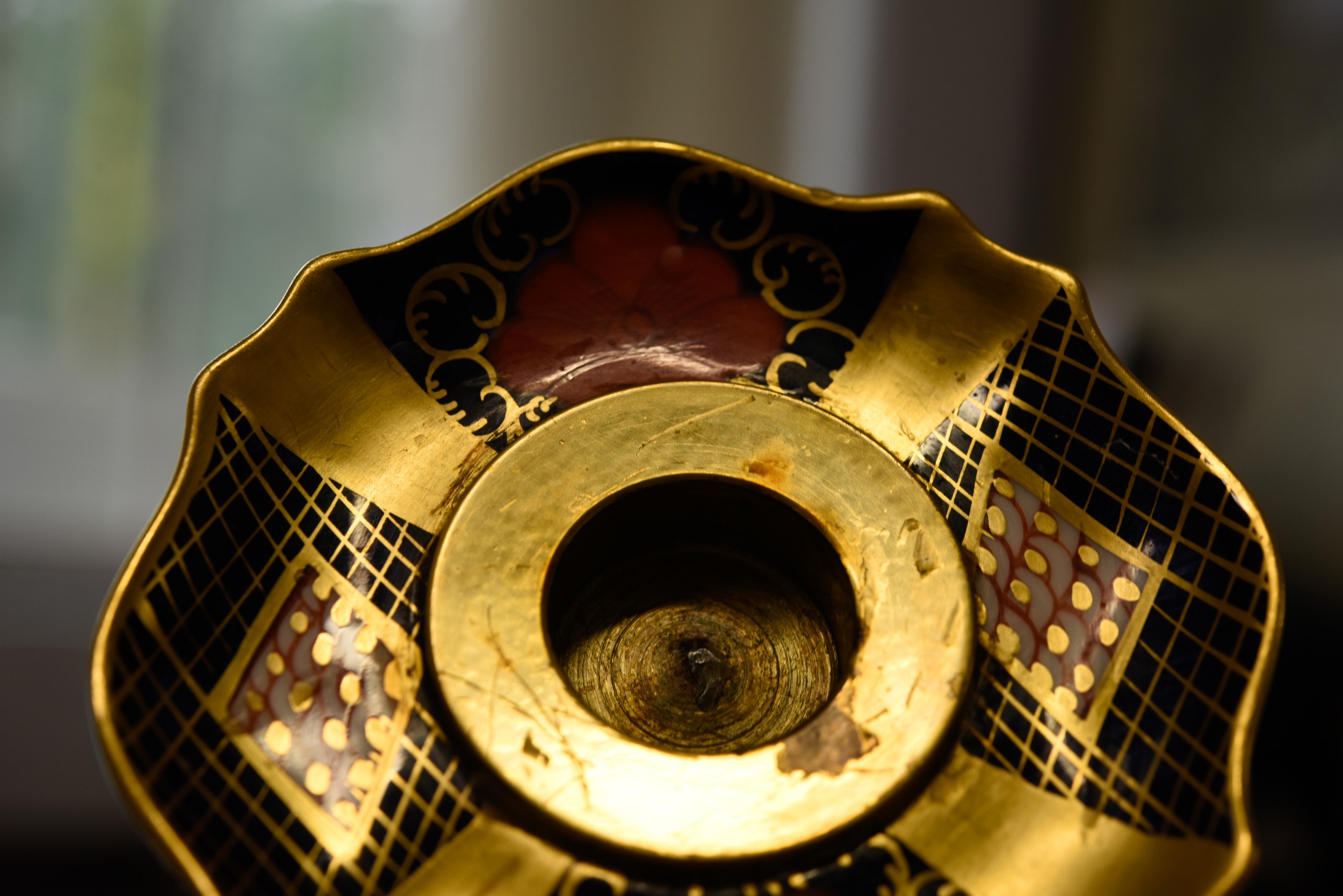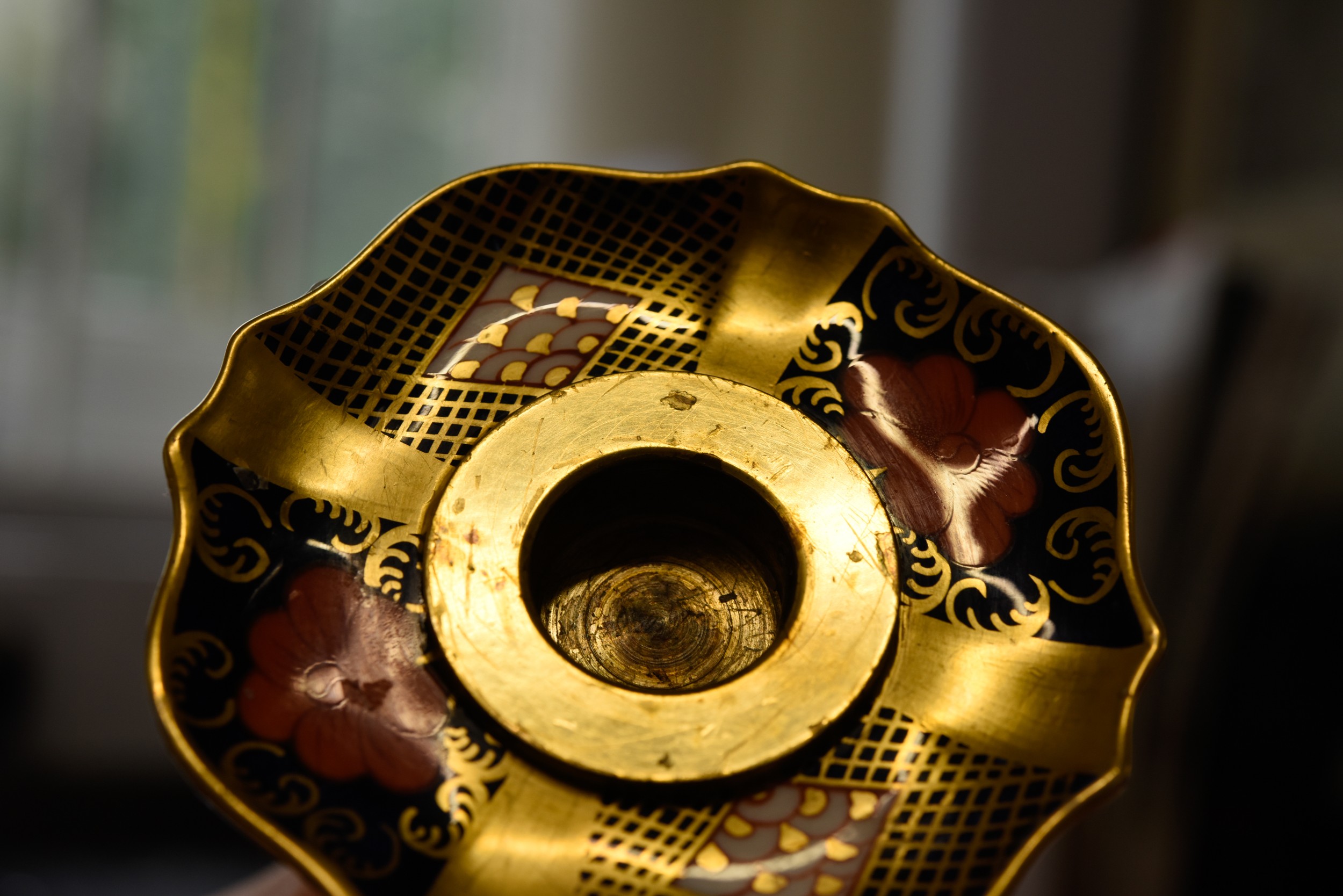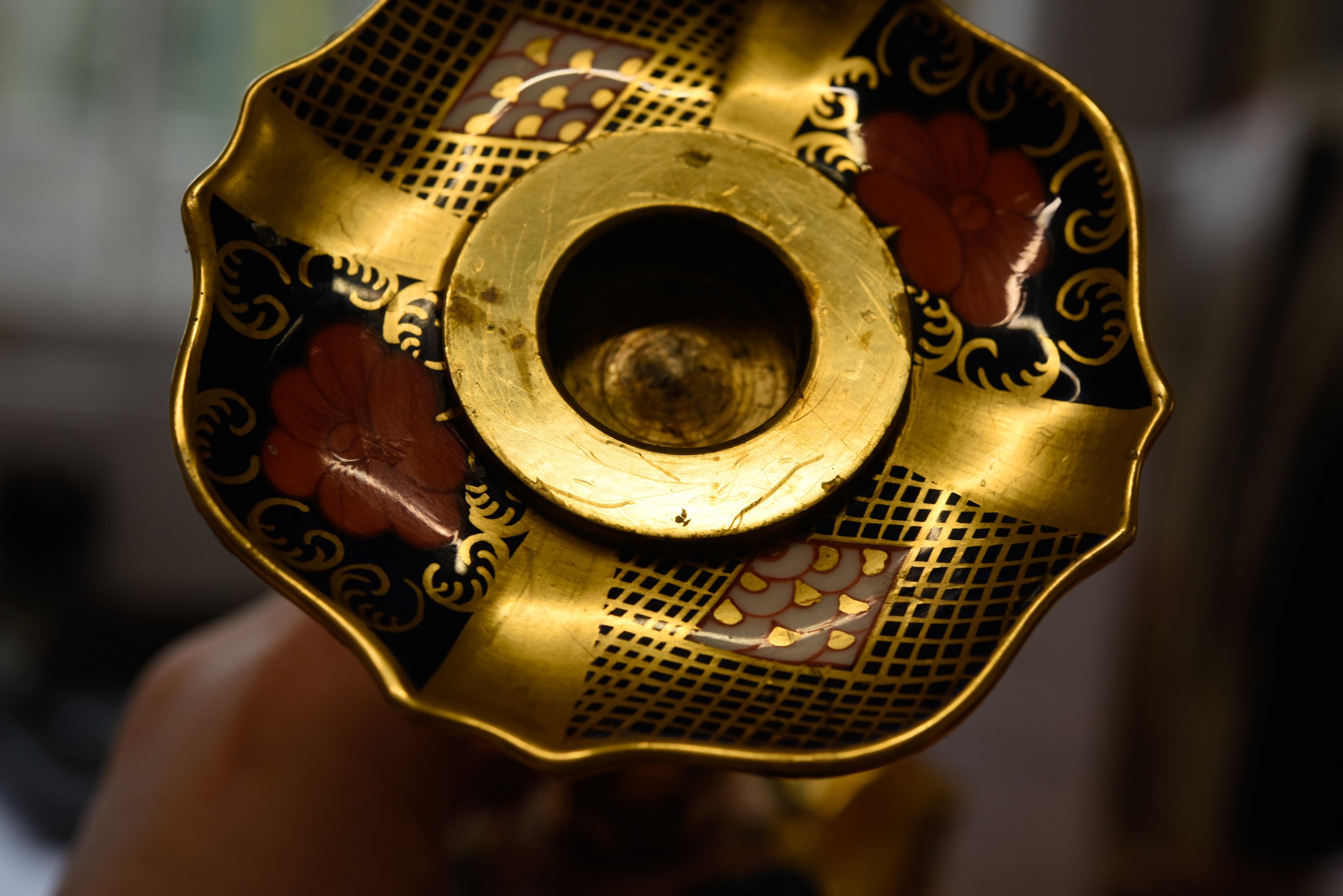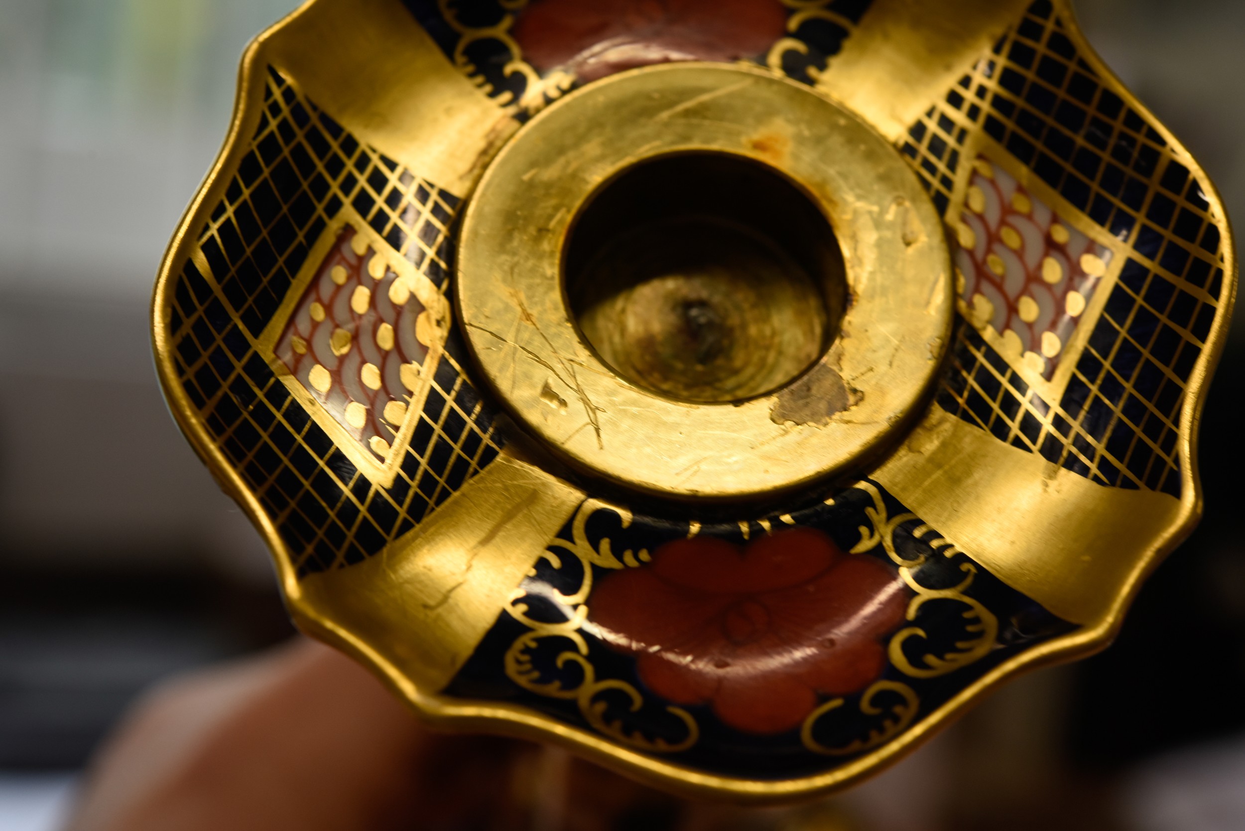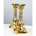 Both are not straight, the columns are not matched up correctly with the bases- offset, see images, with scratching to the edge of the actual holder and the china surround, see images, wax drips, very light rubbing to the gilt, surface scratching and later felt pads added to underside of the edges, some missing