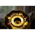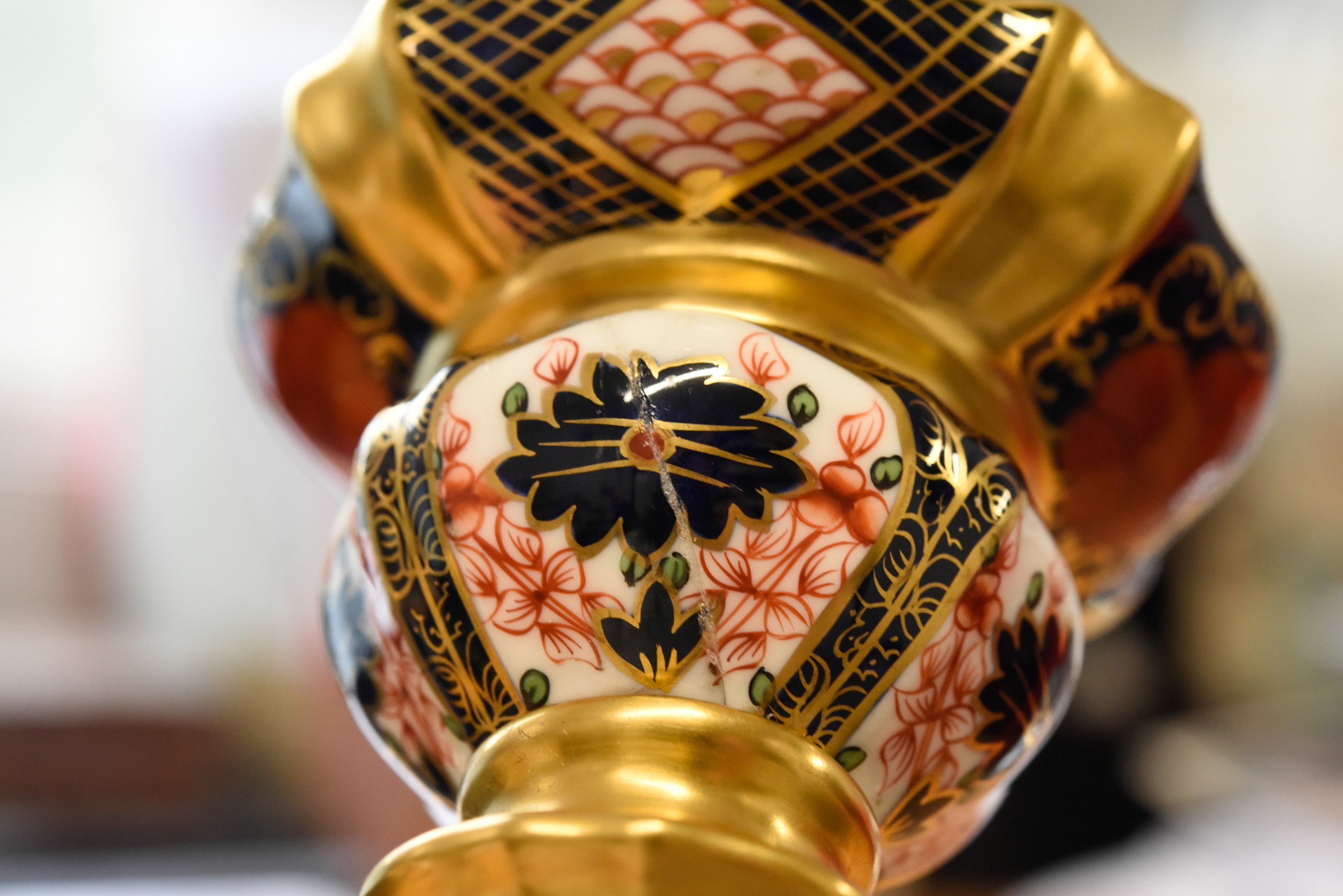 C/R-one candlestick with the swollen section between the sconce and top of the column, broken in two places and re-glued, badly, approximately half is affected and with related minor losses, visible glue lines and affected pieces with white edges visible to the breaks, not matched up precisely