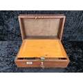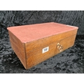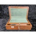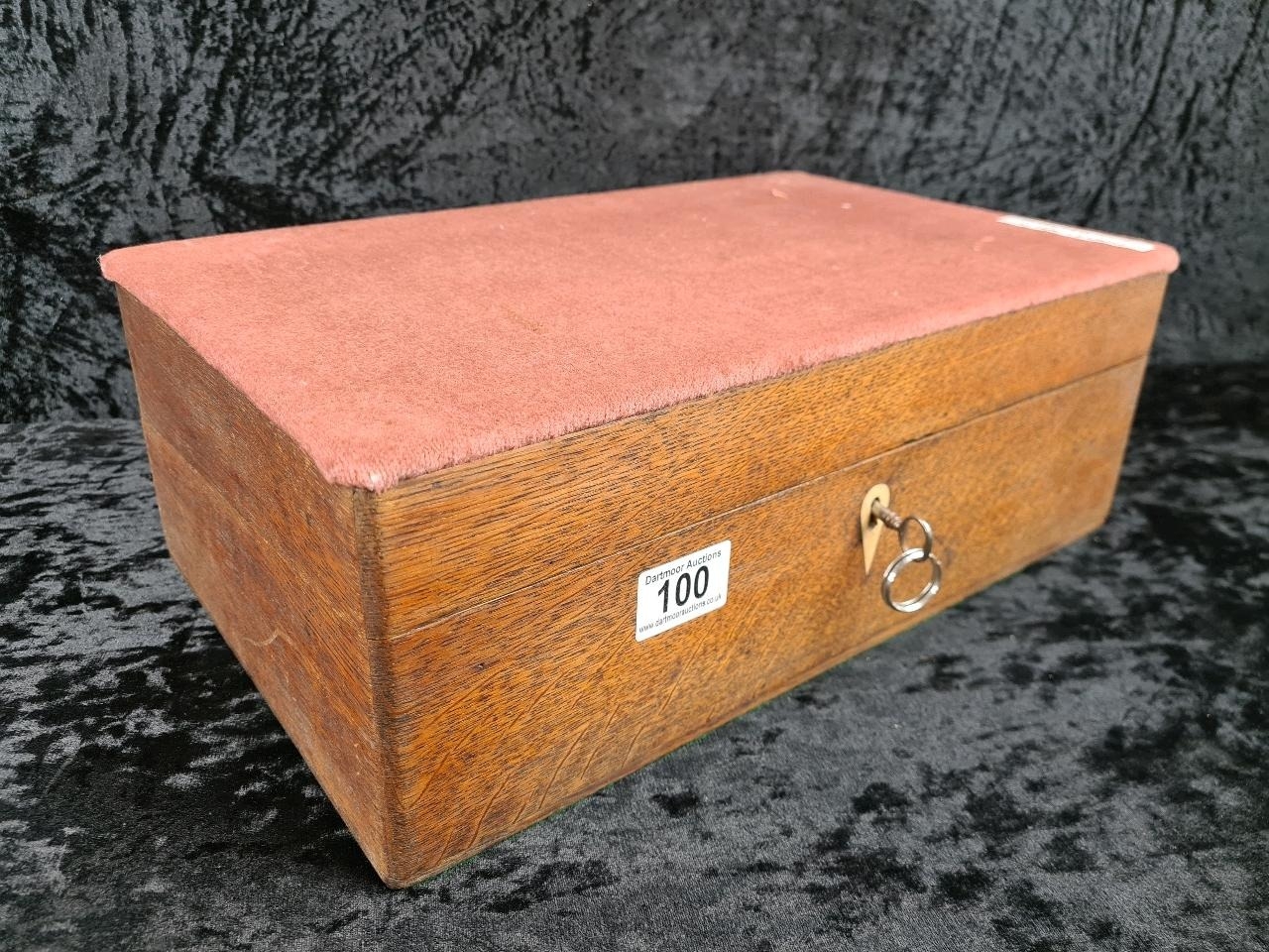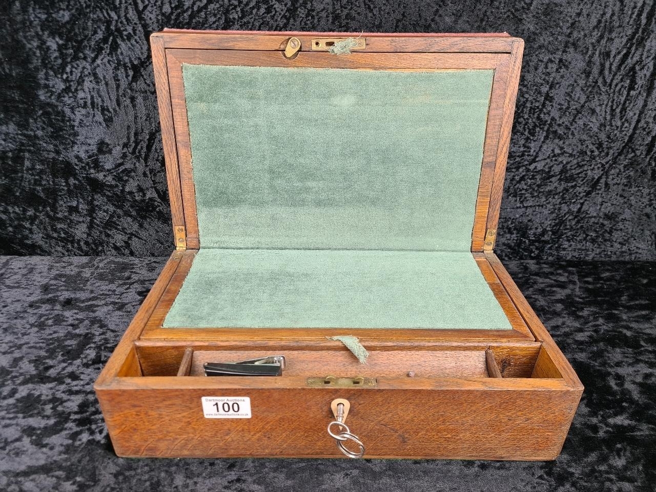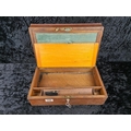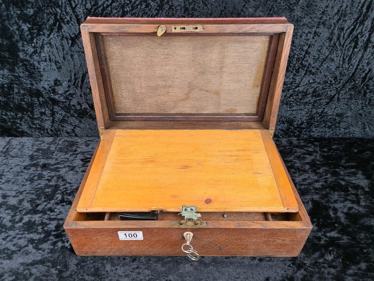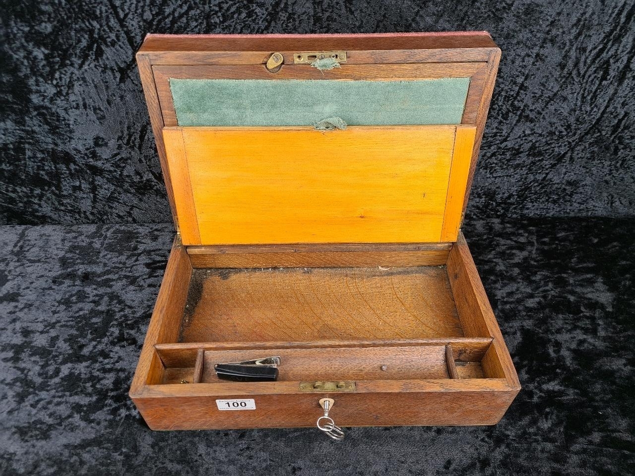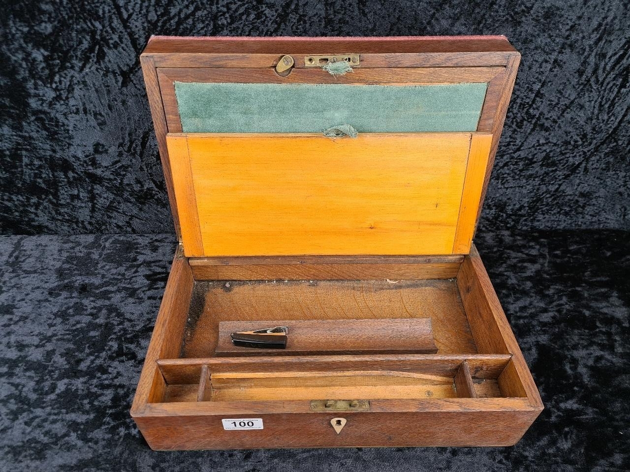Antique wooden writing slope with pen and inkwells and key. Approx H14 x W40 x D24cm.