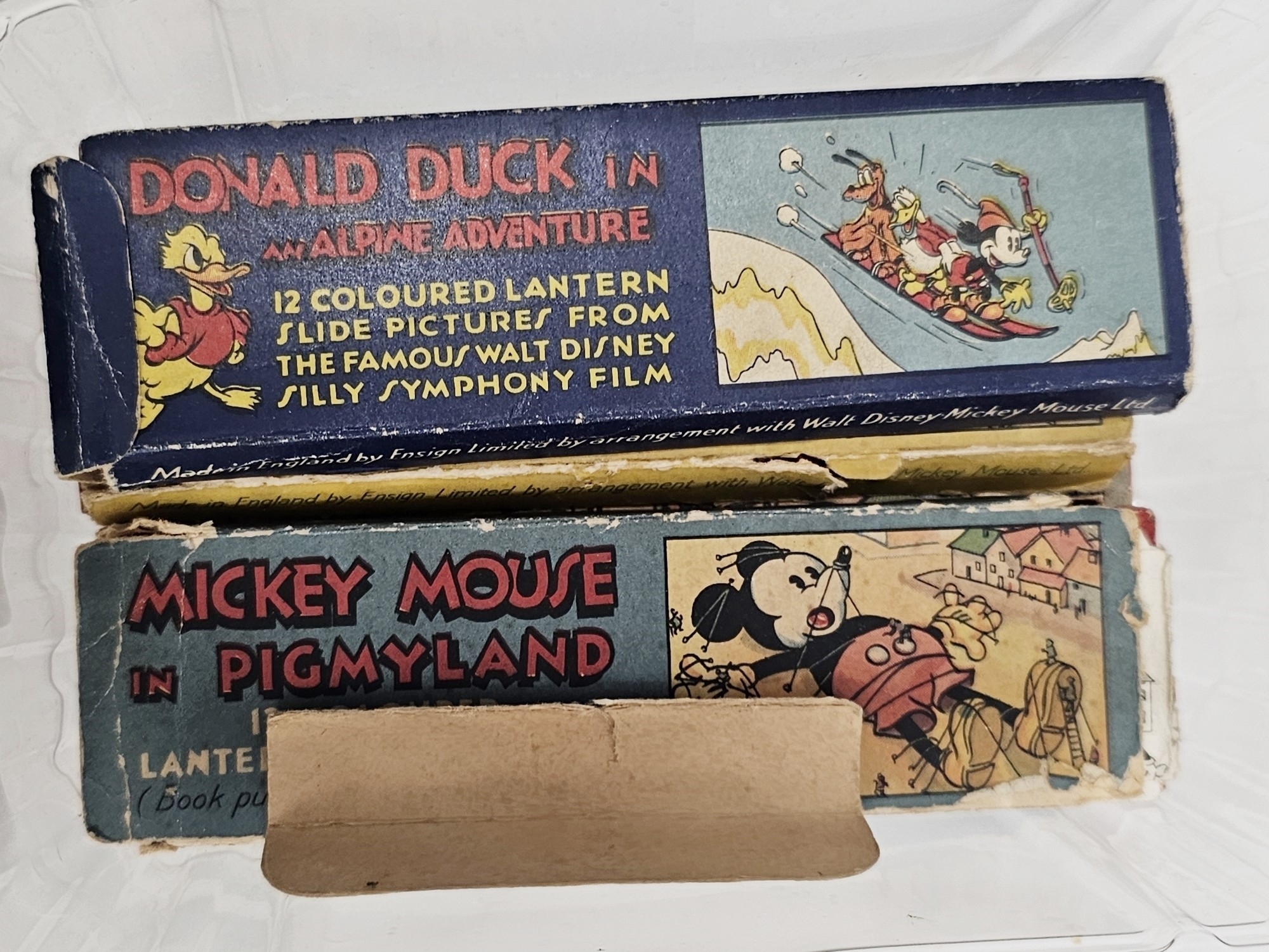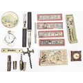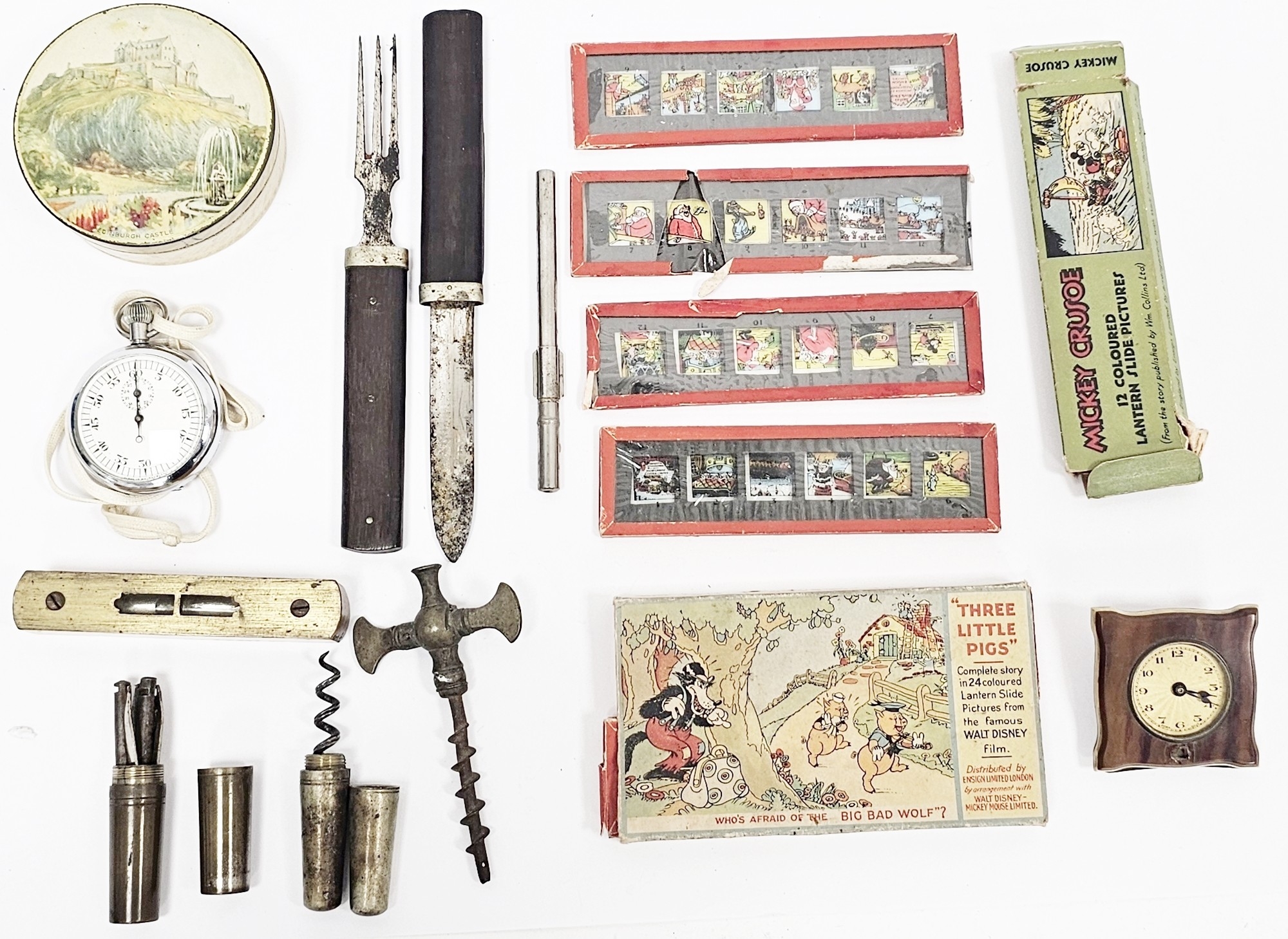 Mixed lot of collectables including a steel bow button hook, four cased multi-tool sets, hardwood cased campaign fork and knife set, spirit level, pocket watch and other items together with Collection of six boxed Mickey Mouse rectangular lantern slides including Mickey Mouse in Giant Land, the Big Bad Wolf and Little Red Riding Hood, the Pied Piper, Mickey Mouse in Pigmyland, Donald Duck in an alpine adventure, Mickey Crusoe together with boxed the Three Little Pigs (one slide missing) and four loose Santa's Workshop slides (some damage to some of the slides)