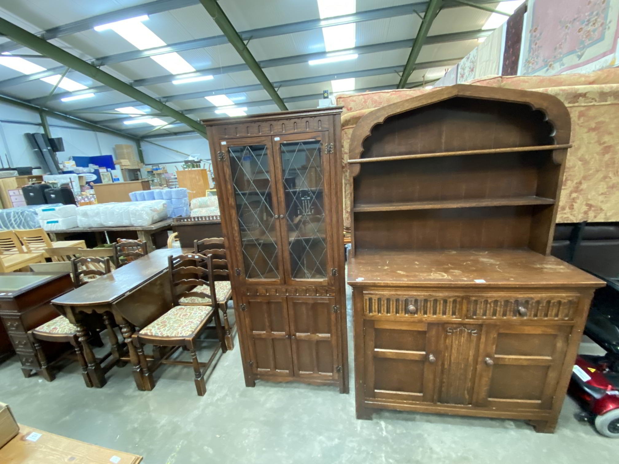 Oak linen fold dresser 175H 111W 48D, oak leaded glazed corner cupboard 176H 72W 33D and an oak drop leaf table 76H 106W 134D with 4 ladderback chairs