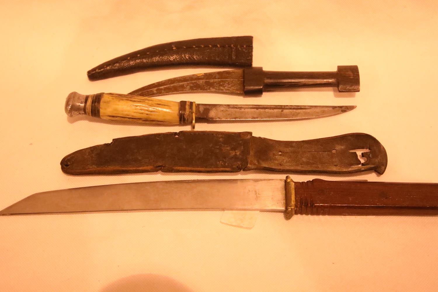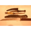 Three knives including bone handled example and two knife sheaths. P&P Group 1 (£14+VAT for the first lot and £1+VAT for subsequent lots)
