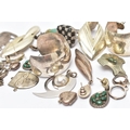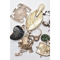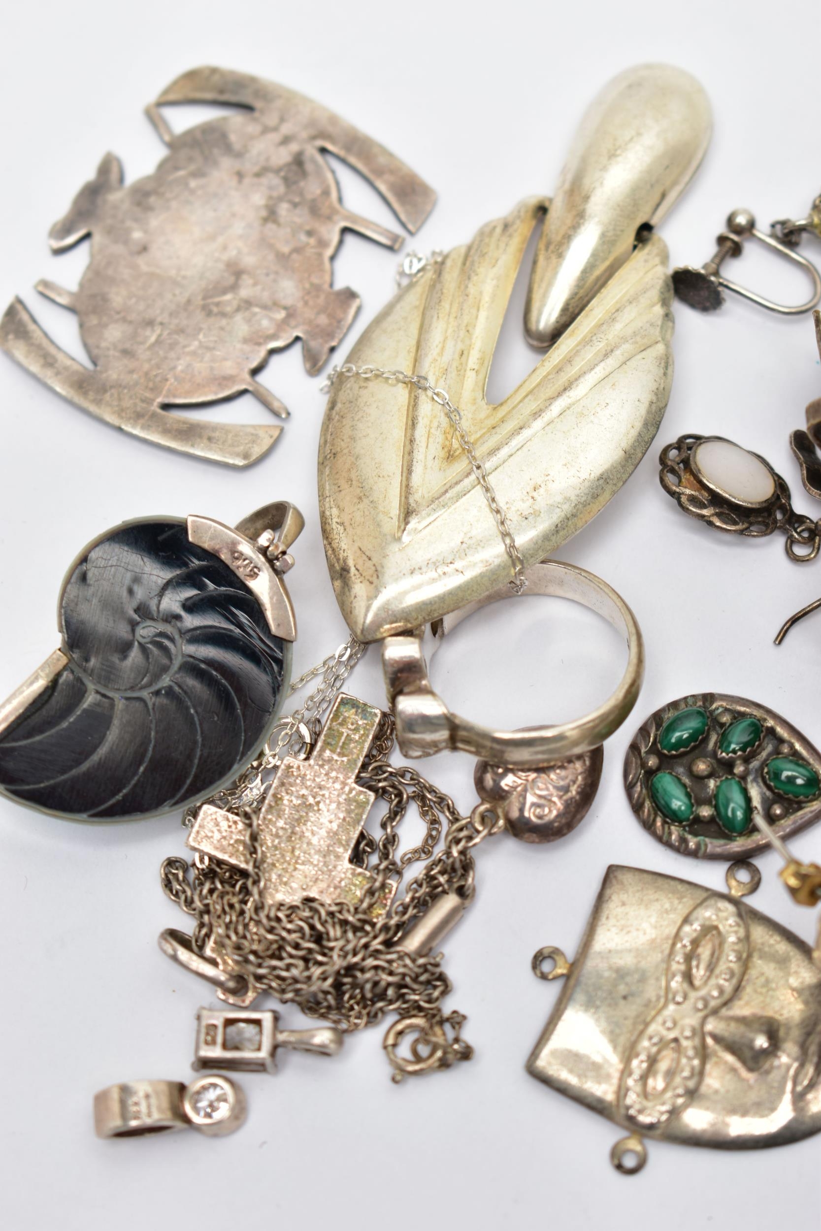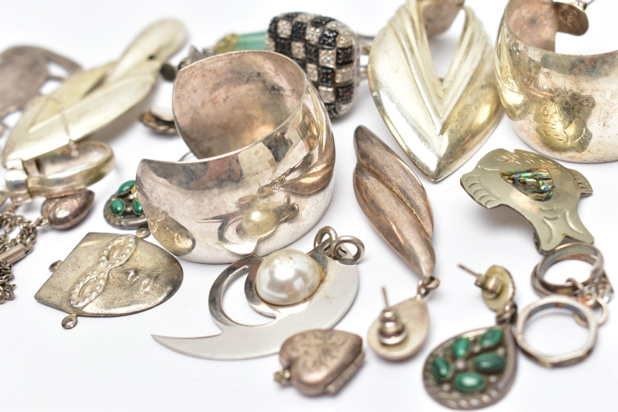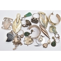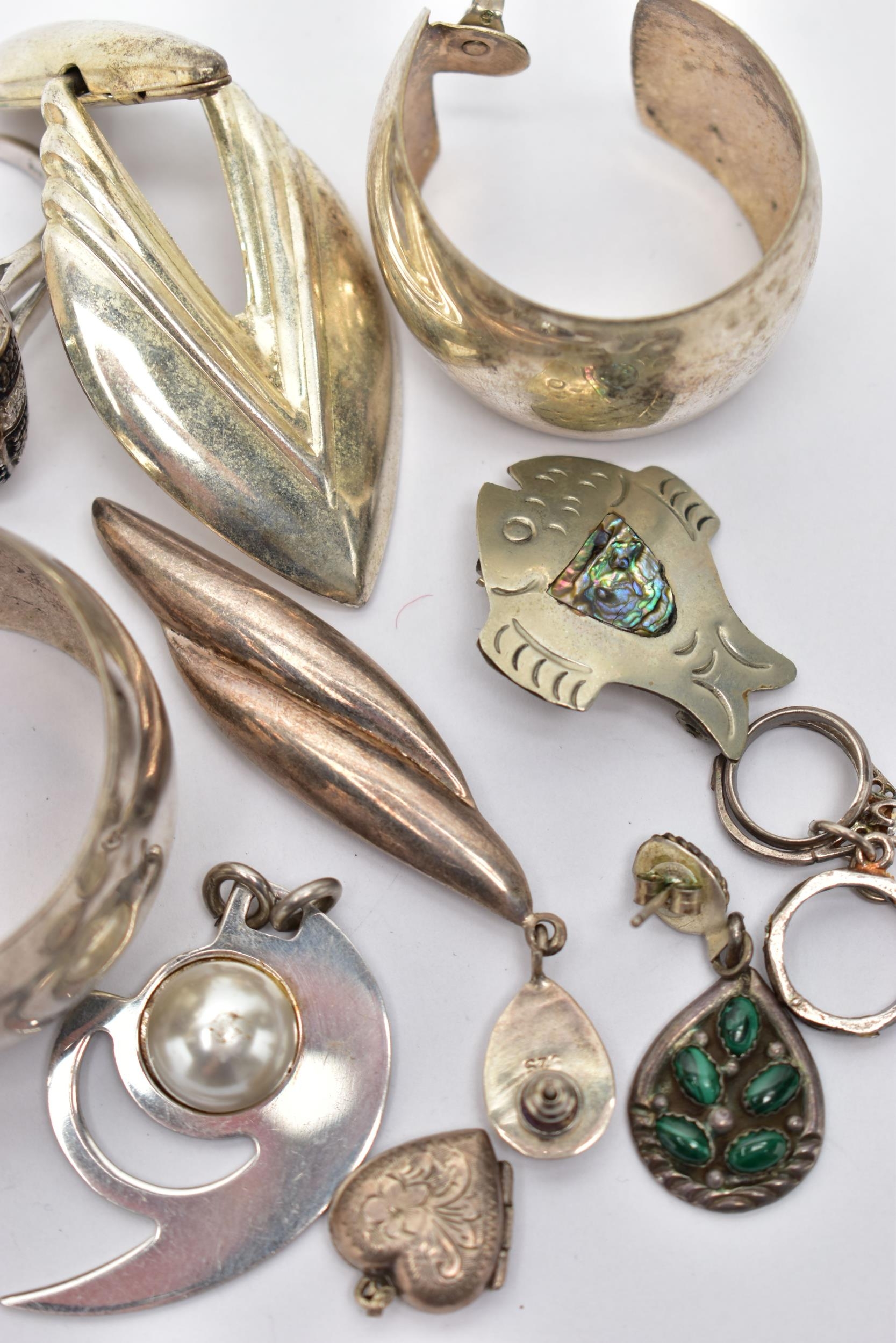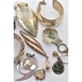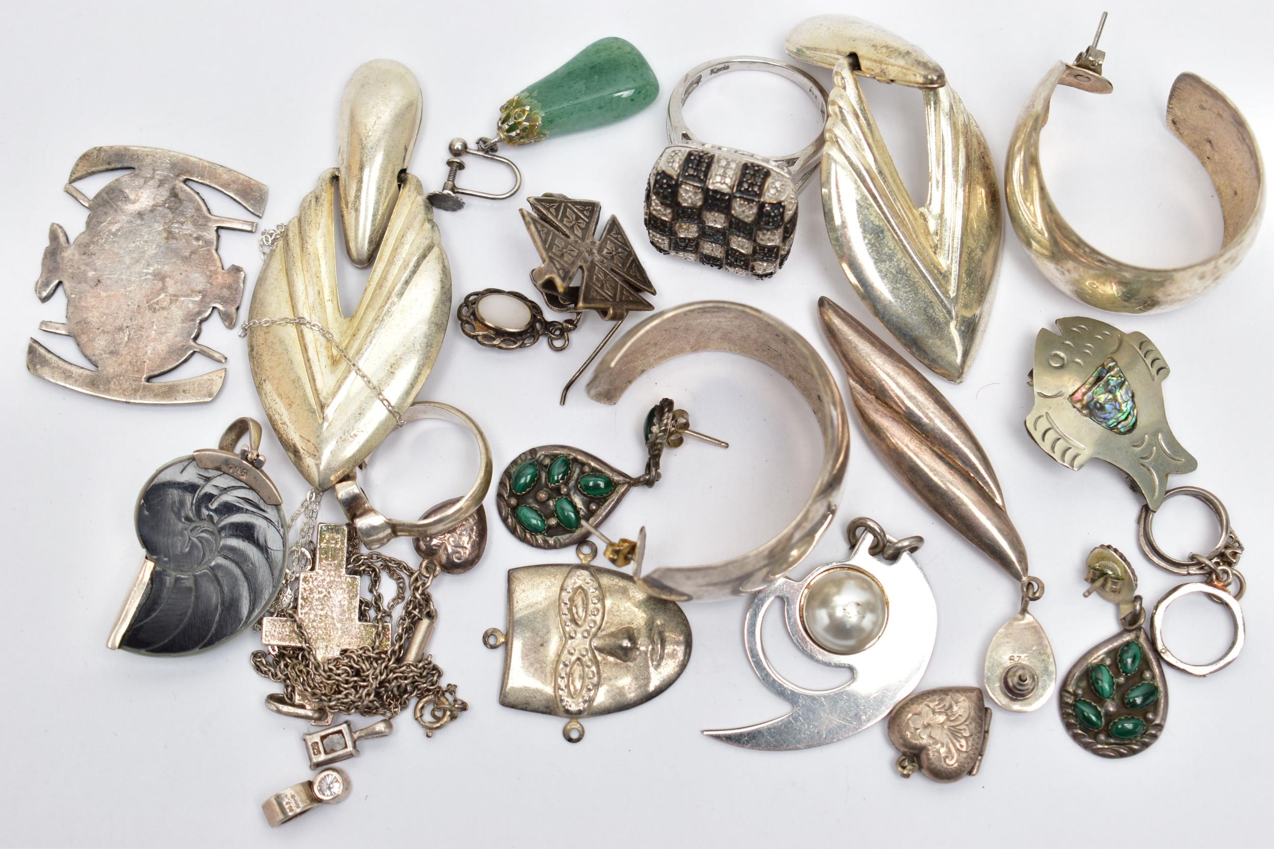 AN ASSORTMENT OF WHITE METAL JEWELLERY, to include a large dress ring with a checker board design, signed 'Karis', ring size V, together with an assortment of earrings and pendants etc, some stamped silver or 925, approximate gross weight 104.2 grams (condition report: general moderate wear, most items require attention)