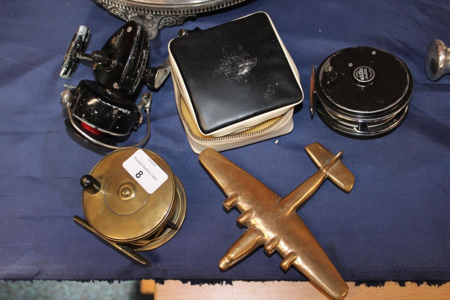 Brass desktop model of an aeroplane, brass fishing reel and two others. (4)