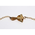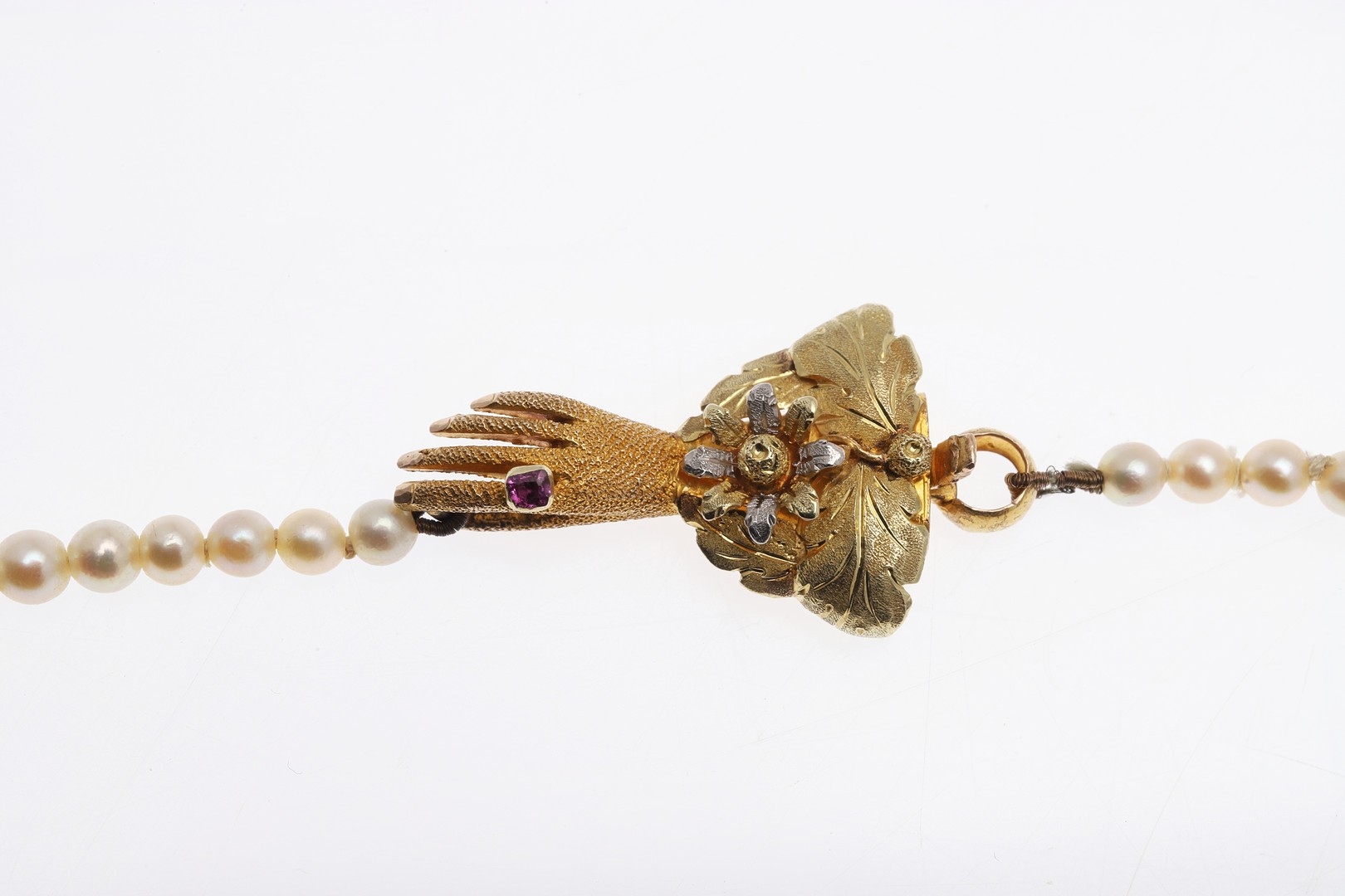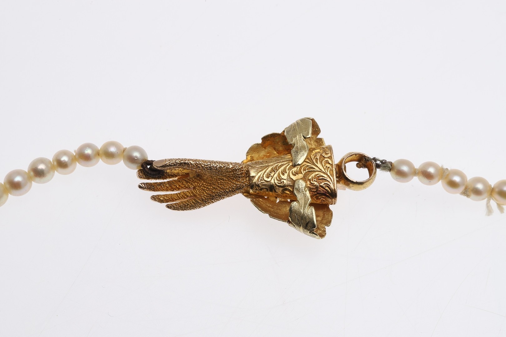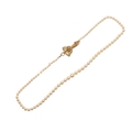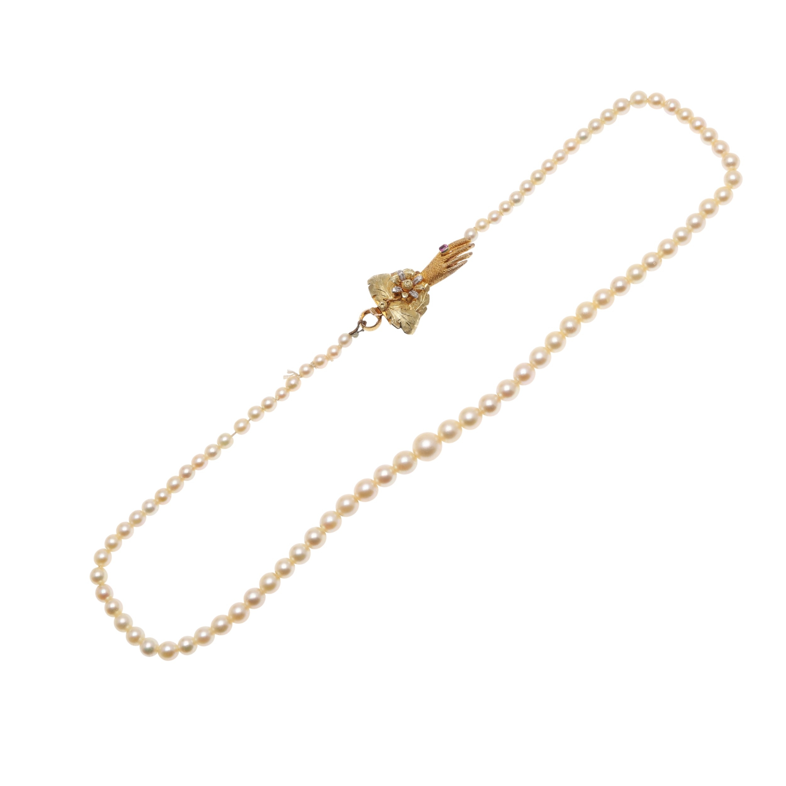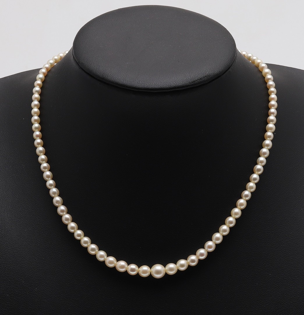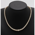 A SINGLE ROW GRADUATED CULTURED PEARL NECKLACE. the pearls graduate from approximately 3.7mm to 7.4mm to a 15ct two colour gold hand clasp, 43cm long, 21.3 grams.