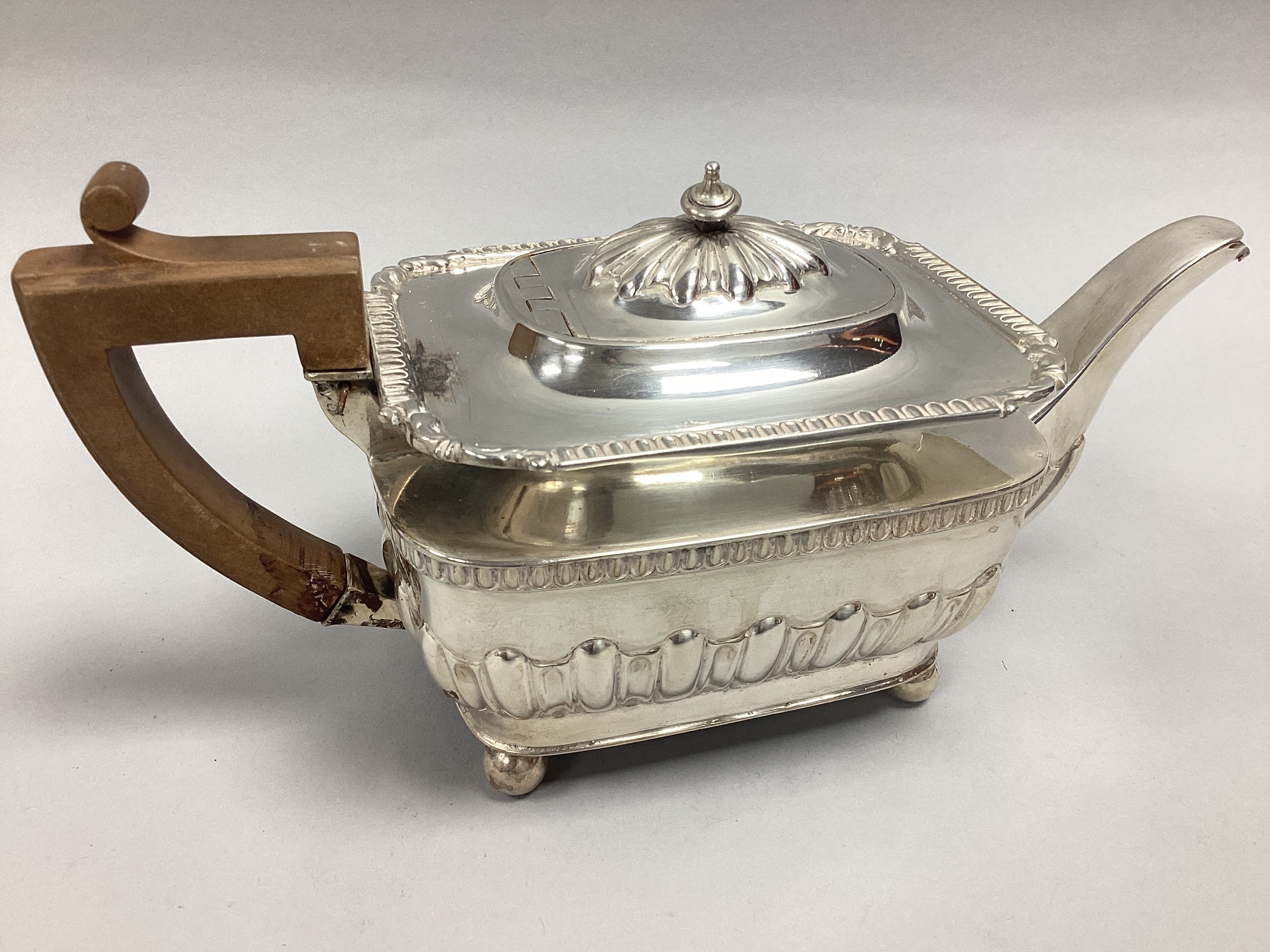 A Decorative Victorian Hallmarked Silver Bachelor's Teapot, Charles Stuart Harris, London 1897, of rectangular semi gadrooned form, on four ball feet (lid finial part missing, handle damaged) (365grams).