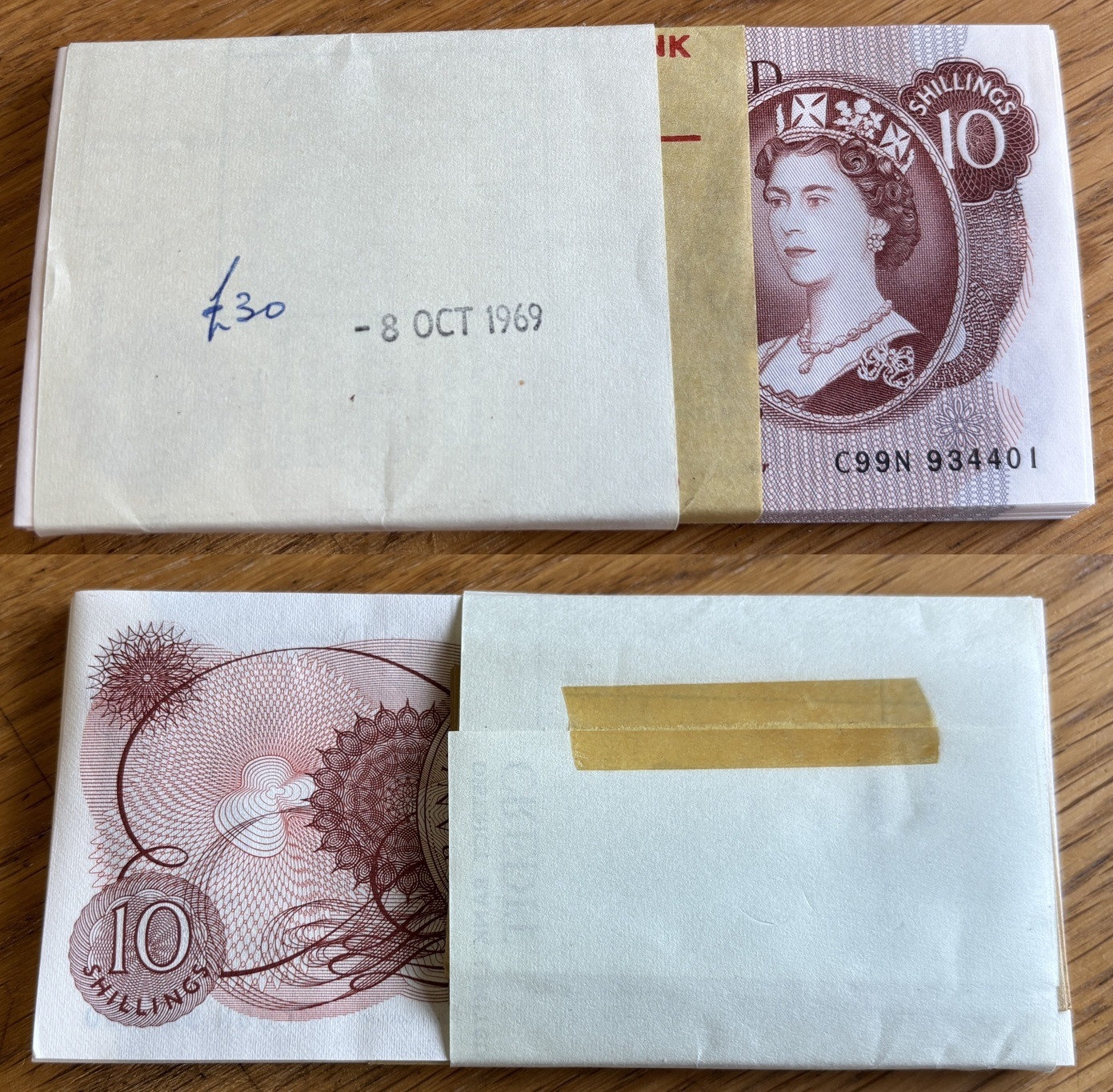 J.S. Forde. Consecutive range of 10/- C99N 934401-60, uncirculated with money band. (N)