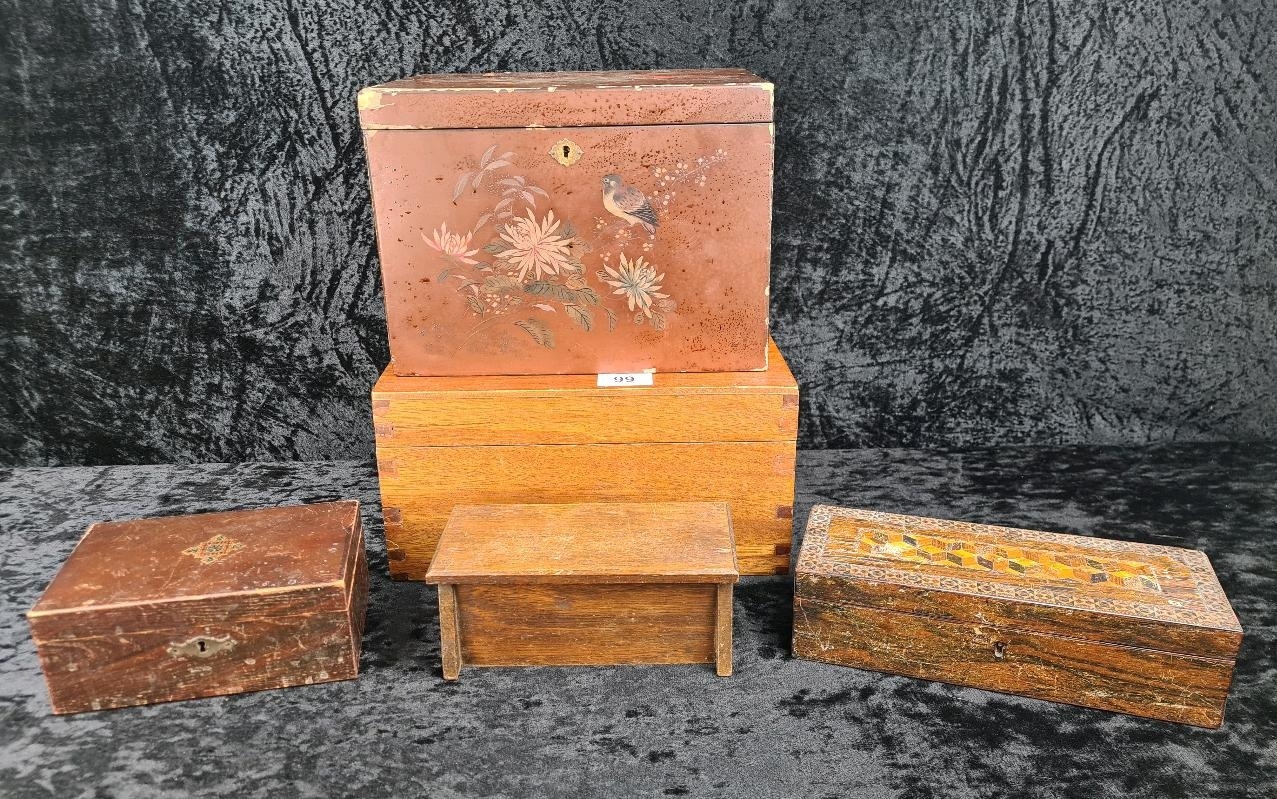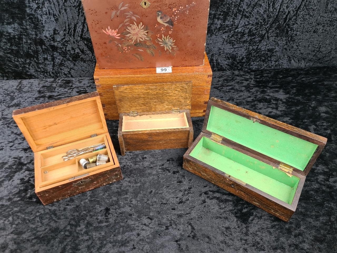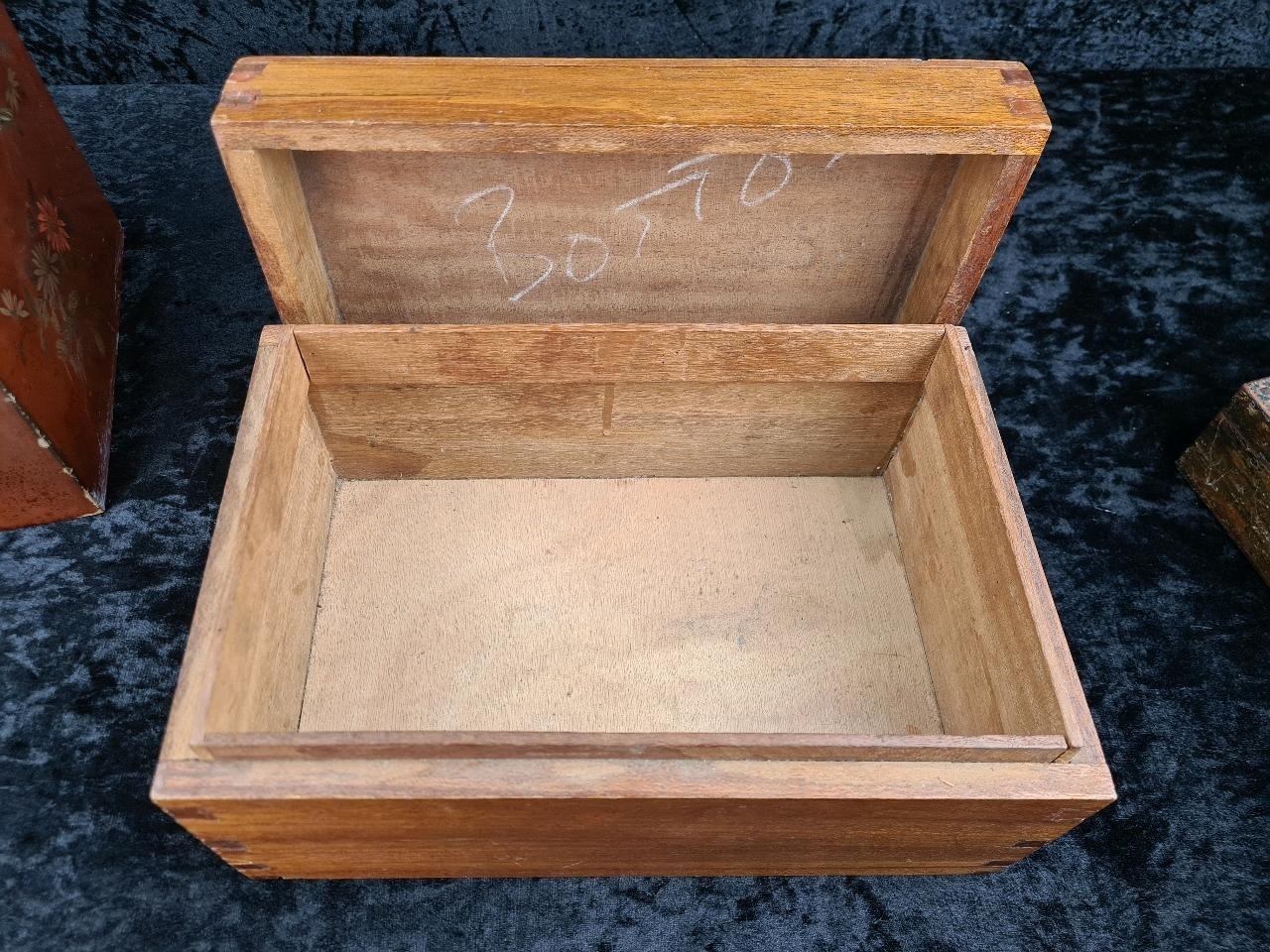 Five vintage wooden boxes - useful for a variety of purposes. Largest approx H15 x W30 X D20cm.