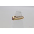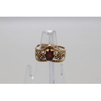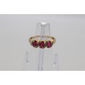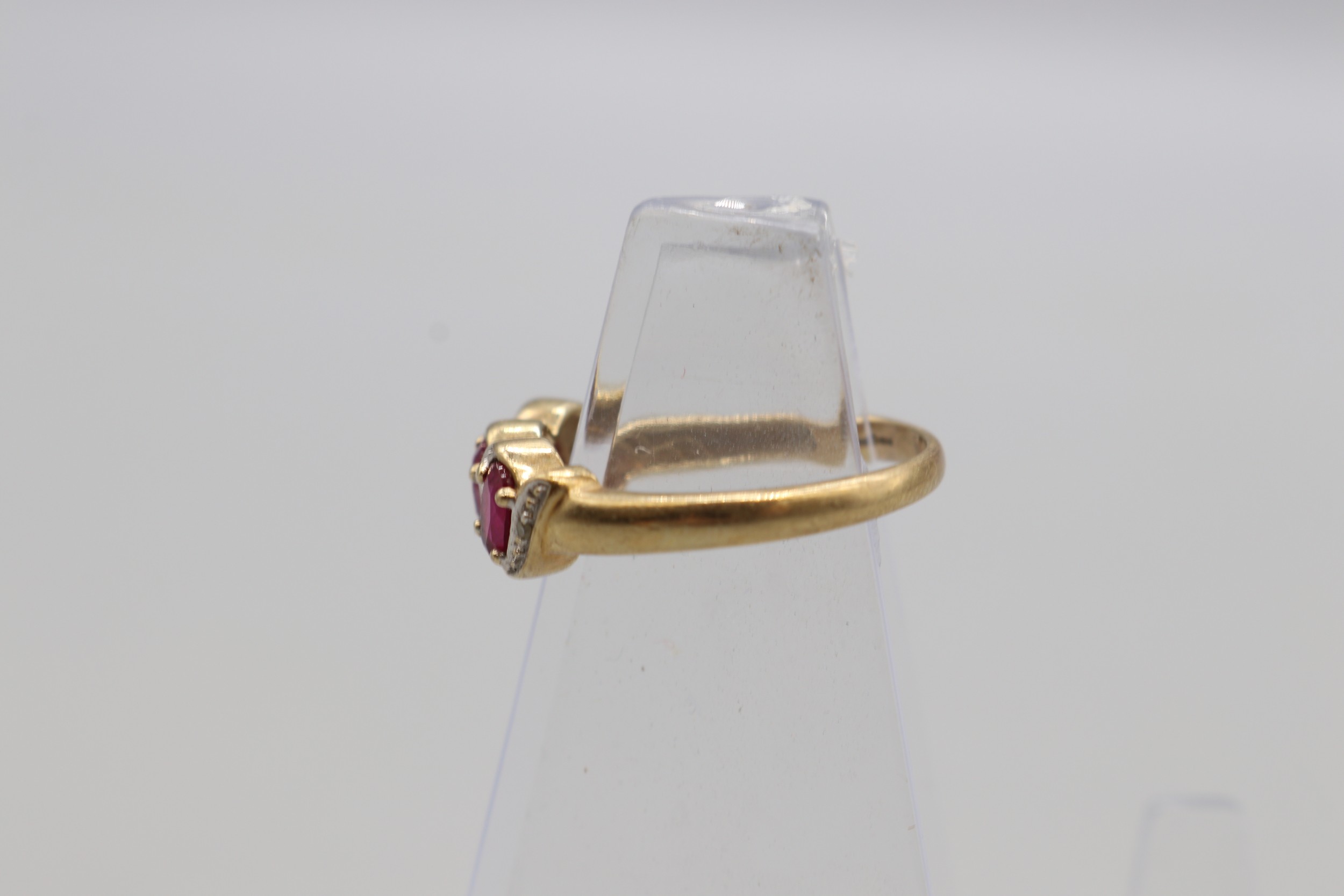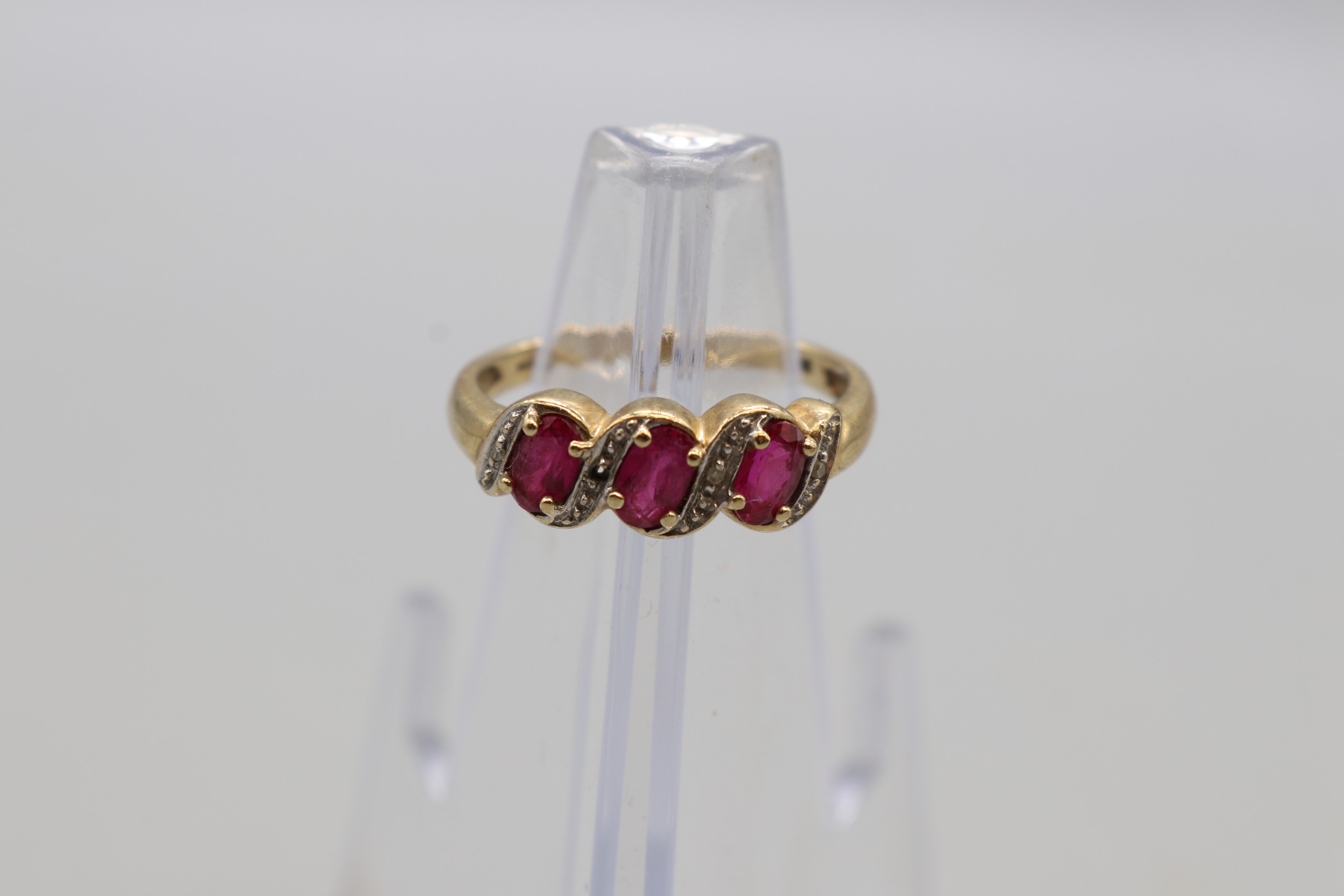 Hallmarked 9ct yellow gold oval ruby three stone ring, weight 2.3g, size P; one diamond missing