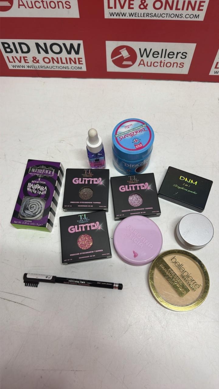 ASSORTED COSMETICS BUNDLE INC GLITTERS /HAIR COLOUR / LINERS/ BROW GEL