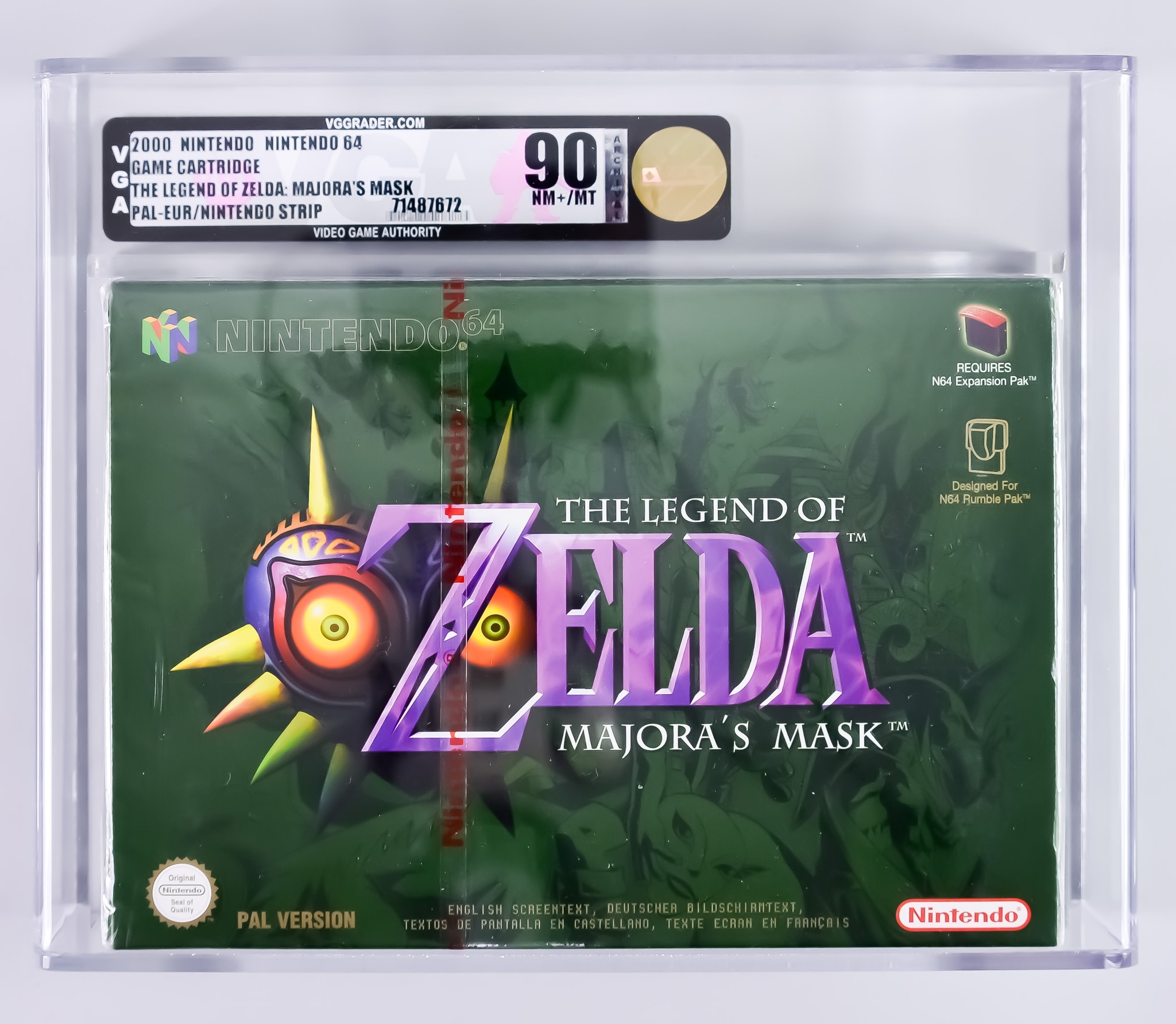 2000 Nintendo N64 – The Legend of Zelda Majora’s Mask – PAL/European Version Red Label Game VGA 90/NM+/MT, with the iconic Nintendo red strip seal and in rigid Perspex case supplied by VGA at the time of grading