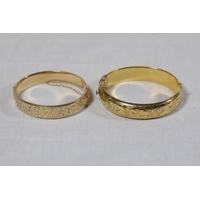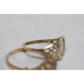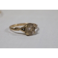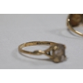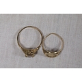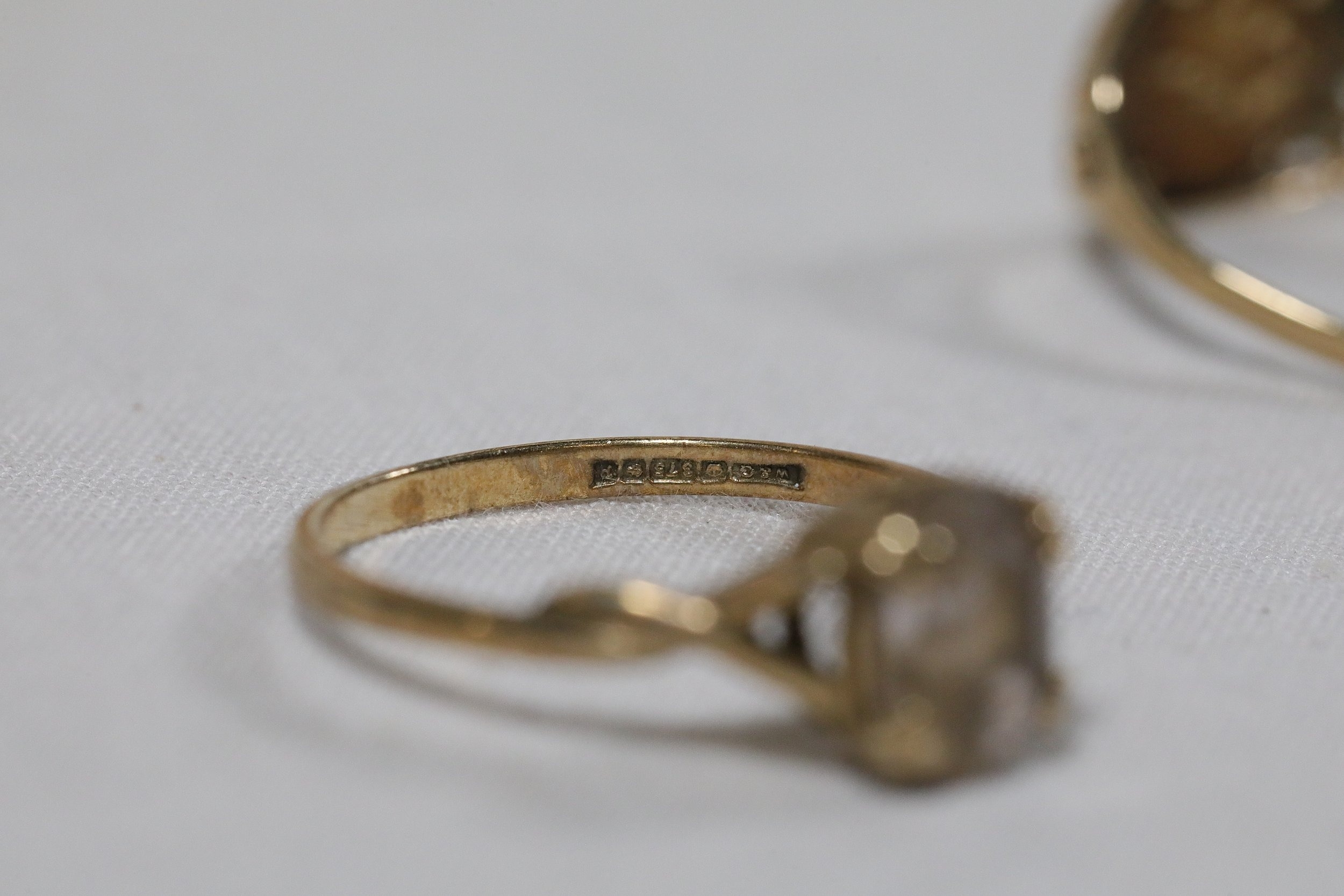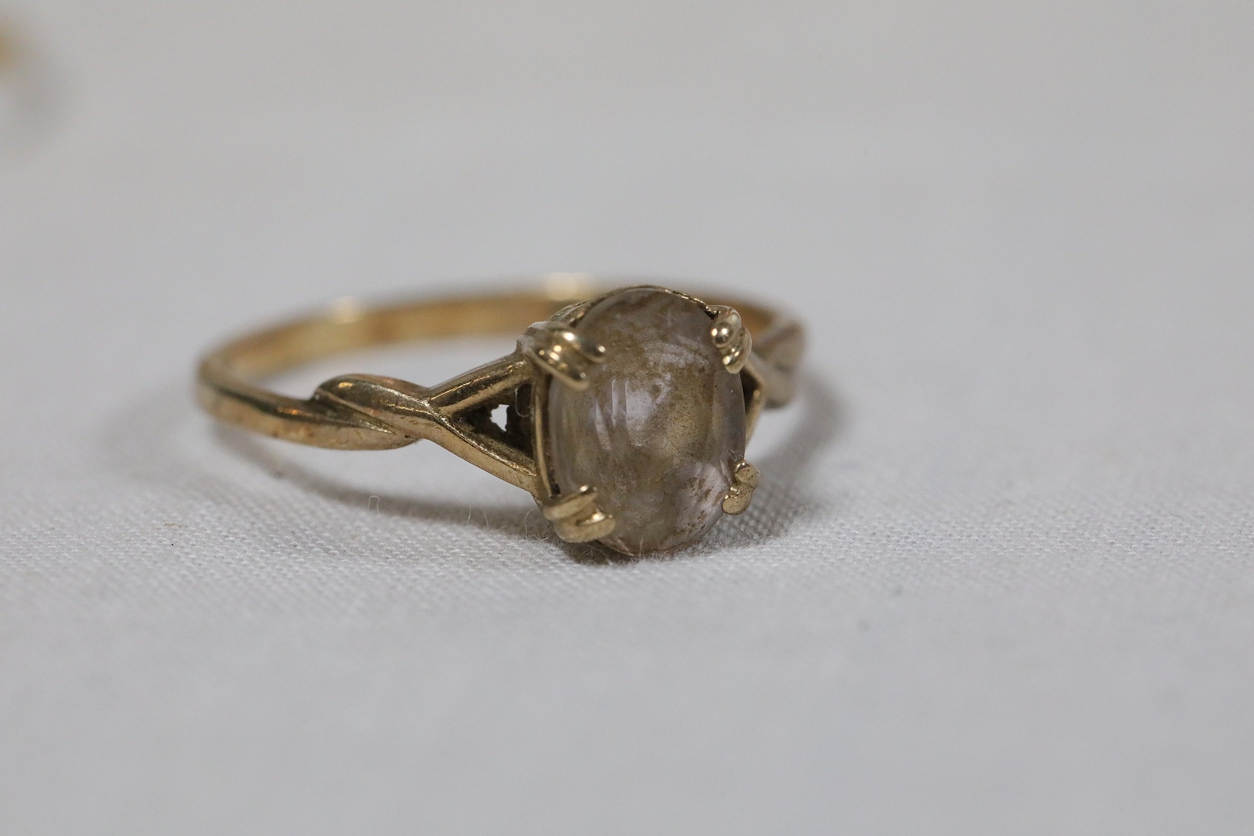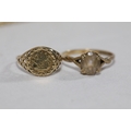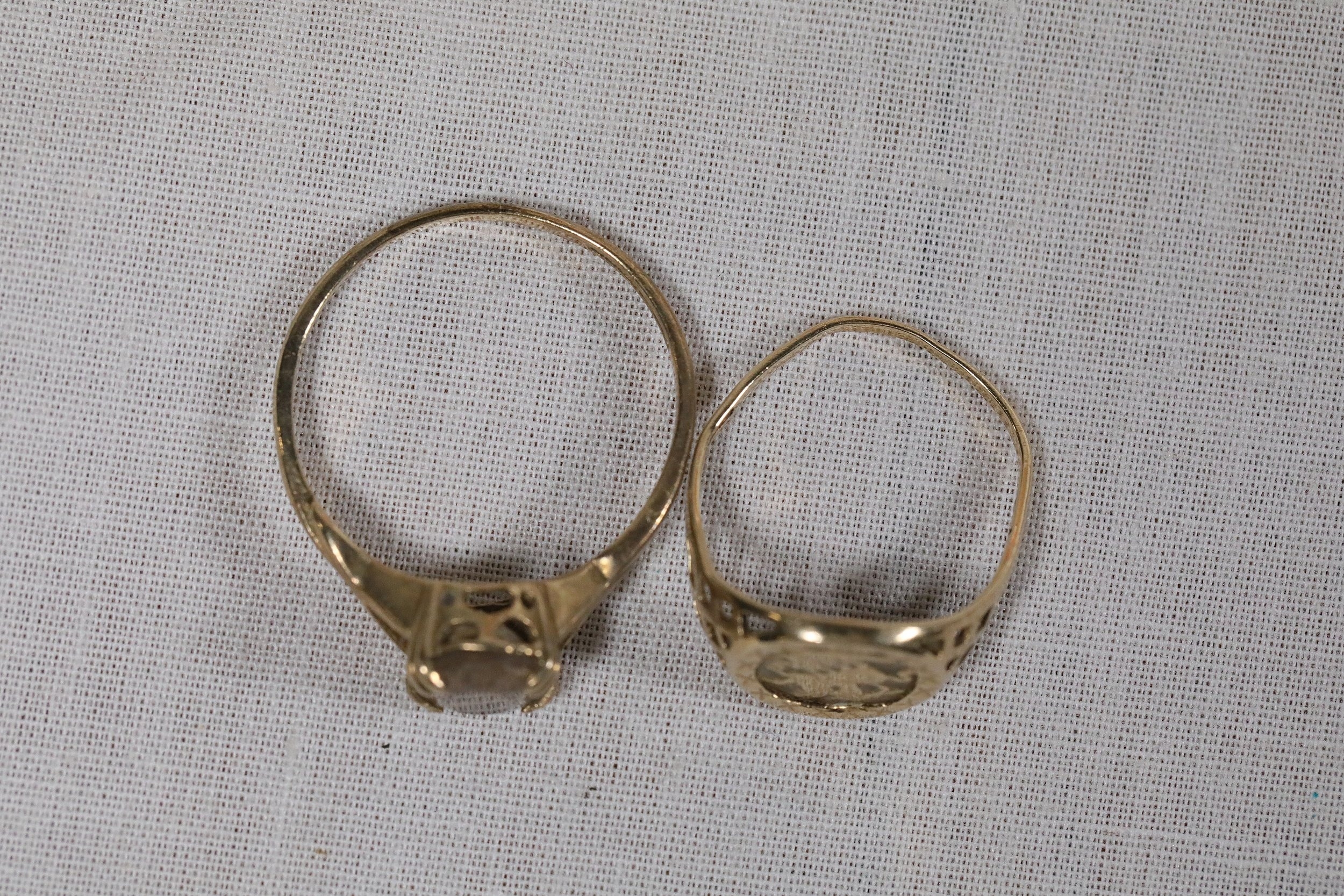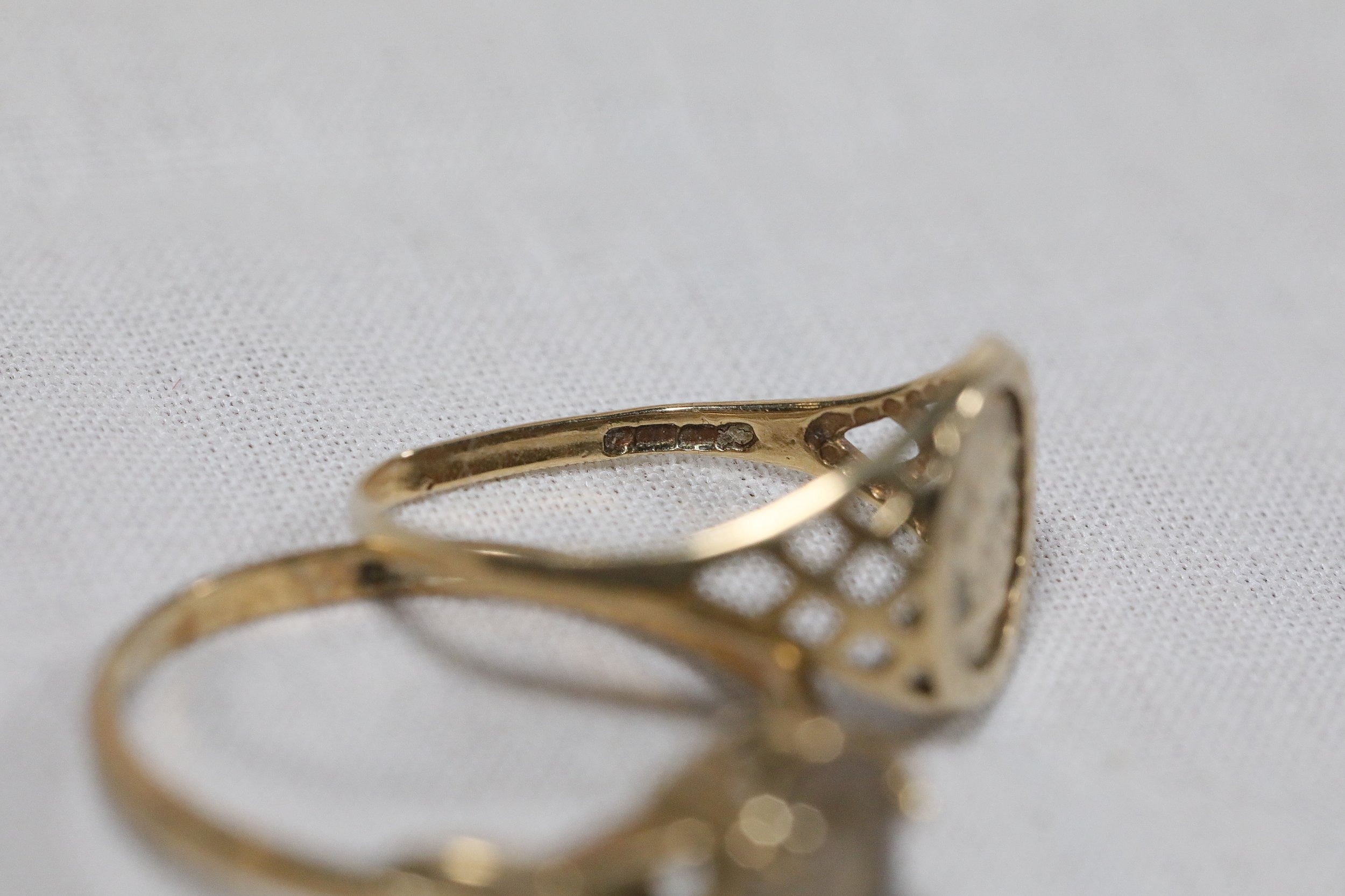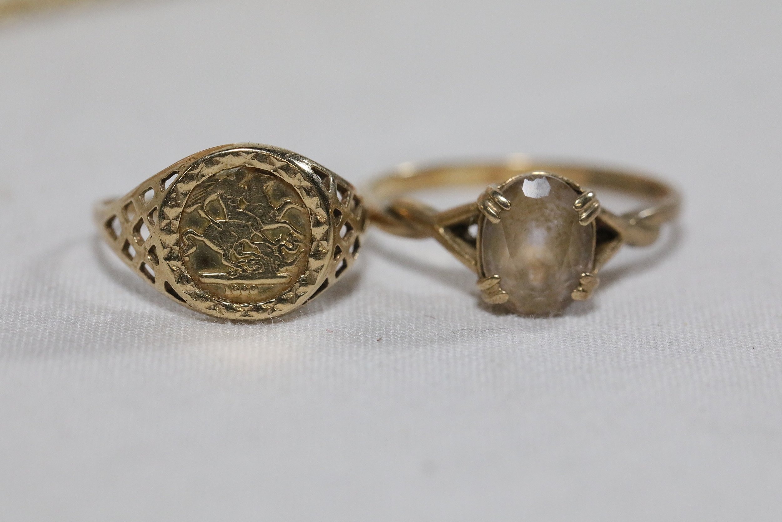- Two yellow gold rings, one hallmarked with lattice shoulders and a circular bezel depicting St George and the Dragon dated 1966, the other set with an oval cabochon gemstone in a claw setting with openwork band