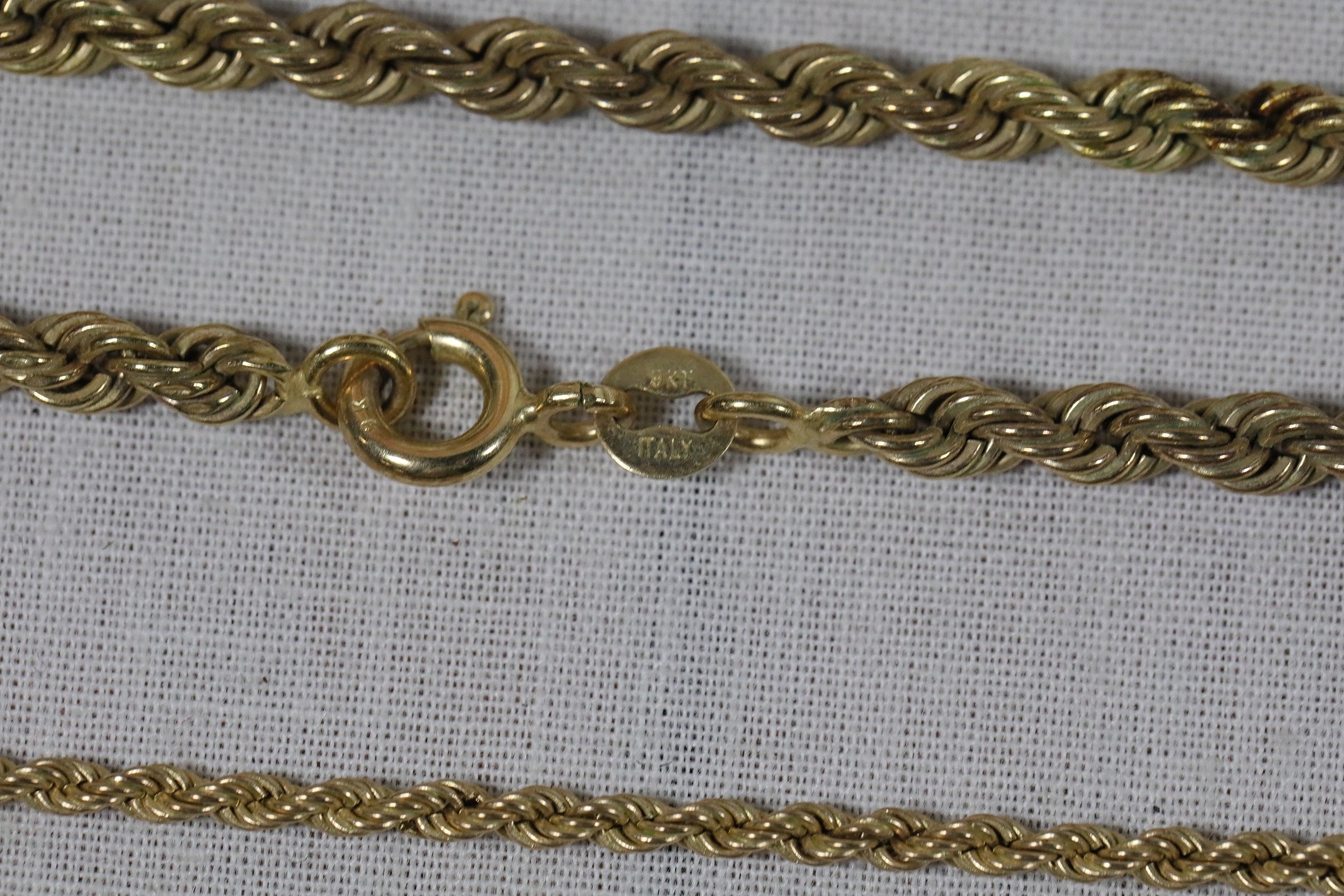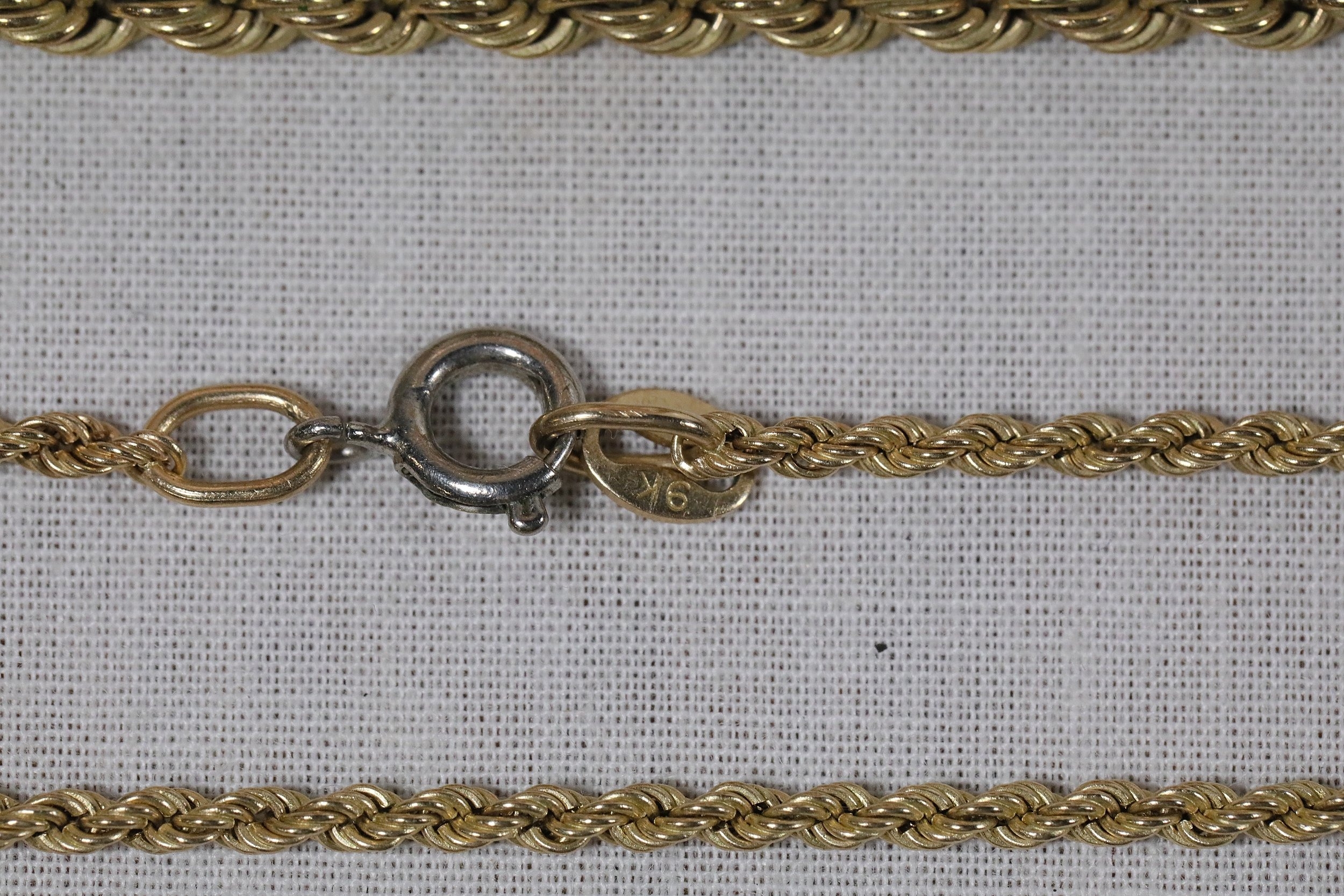 - Italian 9K rope chain stamped 9K Italy with lobster clasp and circular end tag