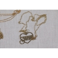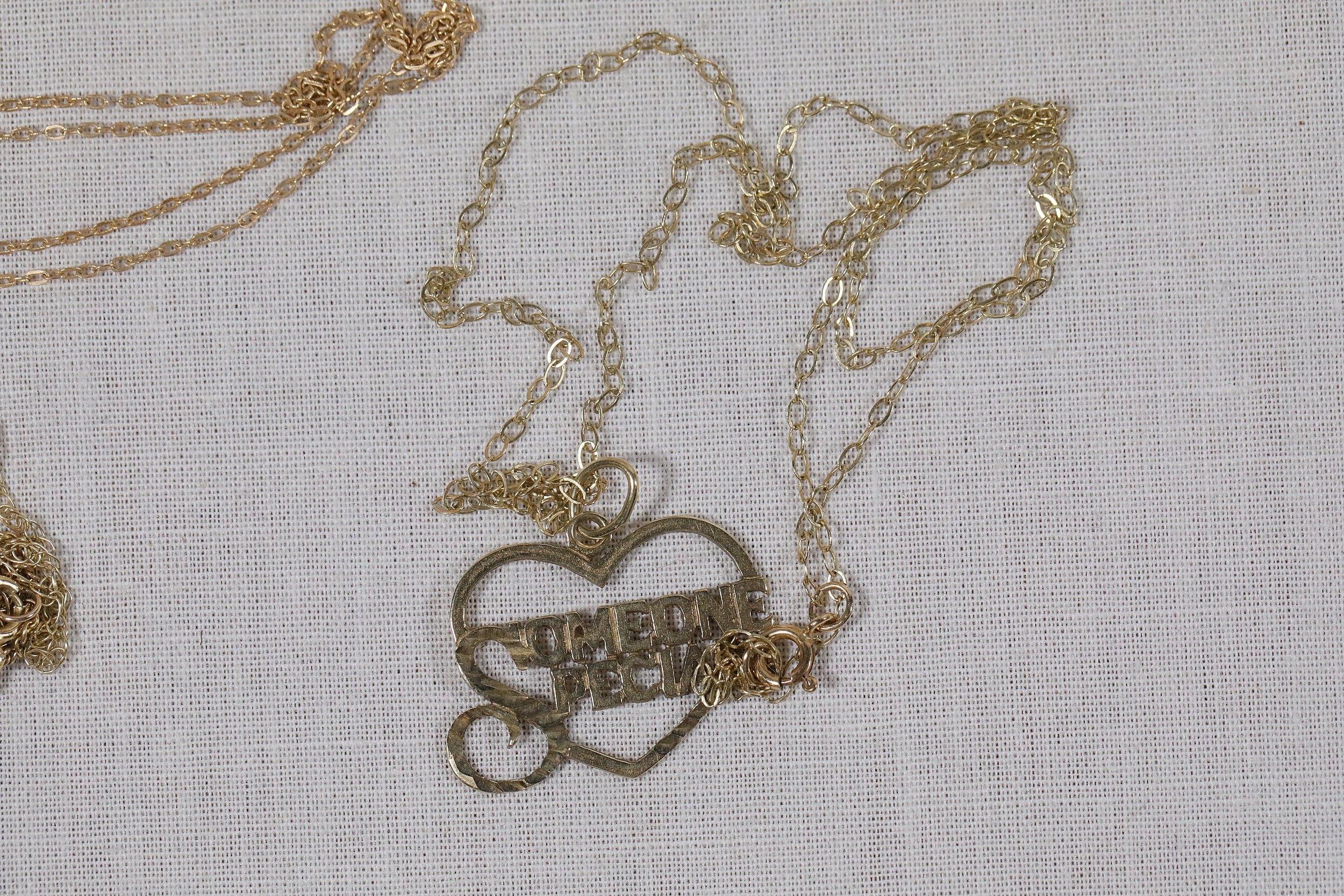 - Assorted pendants including a triangular engraved drop with fan and rose motif, an open heart pendant reading LOVE, a heart pendant inscribed Someone Special, and a filigree Forget Me Not charm