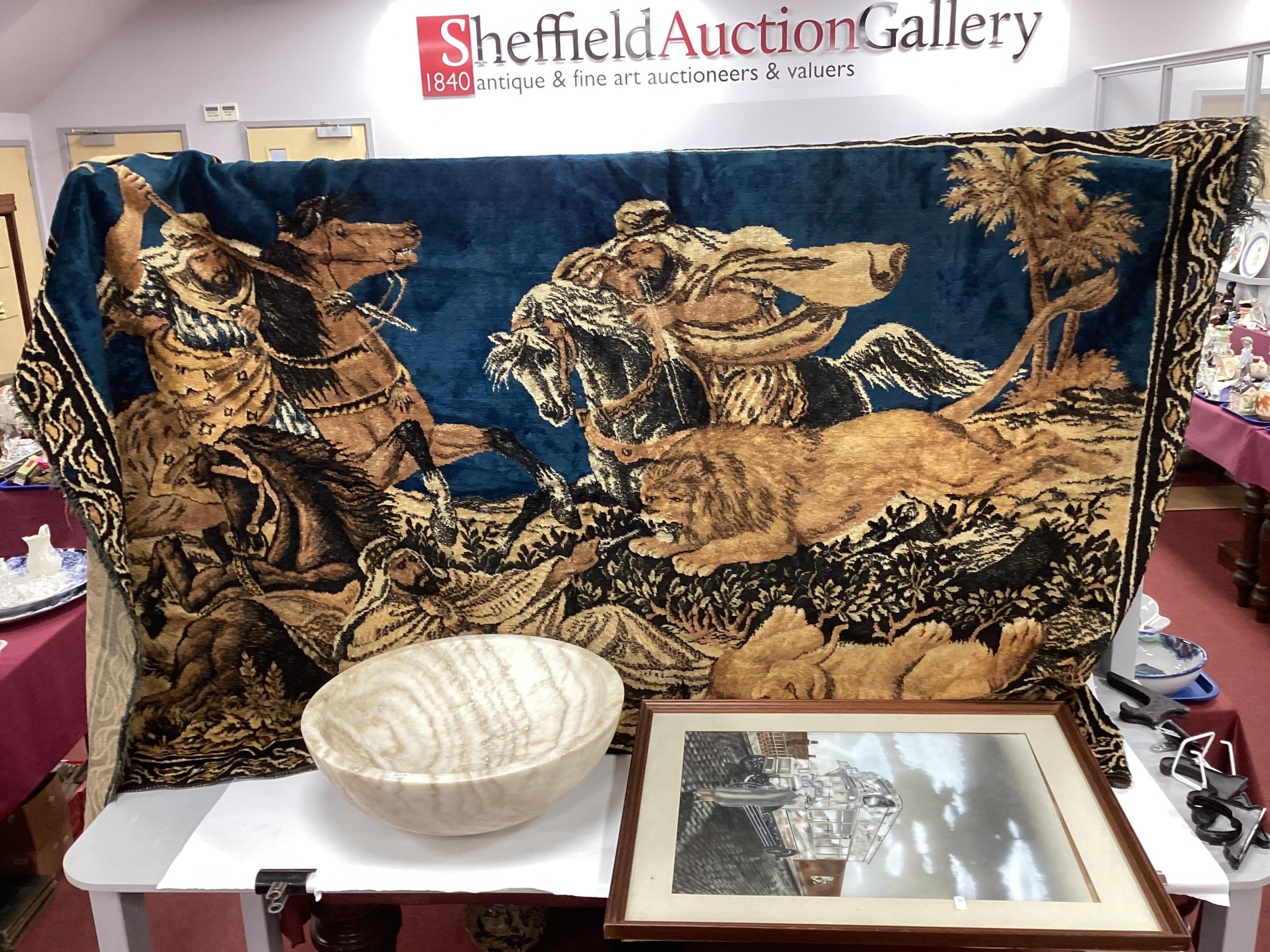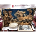 Wall Tapestry - Big Cats Battling With Hunstman on Horseback 122 x 180cm with suspension rails, marble bowl 45cm diameter, Peckham / Rye bus with figure in front, watercolour 51 x 38.5cm.