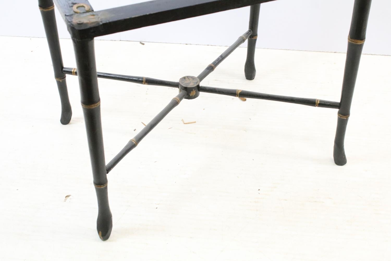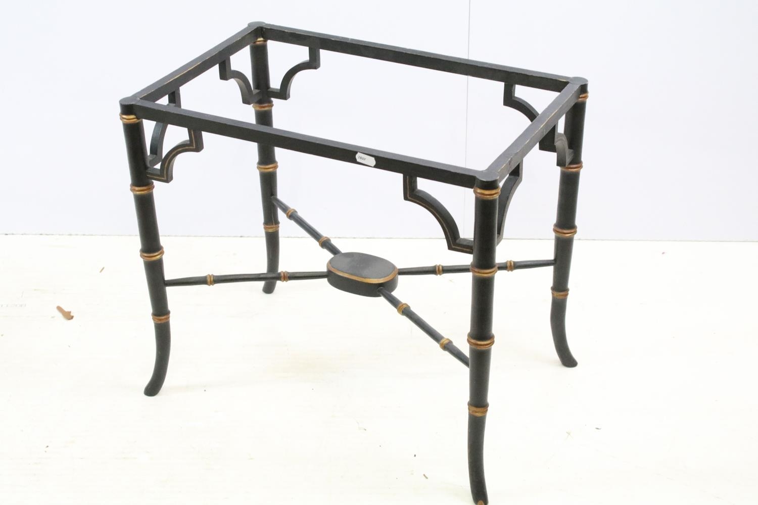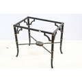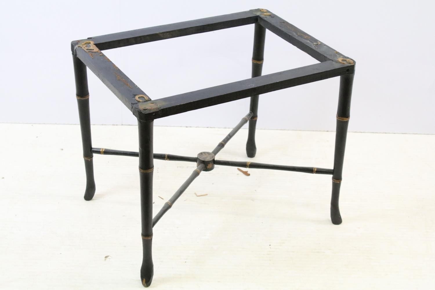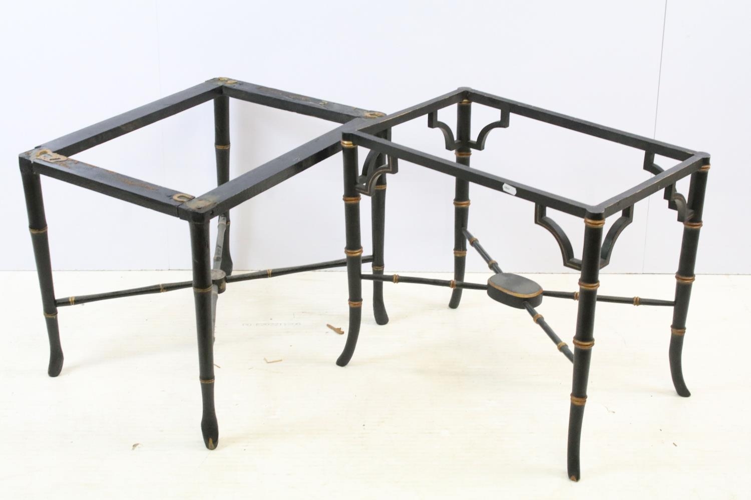 Aesthetic style japanned table base, the legs and x-framed supports carved to simulate bamboo, 46cm high x 53.5cm wide x 34cm deep, together with another similar, 44cm high x 53cm wide x 41cm deep