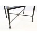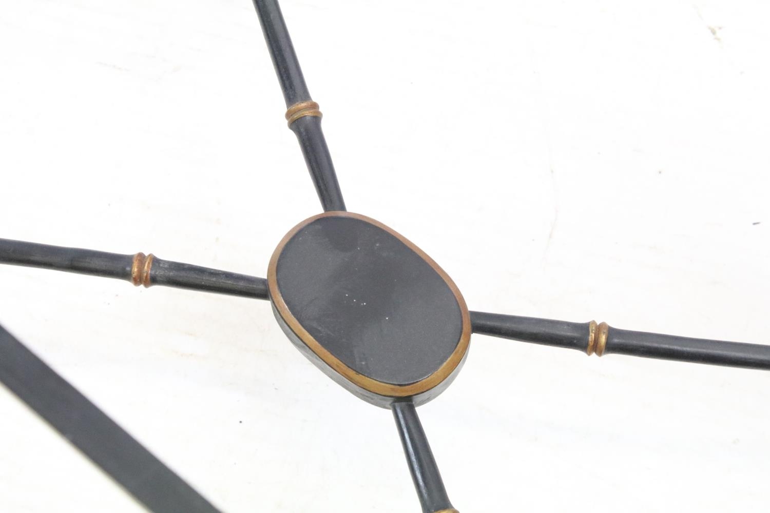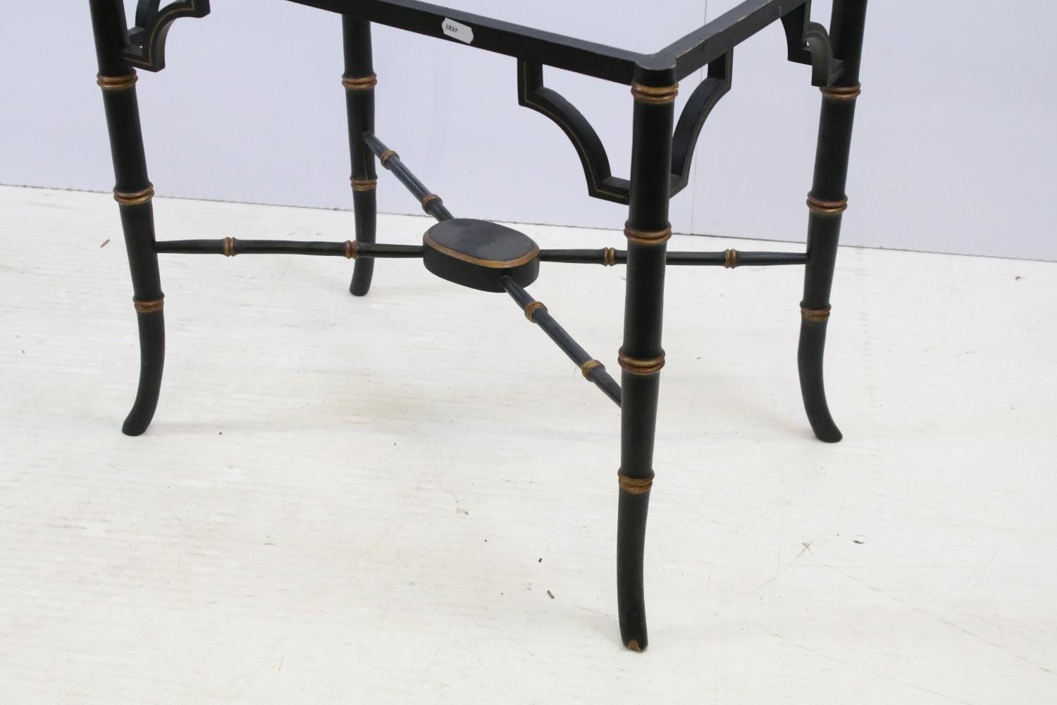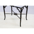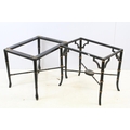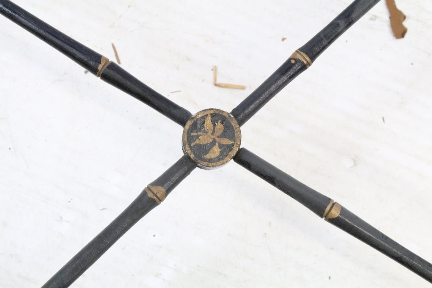 Aesthetic style japanned table base, the legs and x-framed supports carved to simulate bamboo, 46cm high x 53.5cm wide x 34cm deep, together with another similar, 44cm high x 53cm wide x 41cm deep