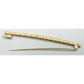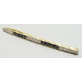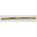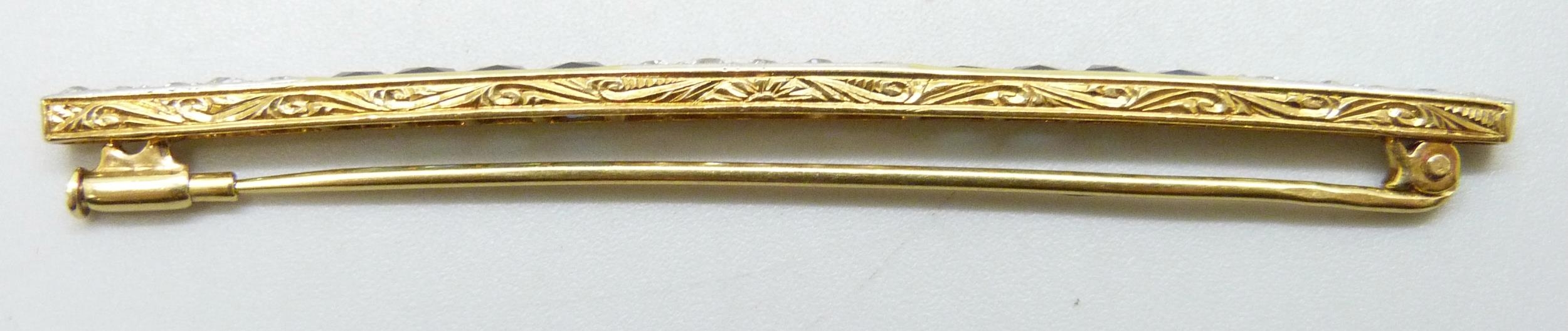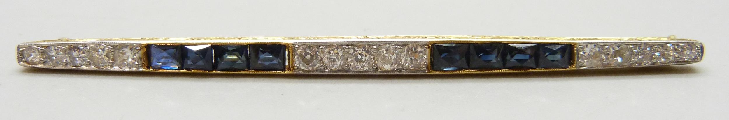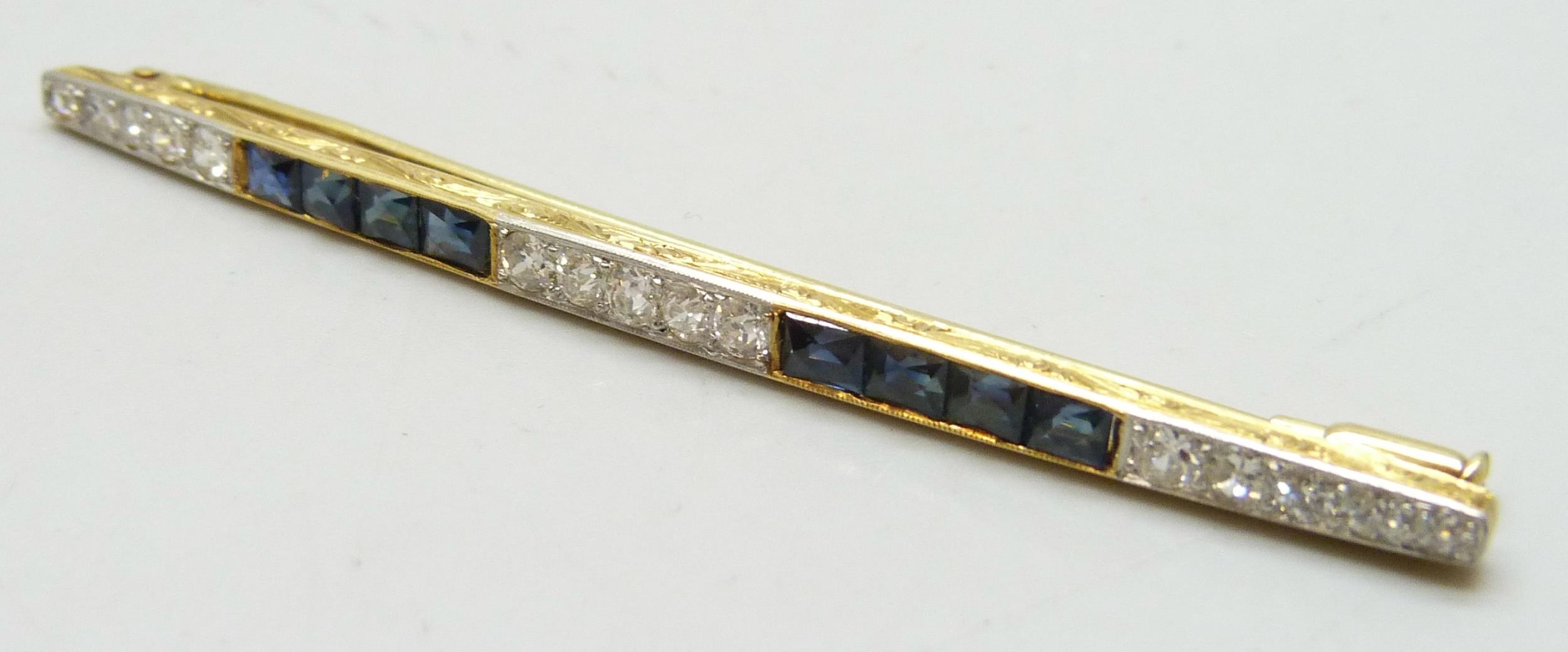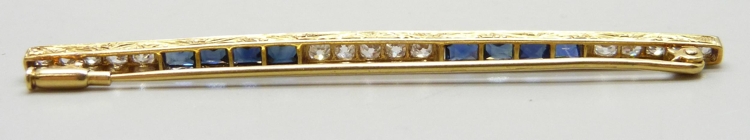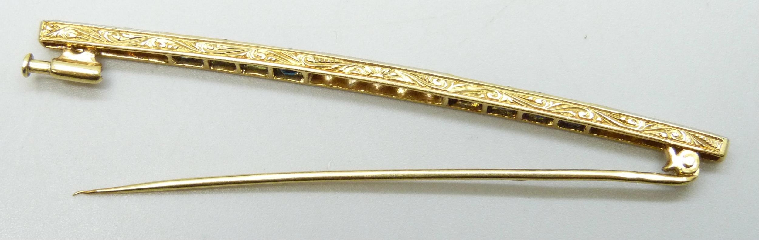 A yellow metal Art Deco bar brooch set with sapphires and diamonds, foreign control mark and 730 mark, 5.2g, 7.1cm