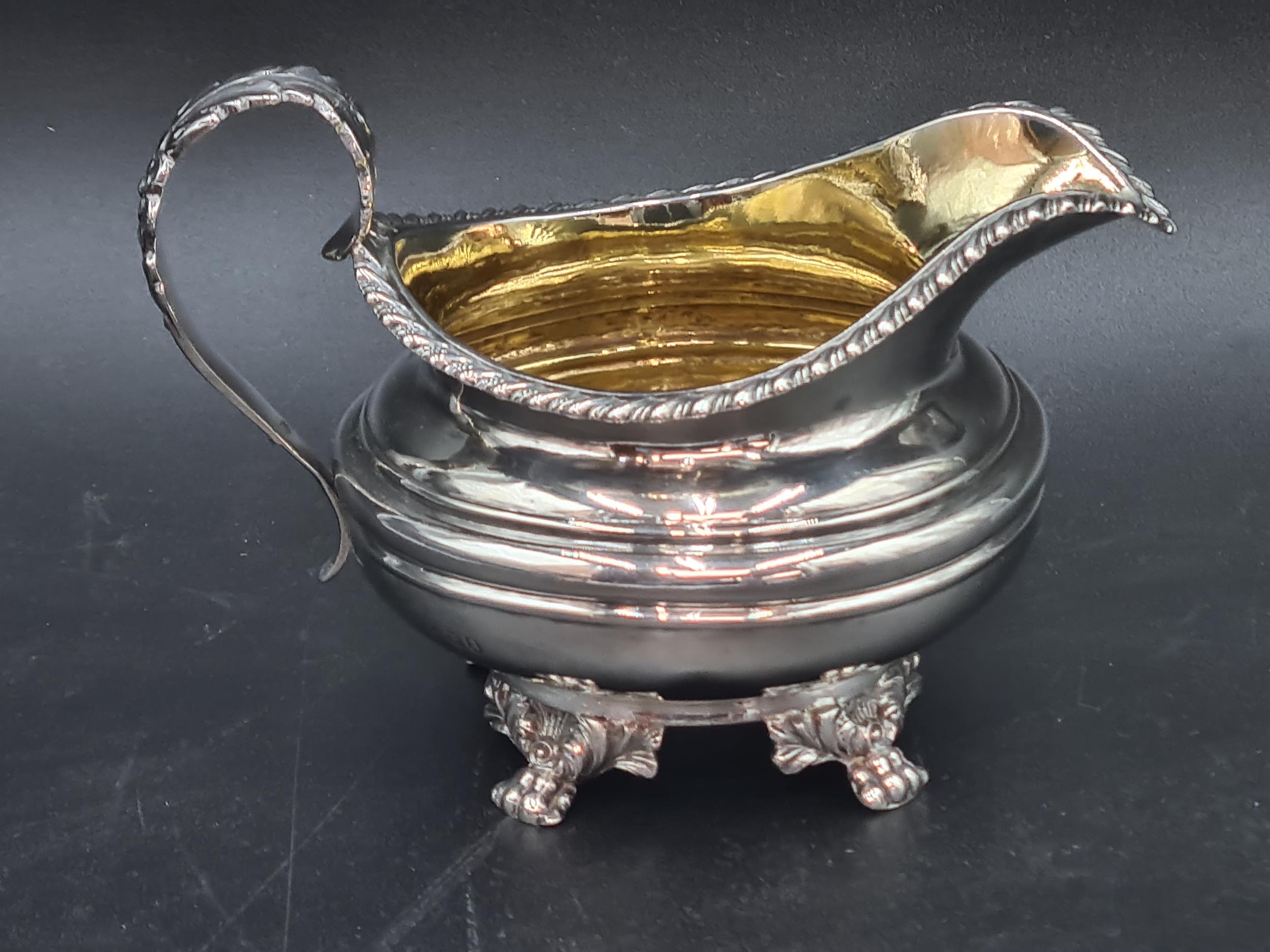 A William IV silver circular Milk Jug with gadroon rim, leafage scroll handle on paw feet, London 1830, 210gms