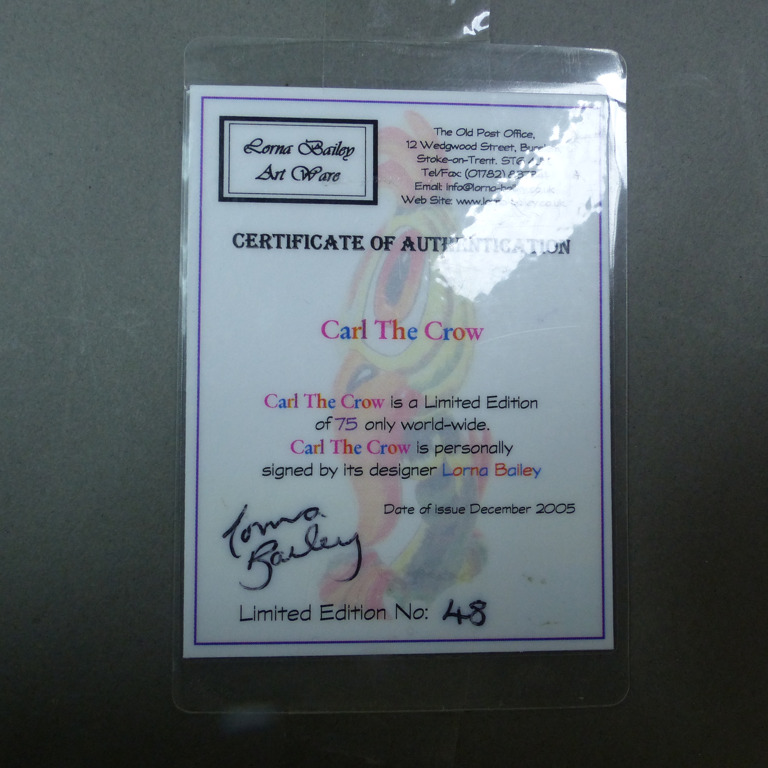 Lorna Bailey 'Carl the Crow' limited edition of 75, this No. 48. Signed to the underside. With COA, height 31cm.